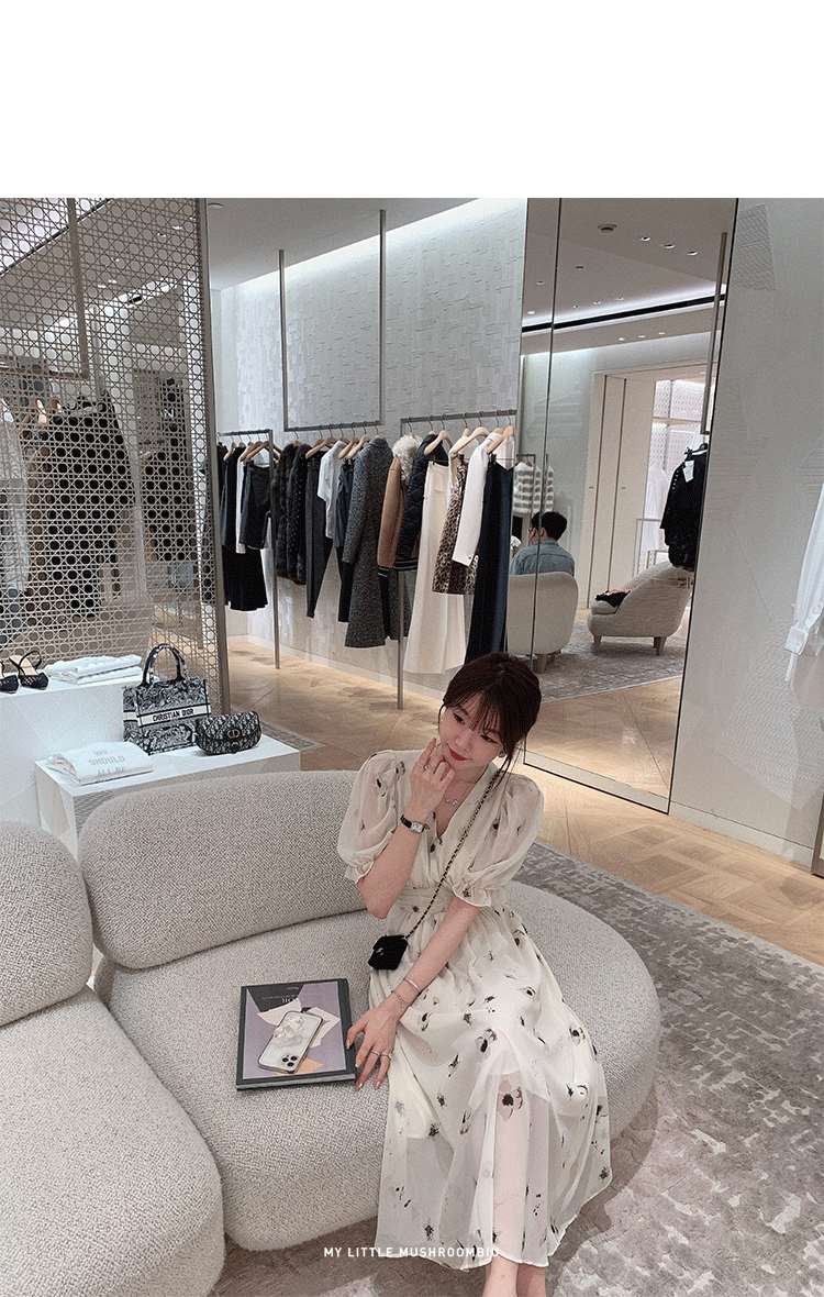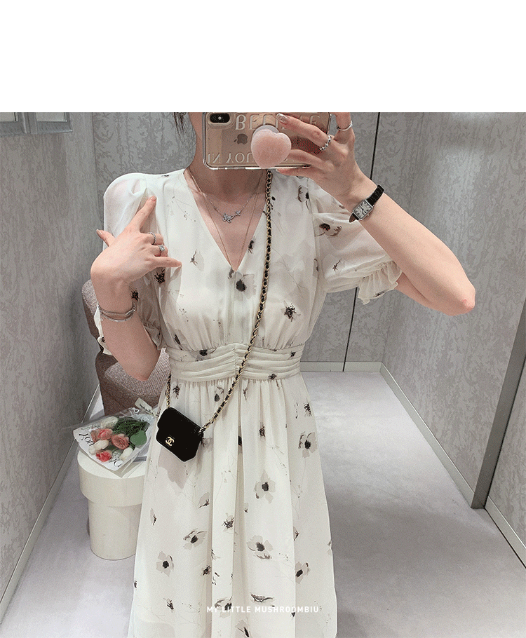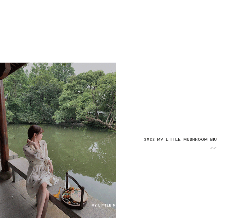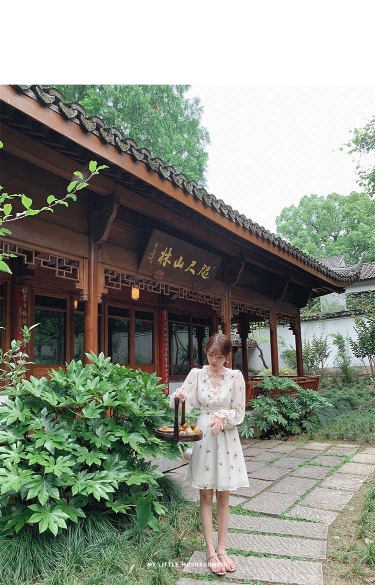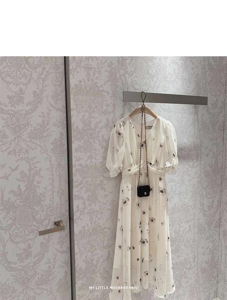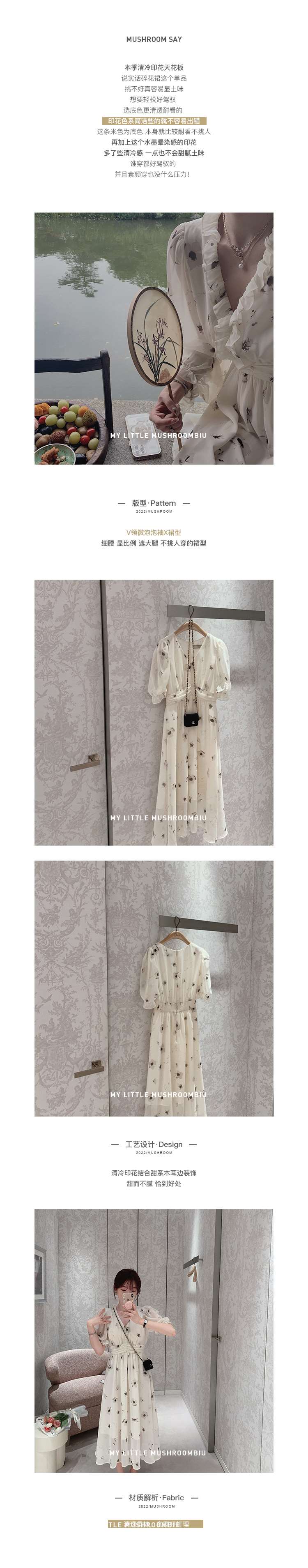 金蘑菇菇【水墨丹青】 夏日清冷感V领设计感收腰显瘦连衣裙