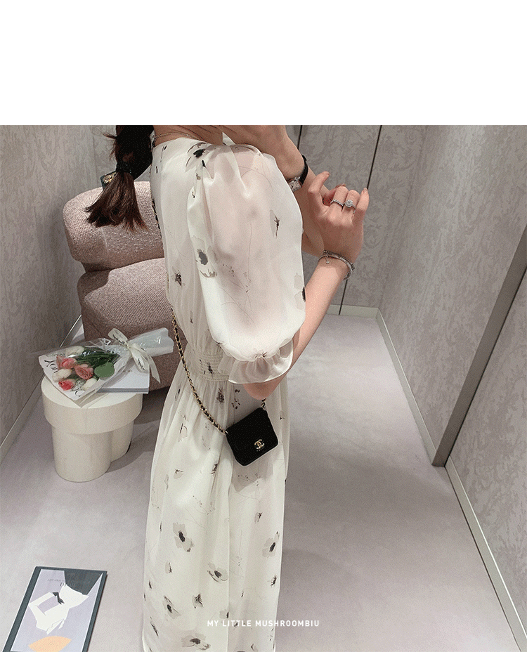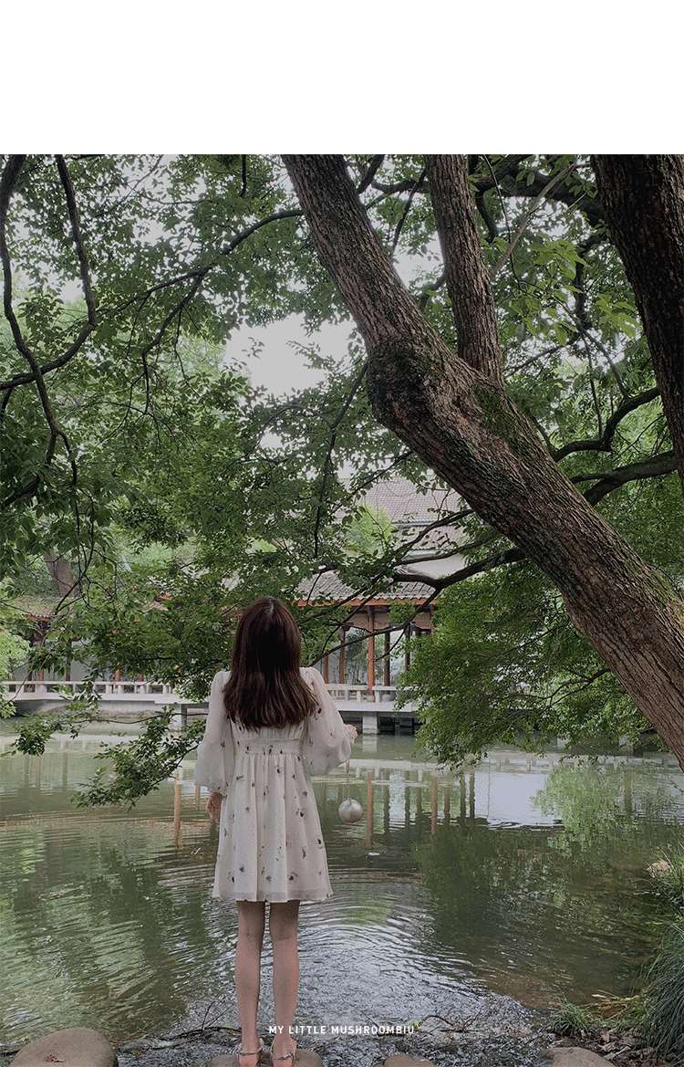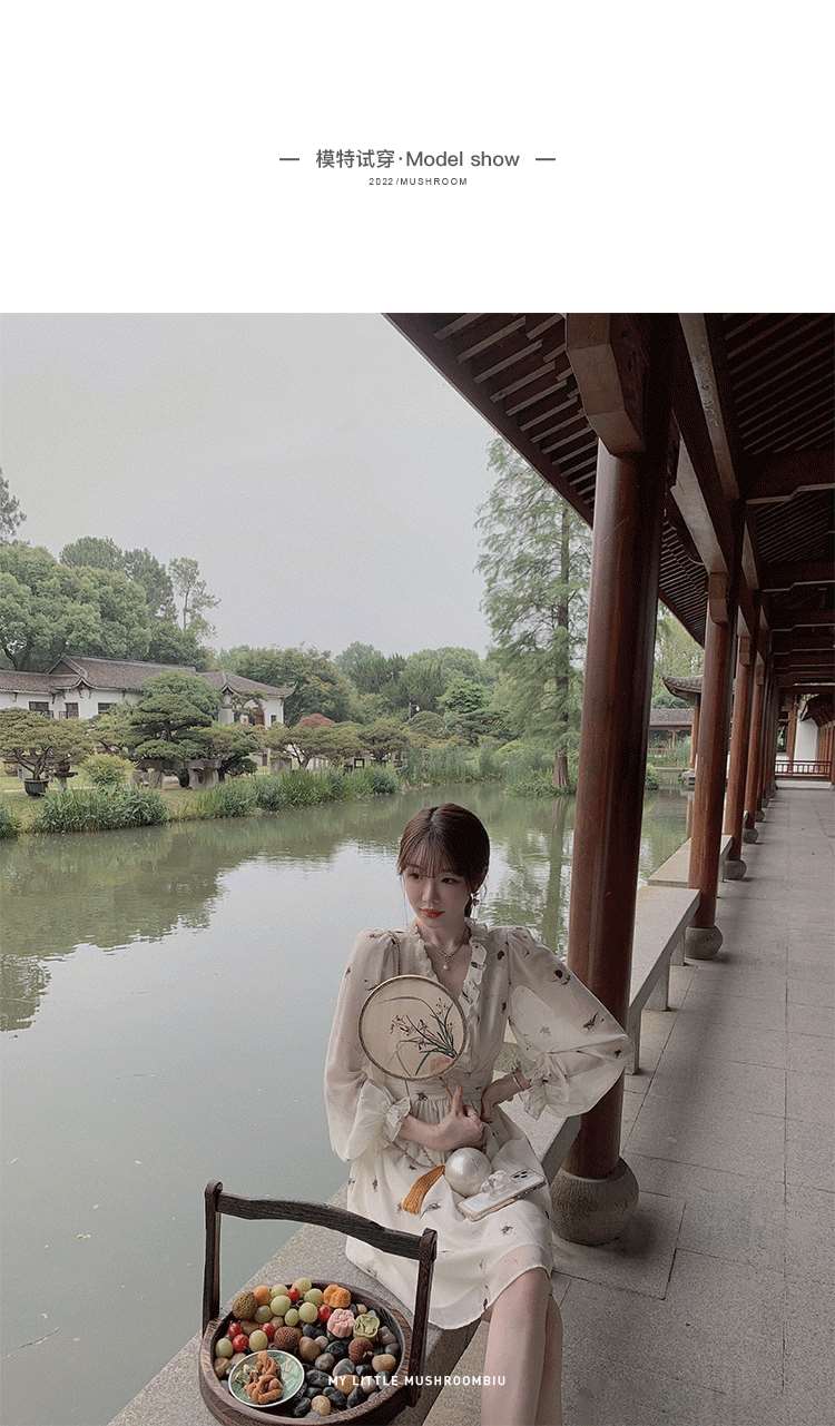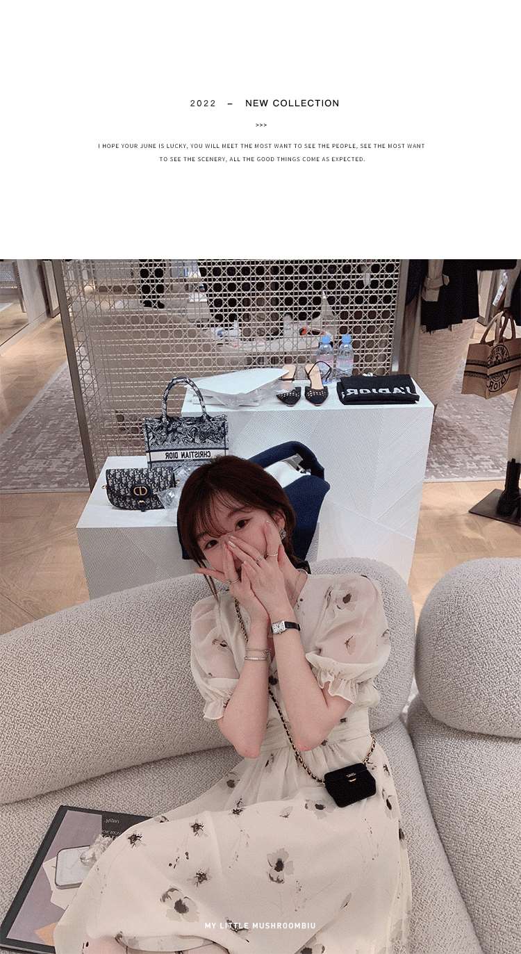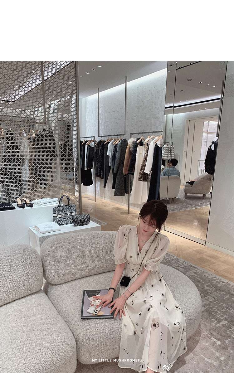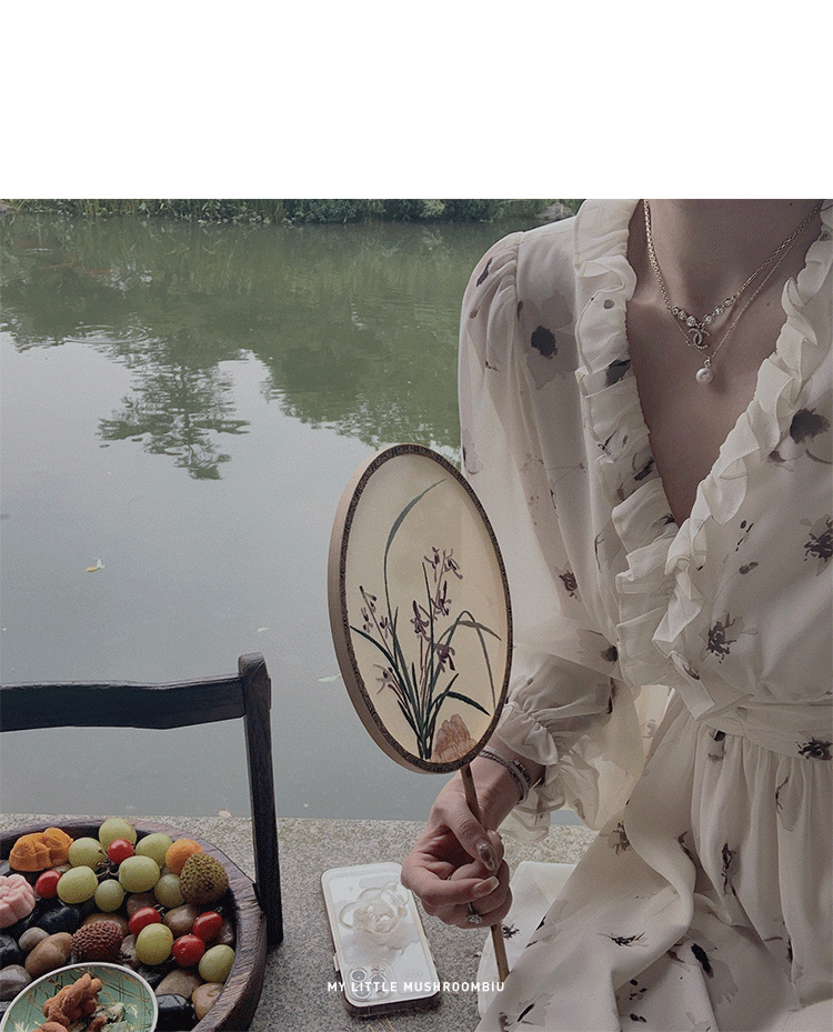 金蘑菇菇【水墨丹青】 夏日清冷感V领设计感收腰显瘦连衣裙