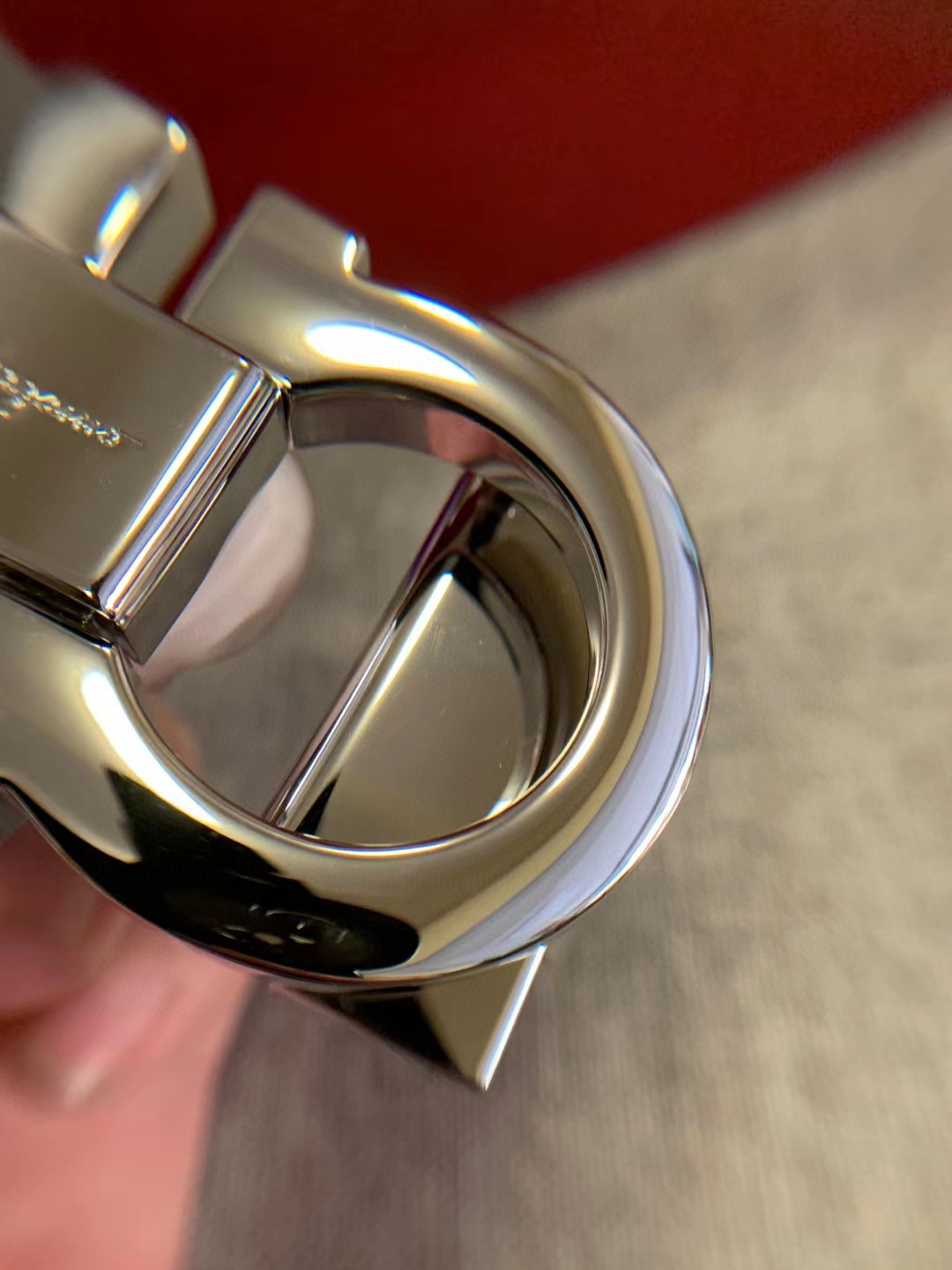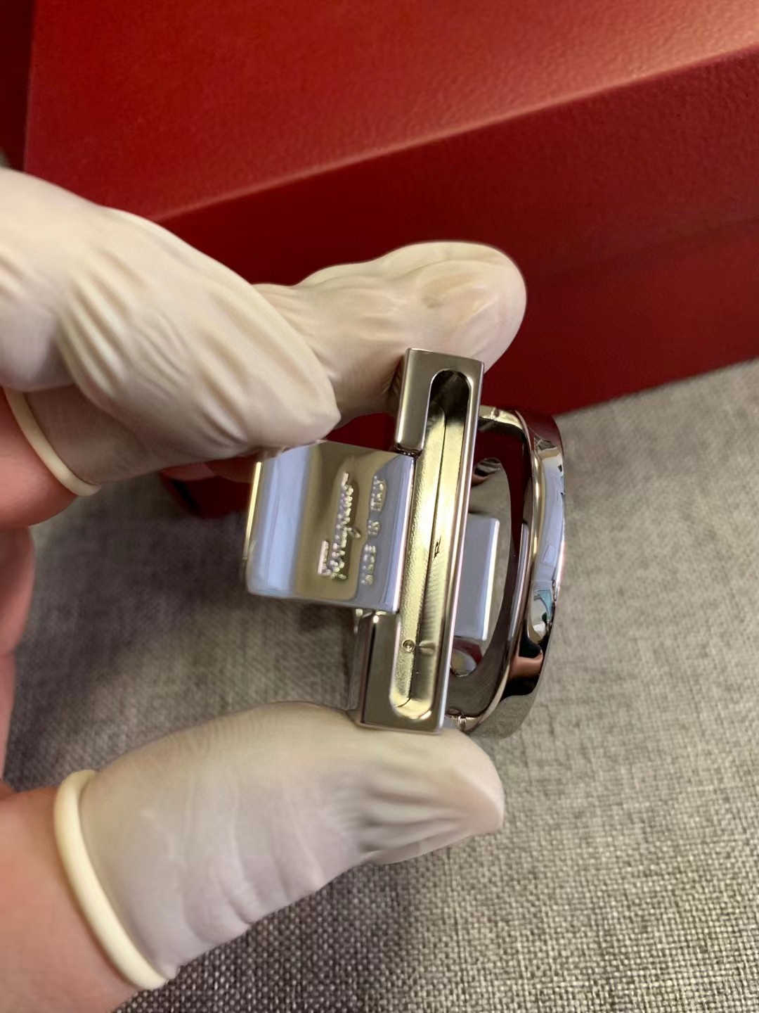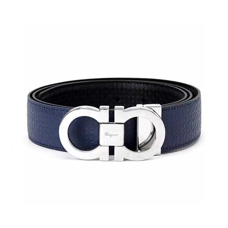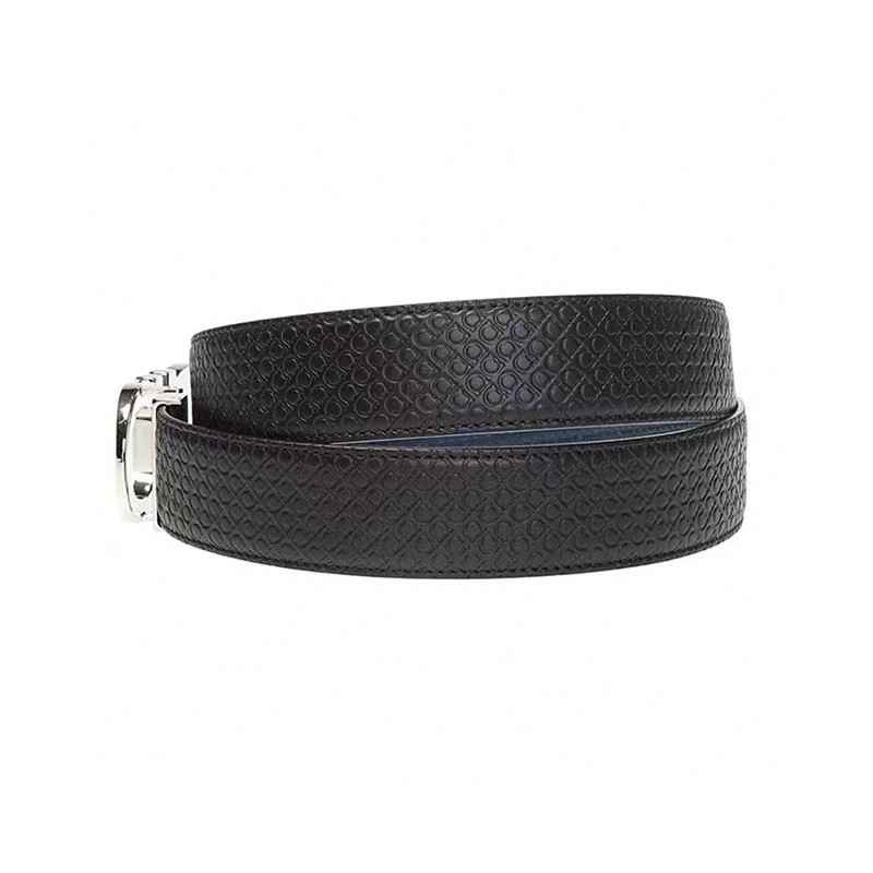官价4000元,少见的印花款,原胚铜扣,厚镀钯层,饰品级无死角打磨抛光,光亮照人,带身采用进口全粒面小牛皮,饰以菲拉格慕标志性Logo. 辨识度绝佳,一面黑色,一面深蓝色,双面自由切换。
