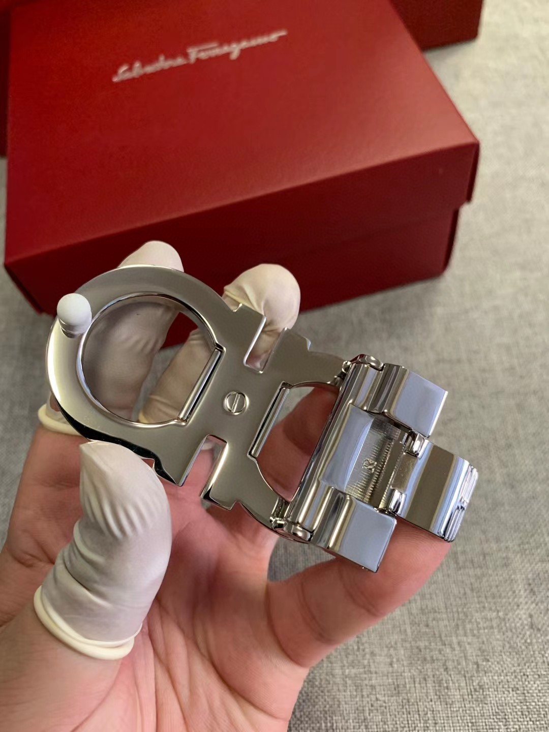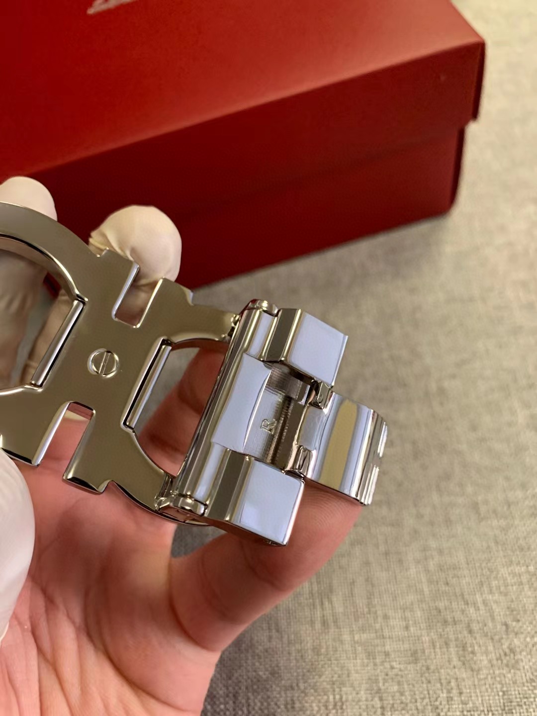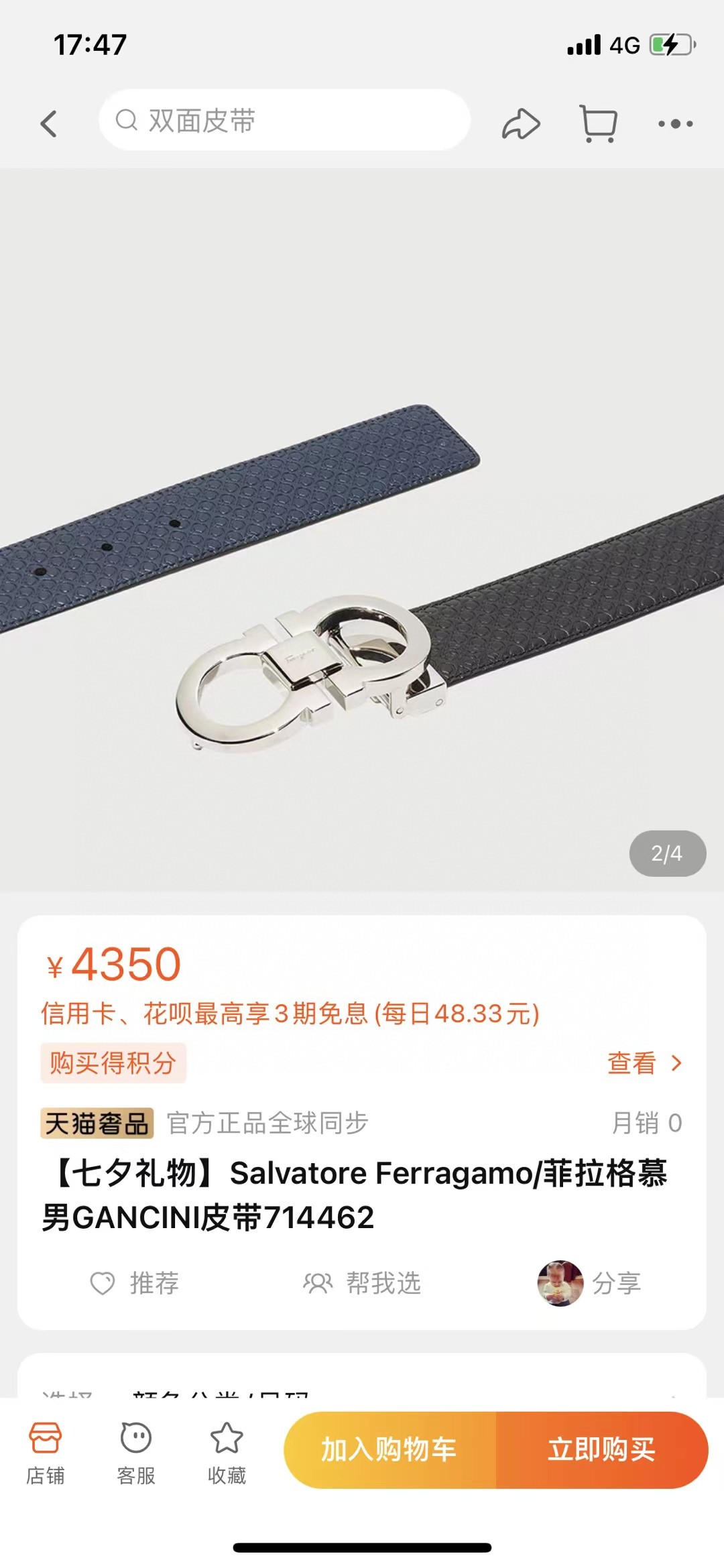 官价4000元,少见的印花款,原胚铜扣,厚镀钯层,饰品级无死角打磨抛光,光亮照人,带身采用进口全粒面小牛皮,饰以菲拉格慕标志性Logo. 辨识度绝佳,一面黑色,一面深蓝色,双面自由切换。