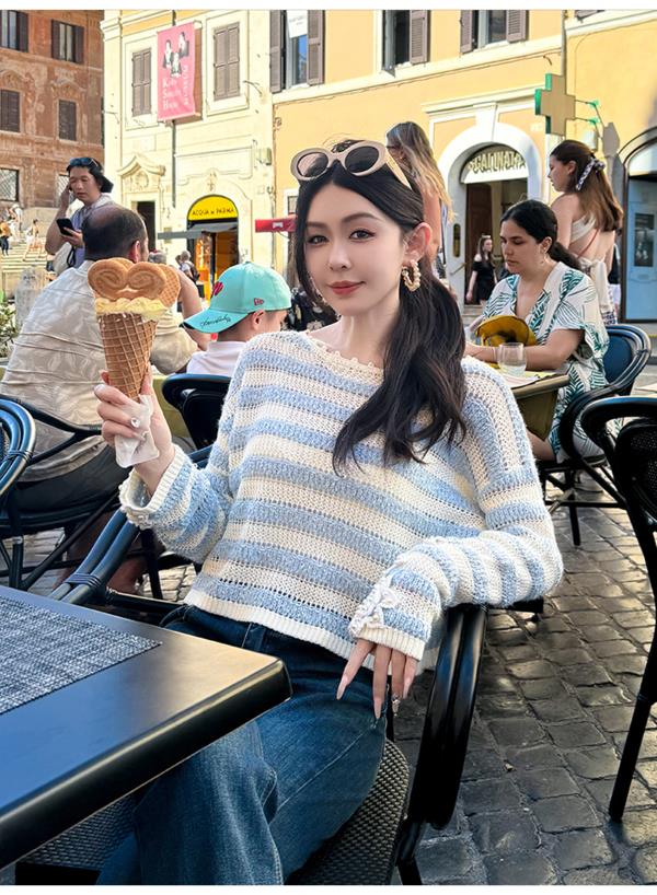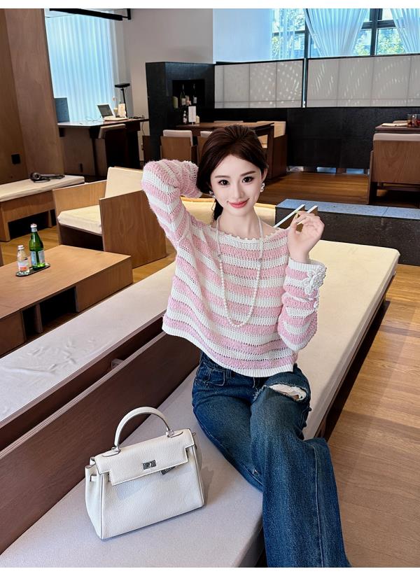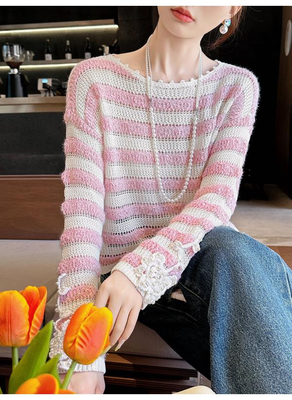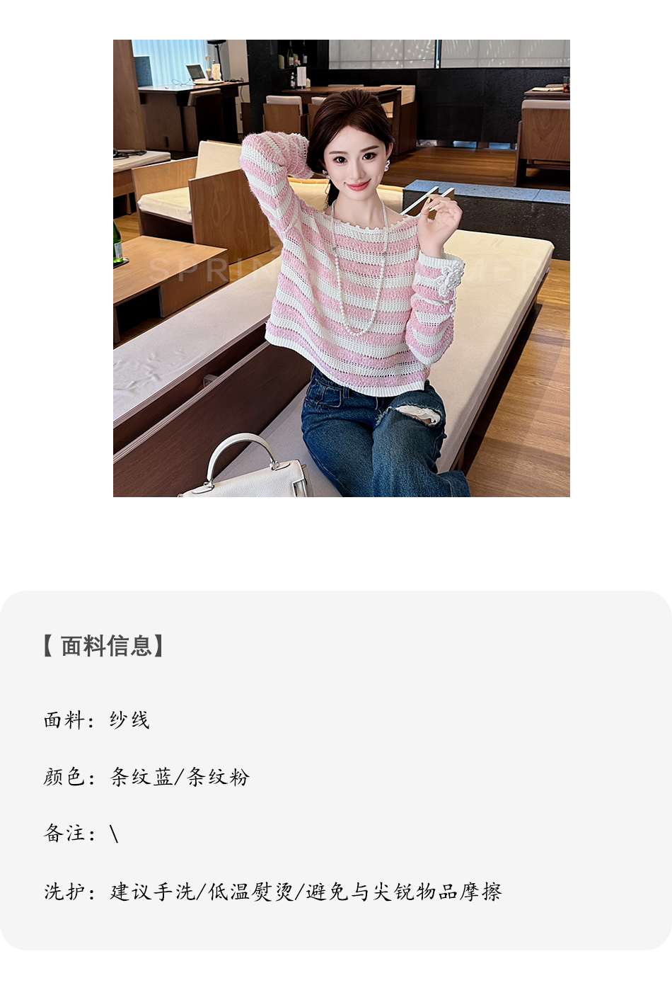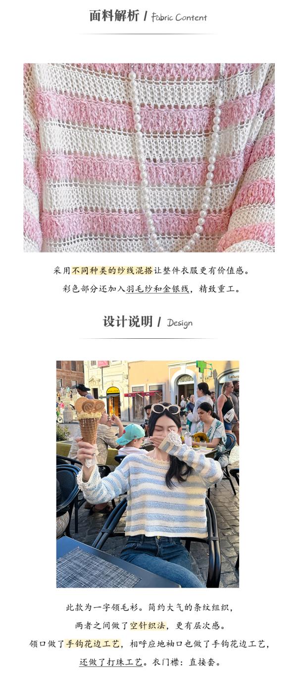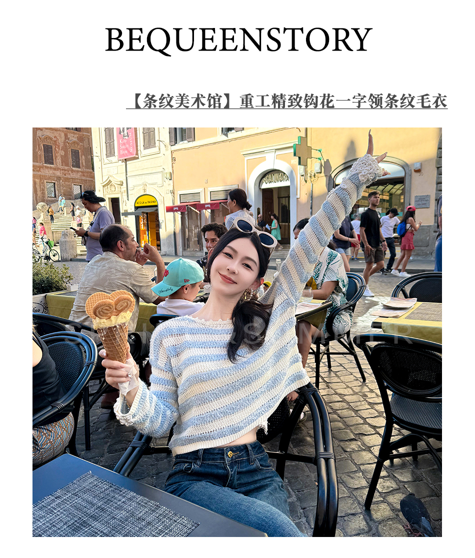 BeQueenStory【条纹美术馆】重工设计感精致钩花一字领条纹毛衣