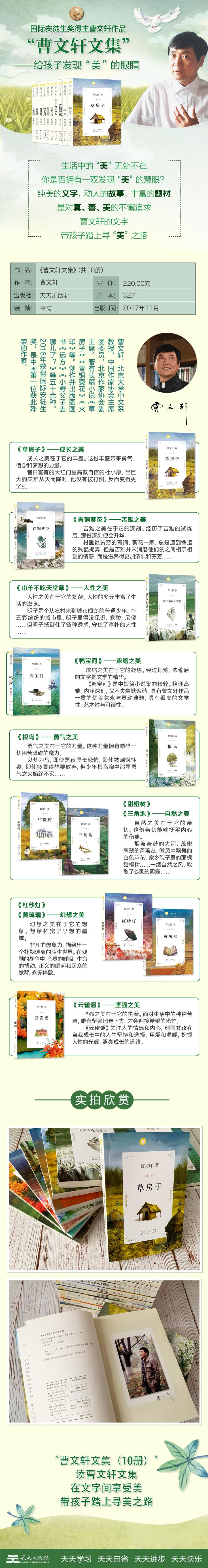 《曹文轩文集(草房子+根鸟+青铜葵花+山羊不吃天堂草+三角地+鸭宝河+红纱灯+黄琉璃+云雀谣+甜橙树)(全10册)》由曹文轩著