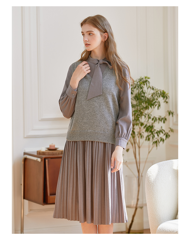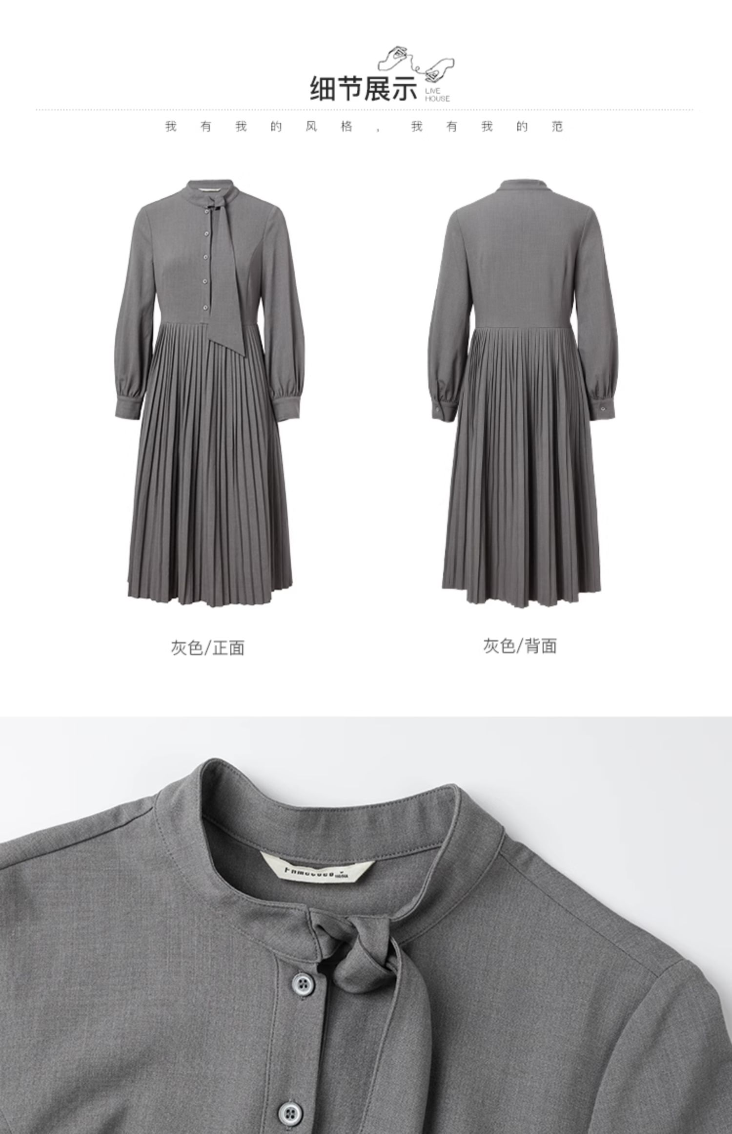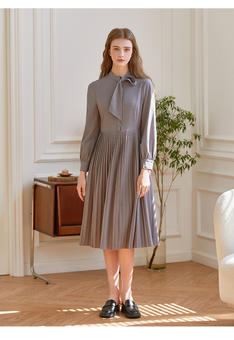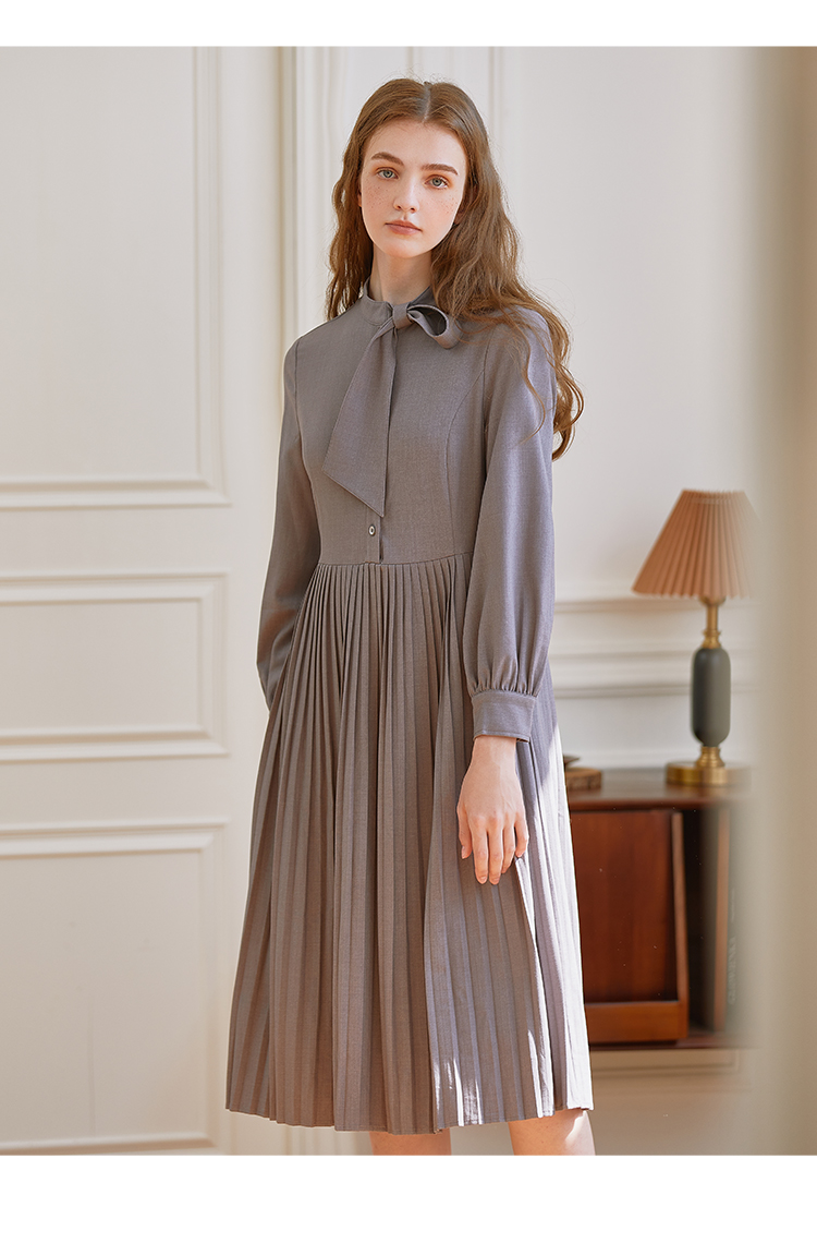 Famecoco范可儿原创小众衬衫裙女士秋款长袖系带领收腰百褶衬衫裙F225FA013