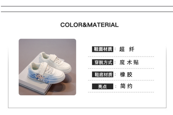 采用合成革材质,质地柔软且耐用。既能抵御日常刮擦, 又保证了鞋子的透气性,让孩子的小脚时刻保持干爽舒适,不会闷热出汗。