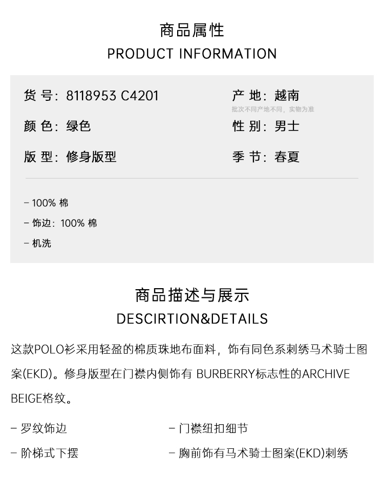 BURBERRY 巴宝莉 男士马术骑士徽标刺绣棉质短袖polo衫 绿色 8118953 C4201