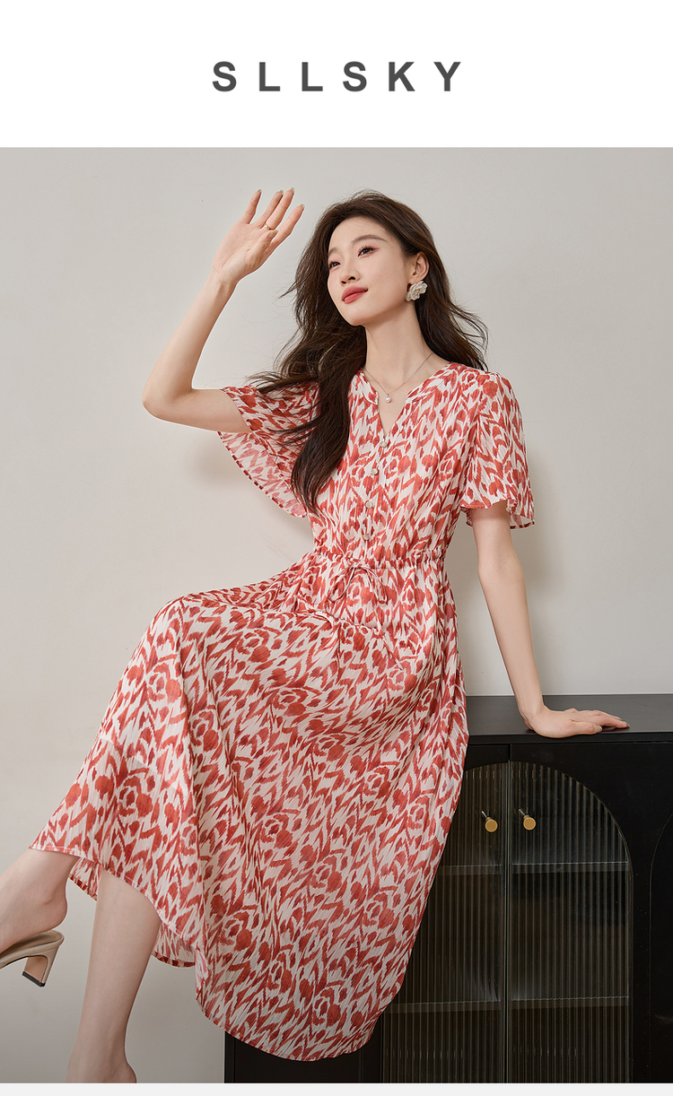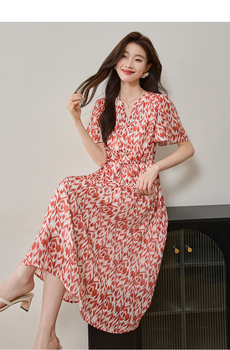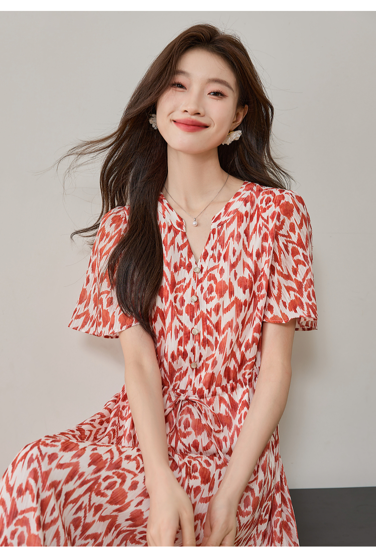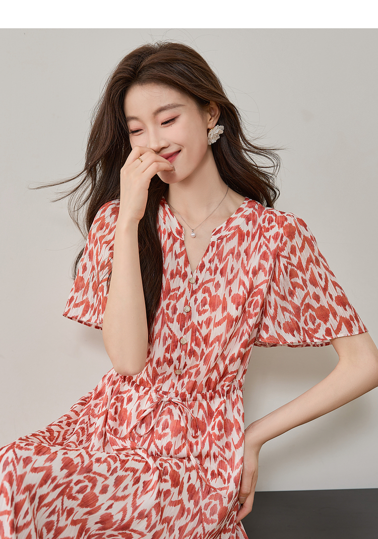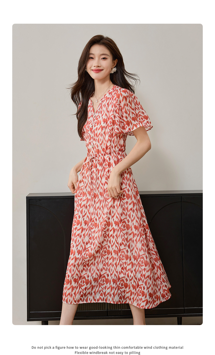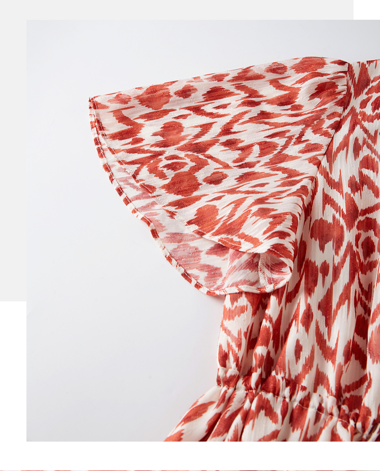 【专属特价】熙世界法式浪漫红色印花连衣裙夏季新款飞飞袖优雅气质收腰裙子
