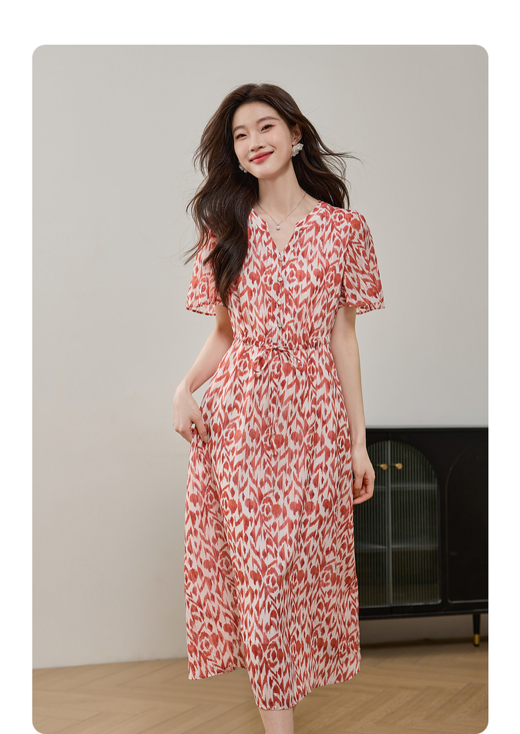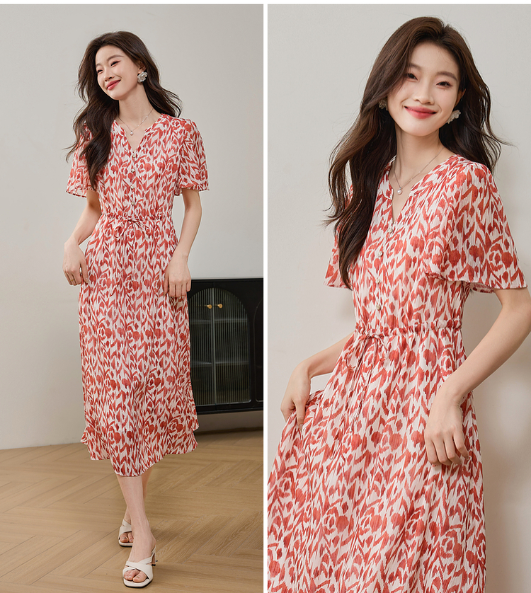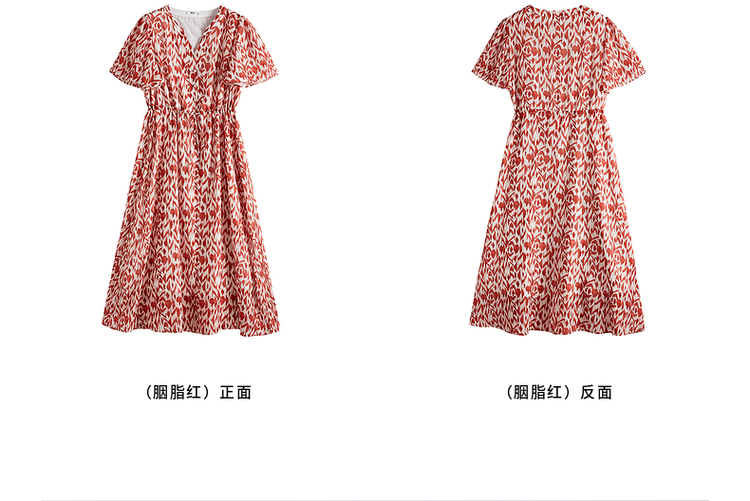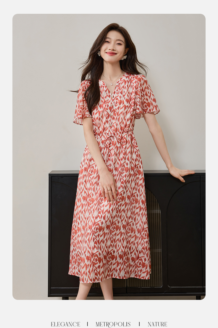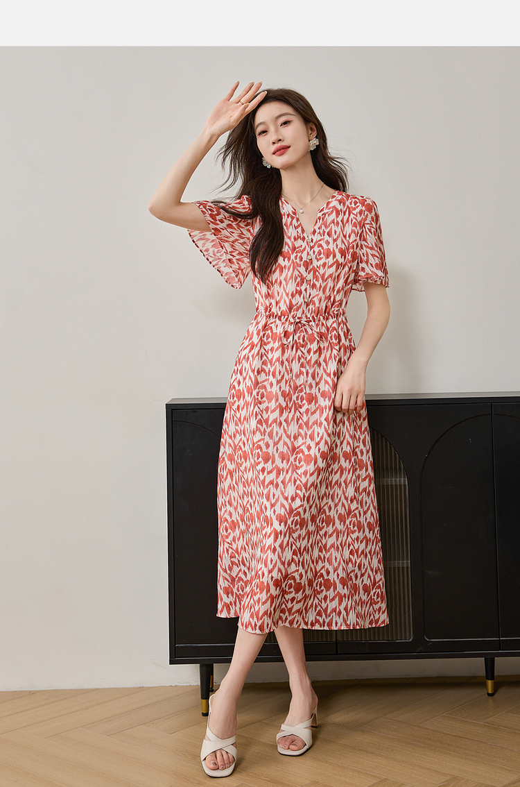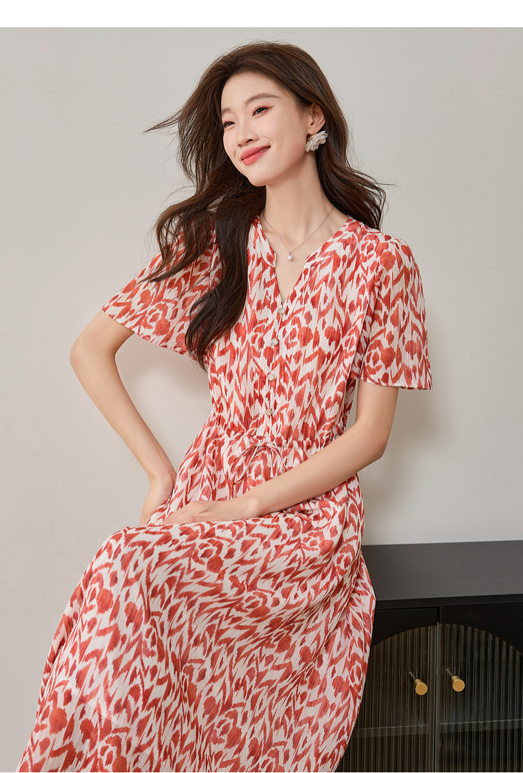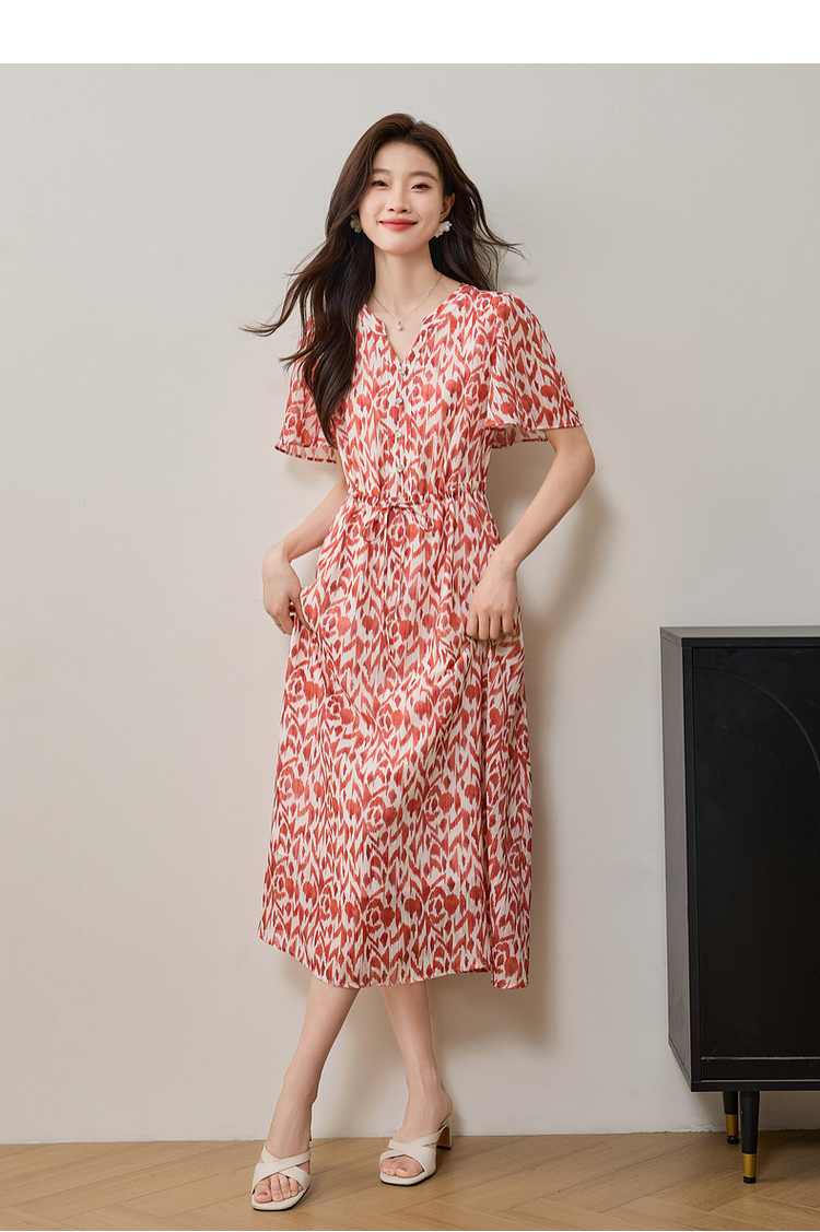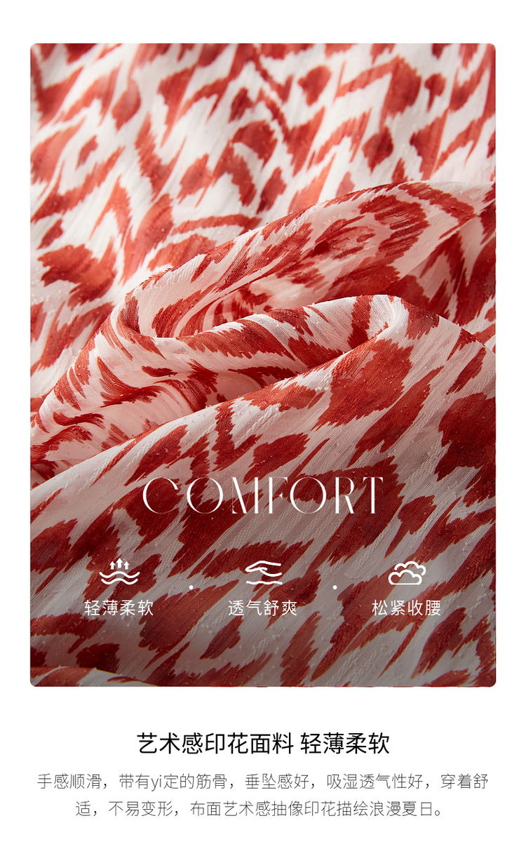 【专属特价】熙世界法式浪漫红色印花连衣裙夏季新款飞飞袖优雅气质收腰裙子