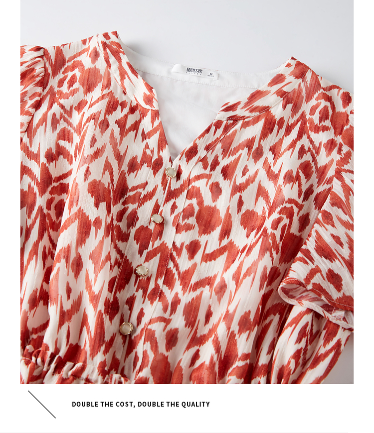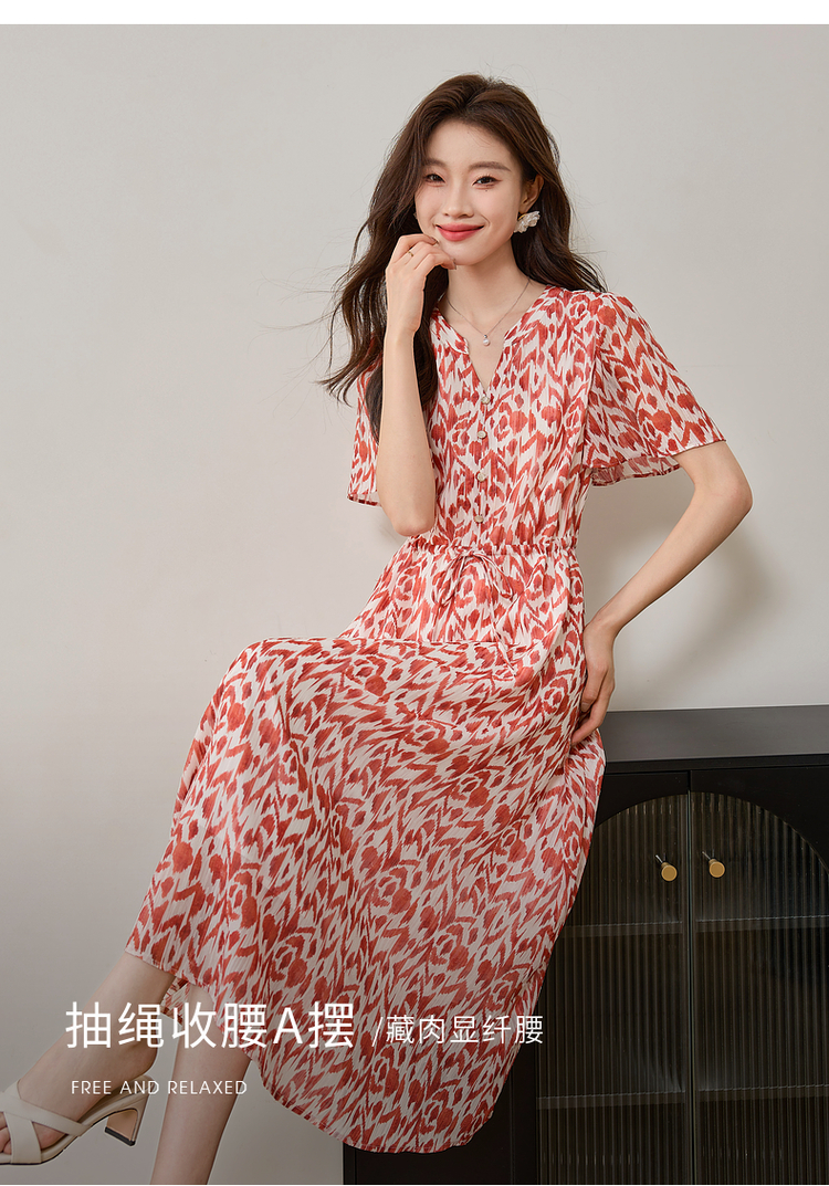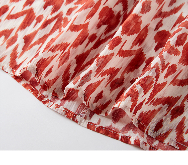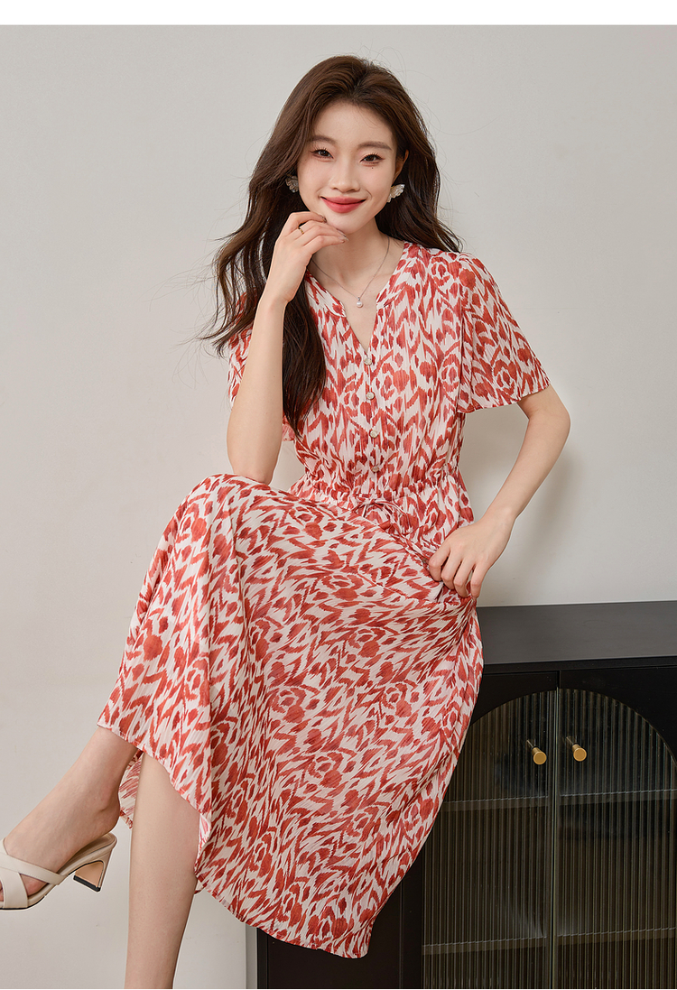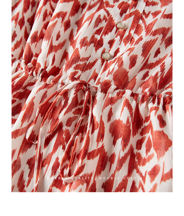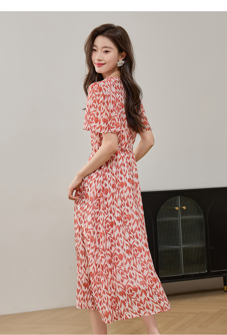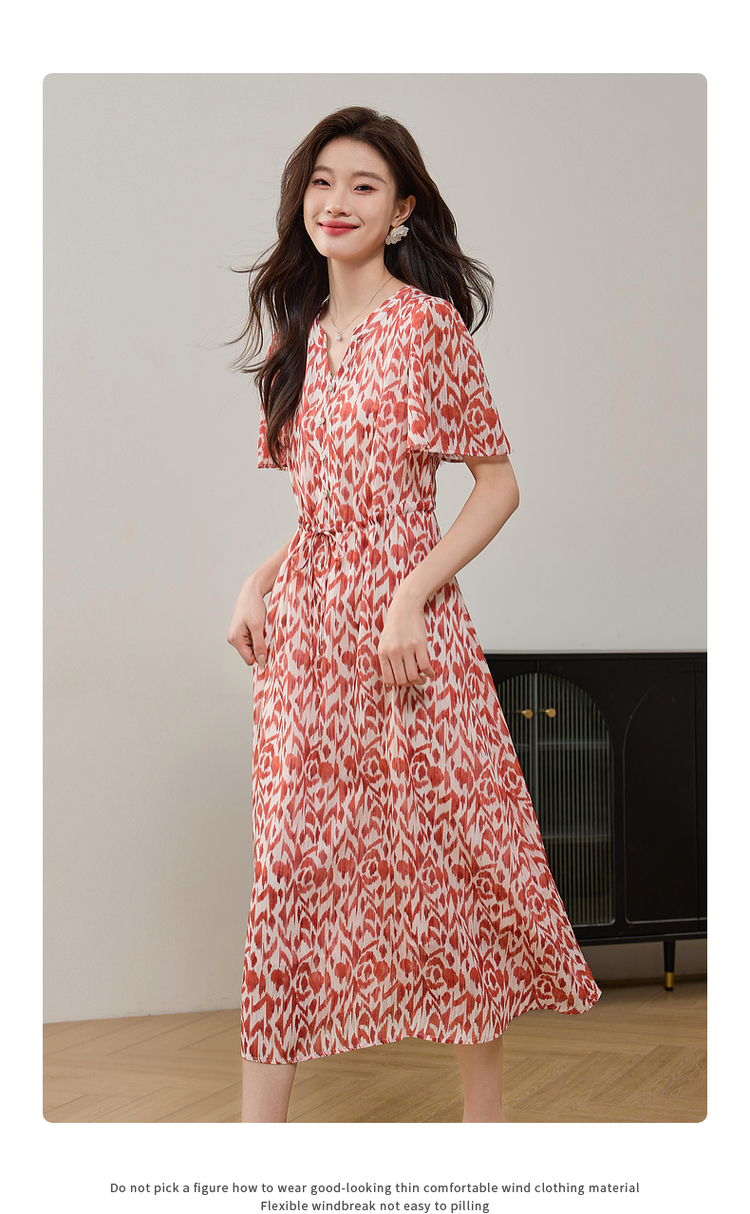 【专属特价】熙世界法式浪漫红色印花连衣裙夏季新款飞飞袖优雅气质收腰裙子