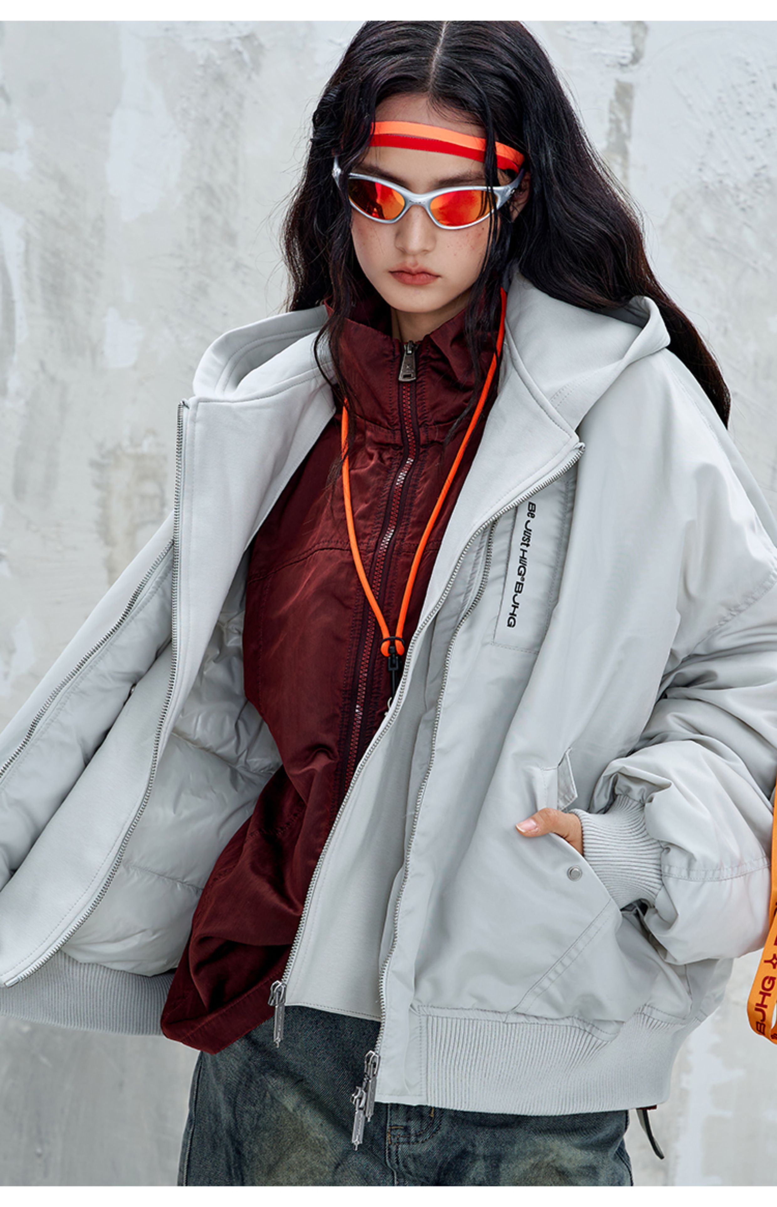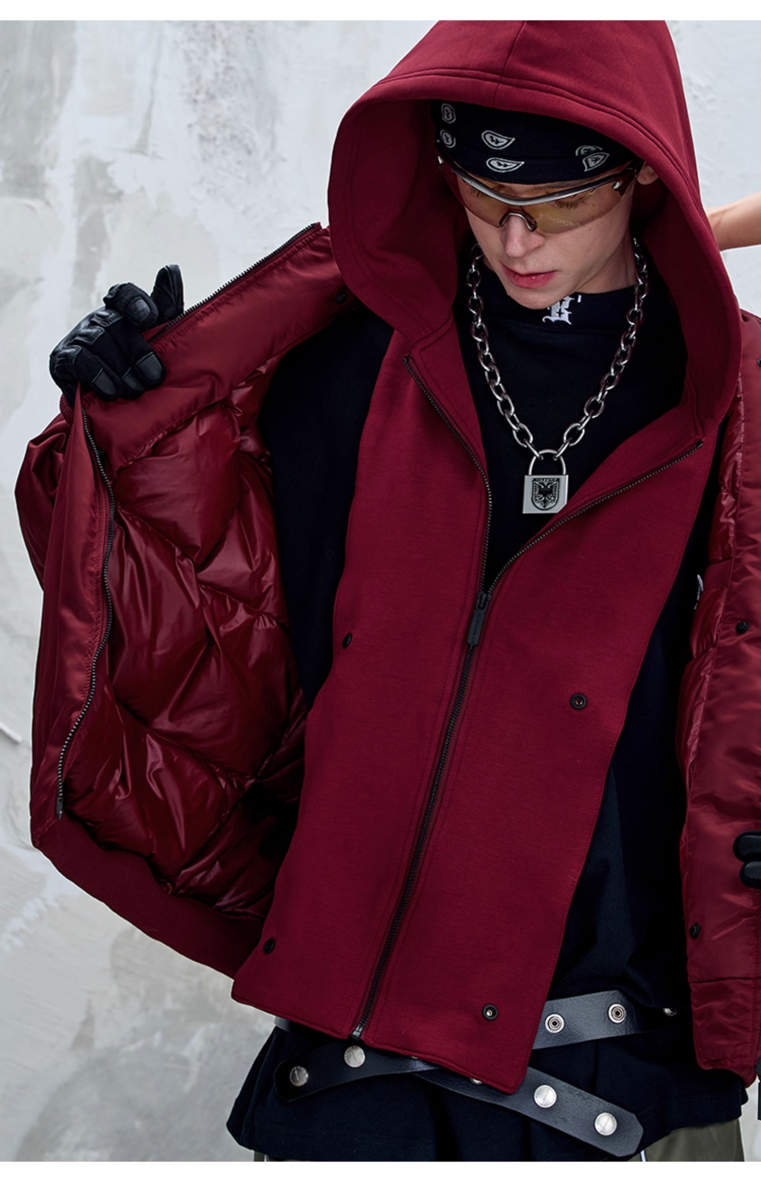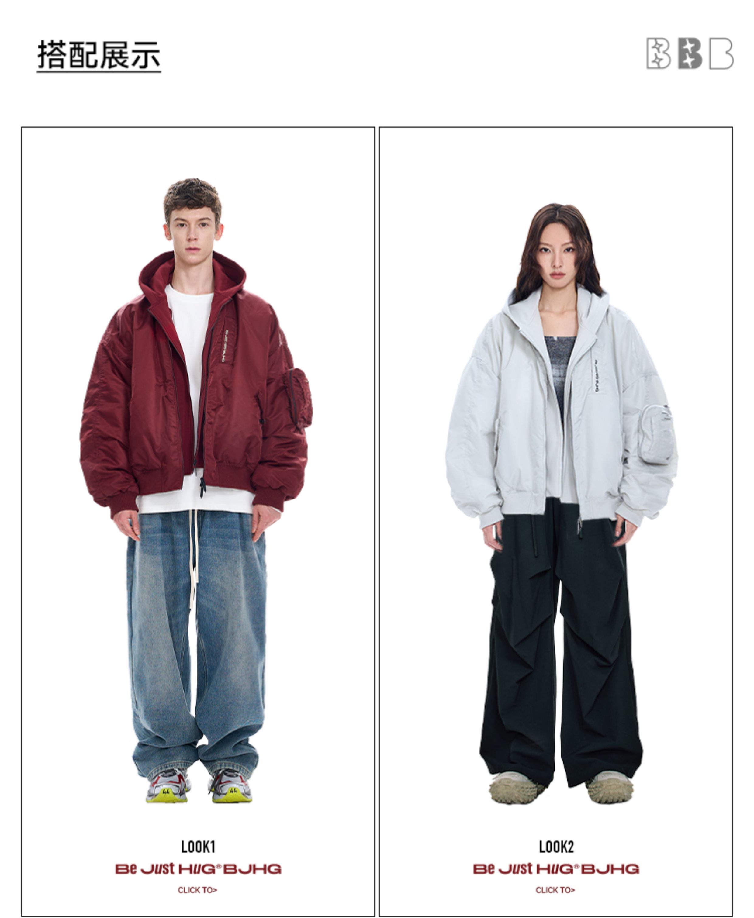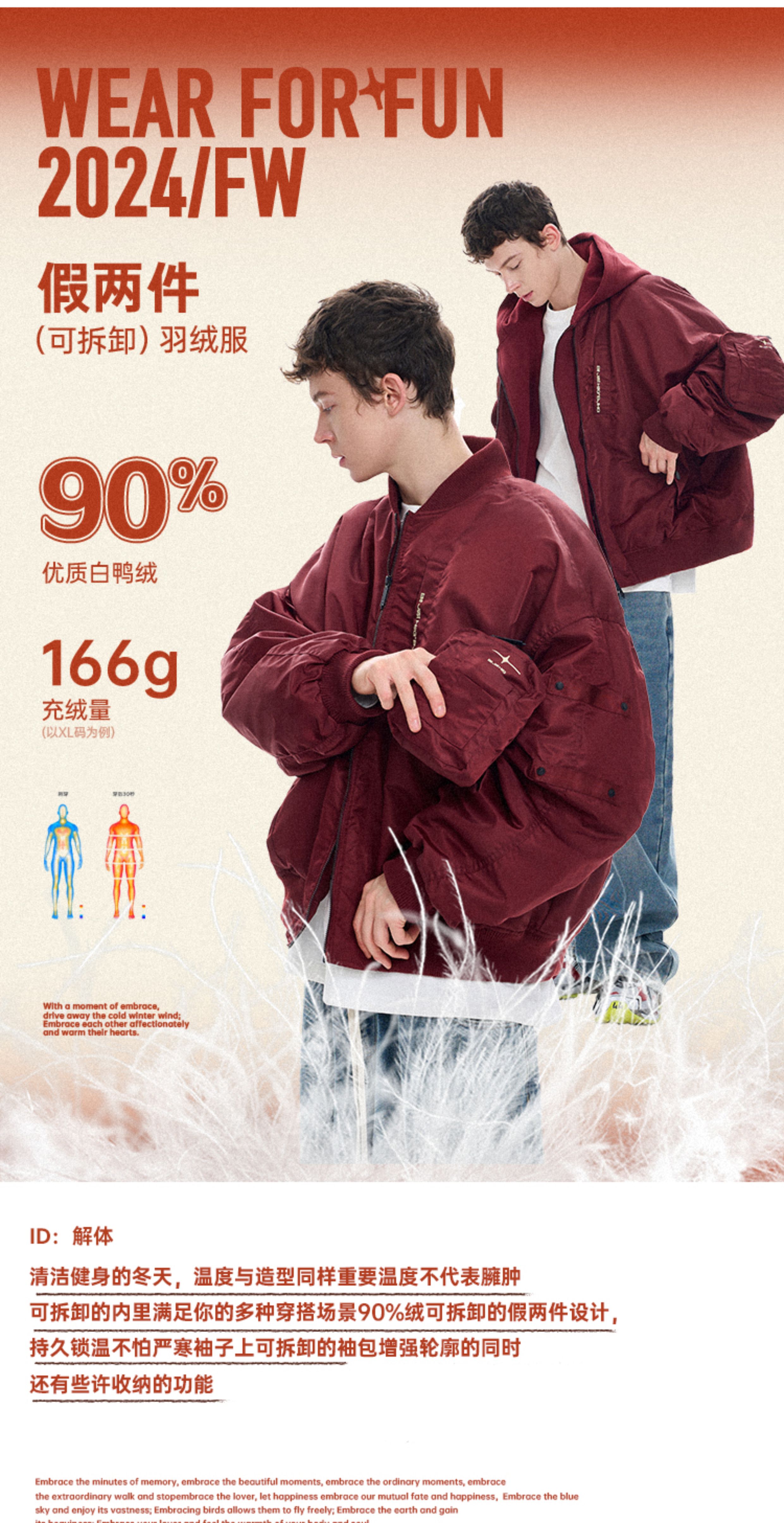 BJHG不计后果假两件羽绒服男女款冬季外套红色90白鸭绒棒球羽绒服