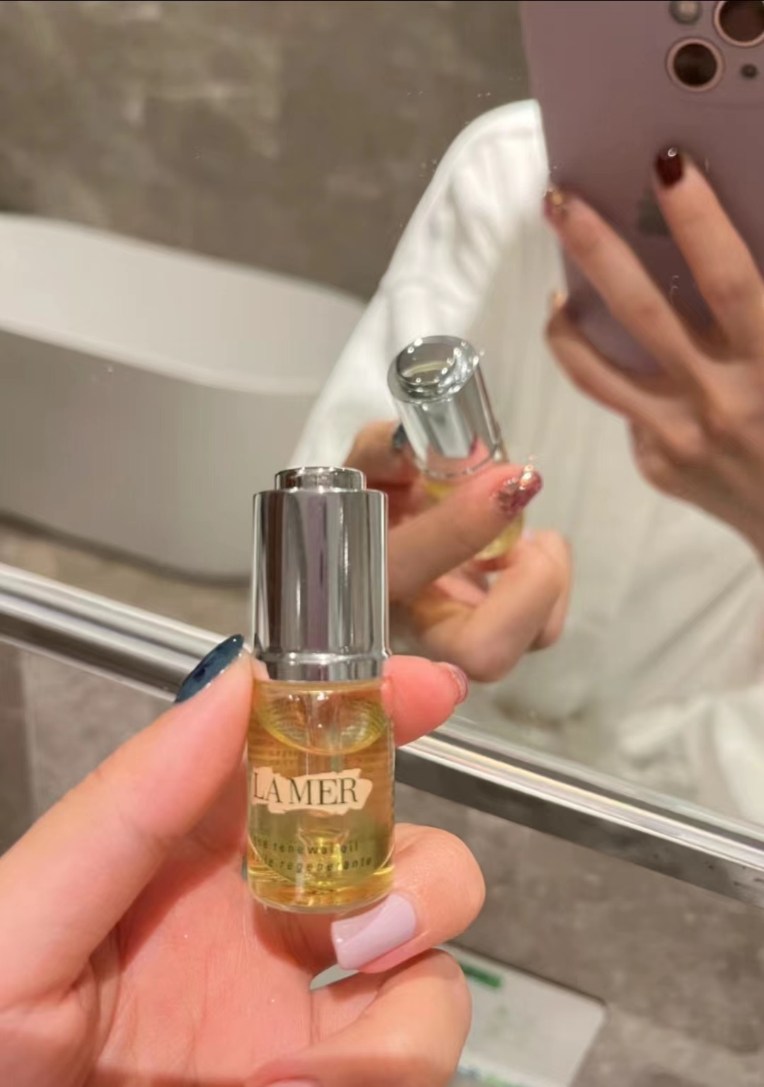 海蓝之谜焕活精华油,水油分离,质地不算轻薄,但也不厚重,用前摇匀,会有明显的小泡泡。上脸有油感,肤感顺滑,吸收很好,有薄薄的油膜感。总体肤感很好,大干皮冬季用量会大一些。