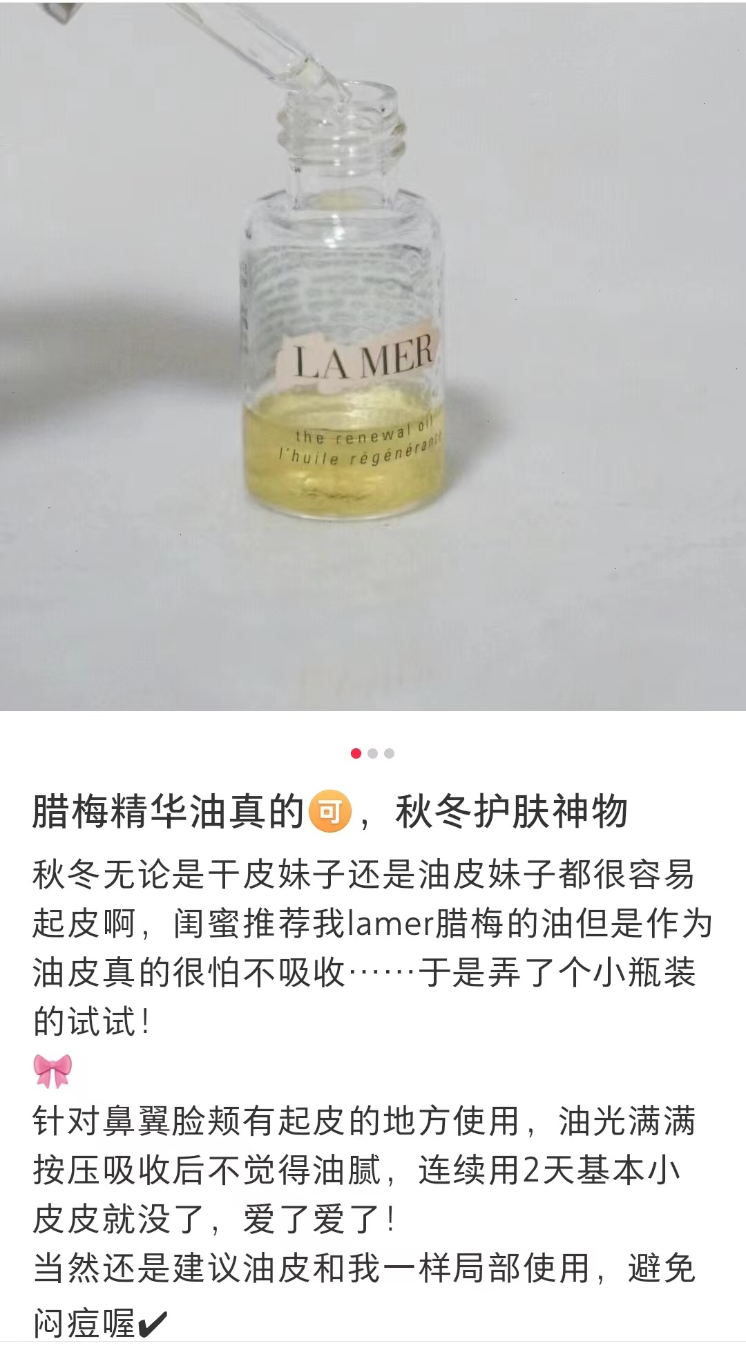 2.油皮可以滴在护肤水里,提升护肤水的活性成分含量,也不至于让肤感厚重不好吸收。