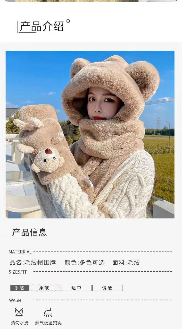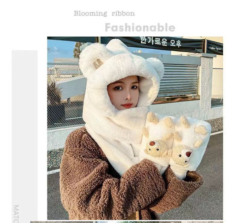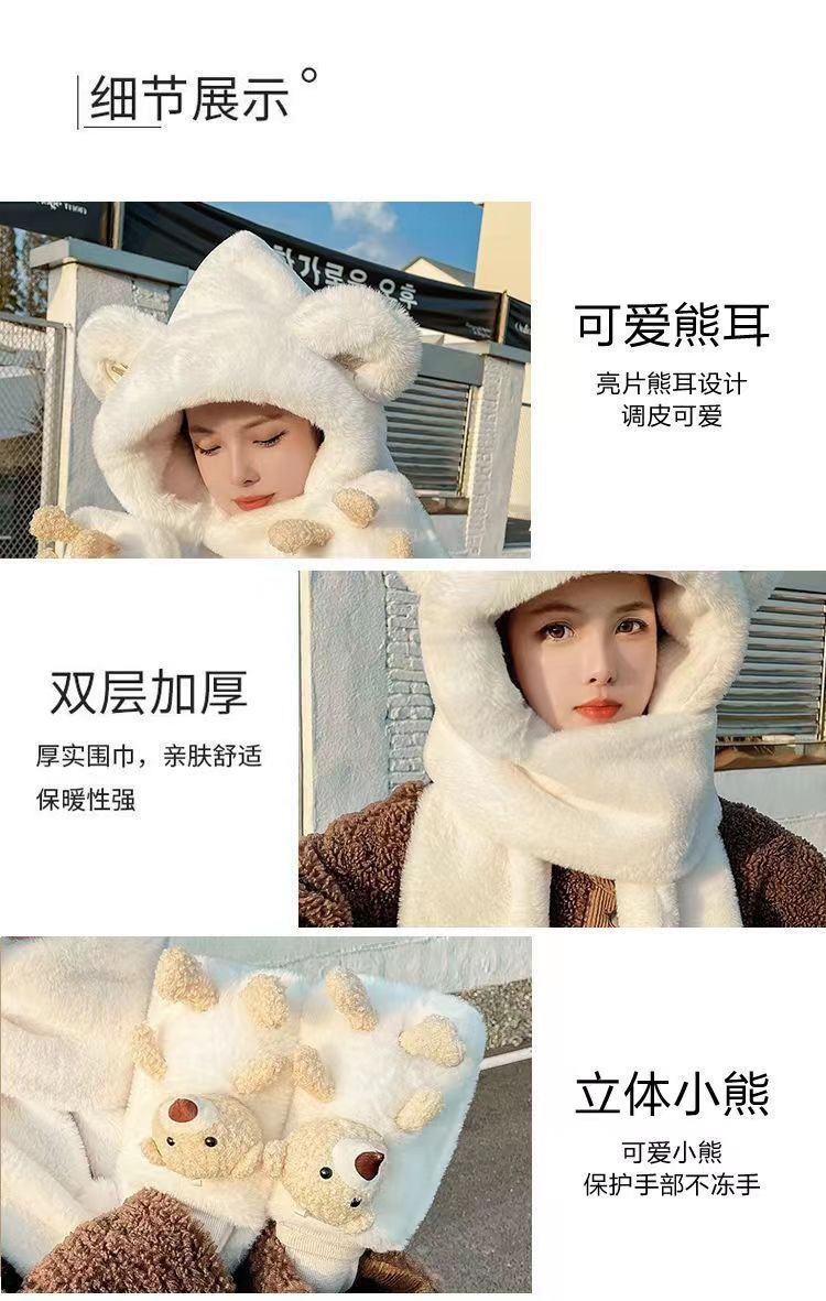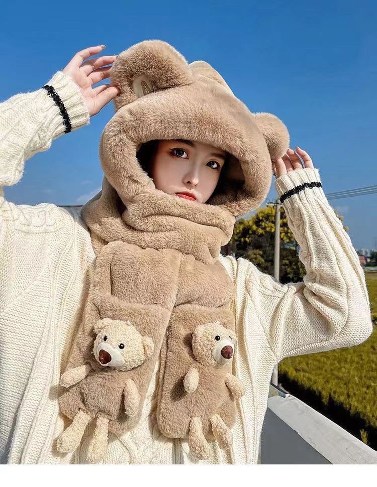 【双倍加厚面料❗️可爱造型呆萌】小熊帽子女冬季可爱百搭保暖毛绒帽手套连帽围脖围巾一体三件套潮。ja