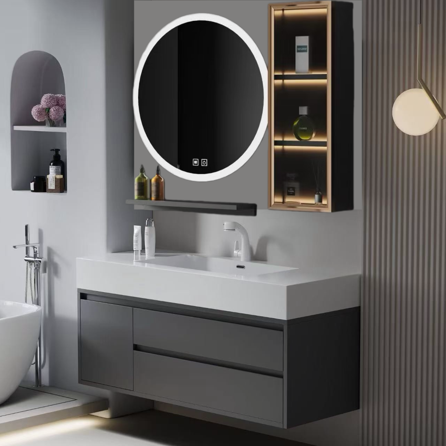 8048-70/80/90/100全白 轻奢岩板浴室柜(圆镜)