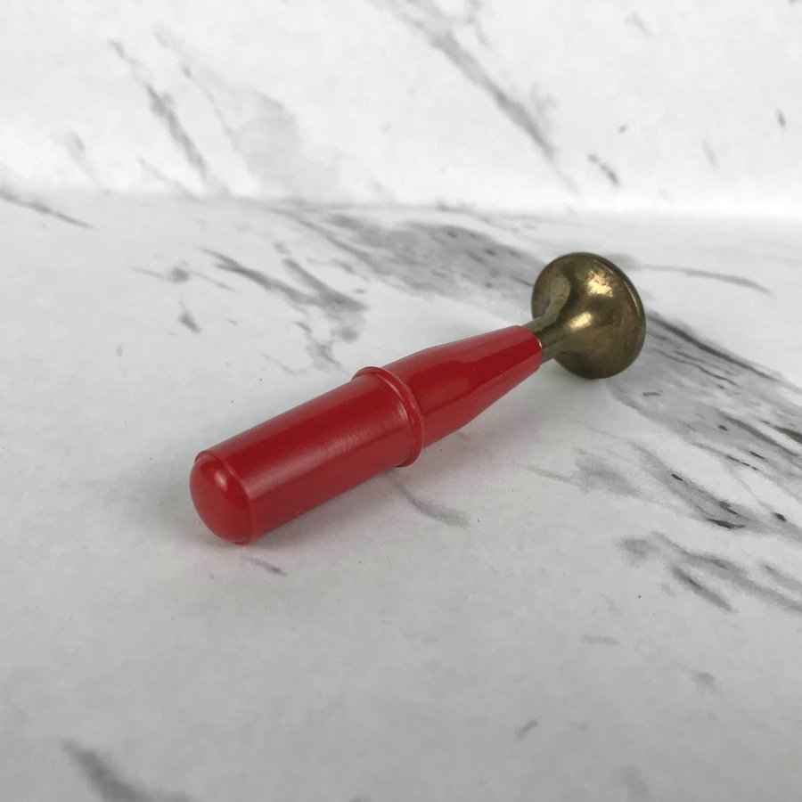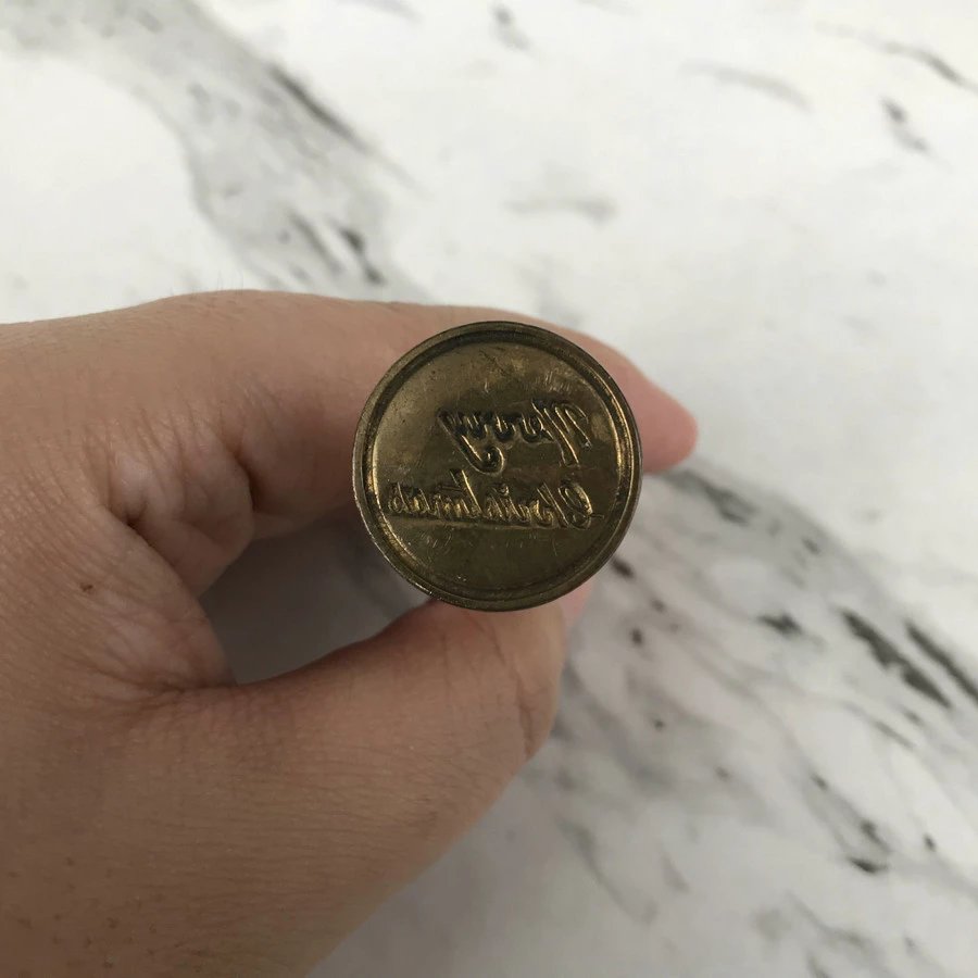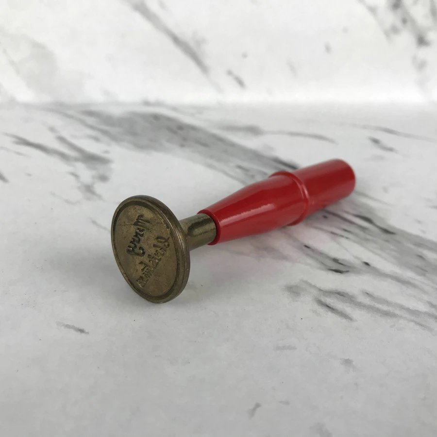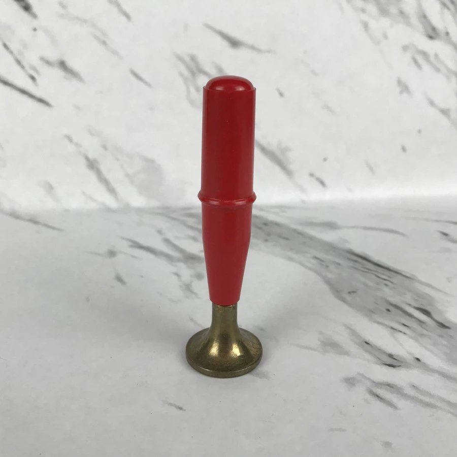 复古红色胶体手柄火漆印章材质:手柄应该为胶体 底部印章部分金属尺寸:高7.6cm,底径2.2cm此枚火漆印章底部有文字,有轻微锈迹,不过整体不错。