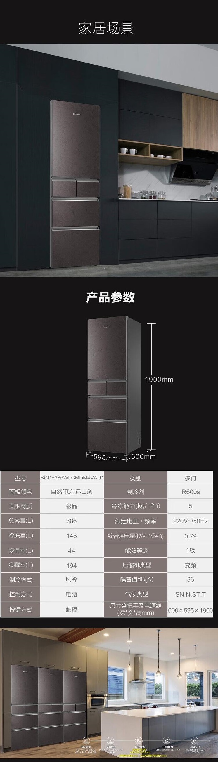 卡萨帝(202586)(Casarte)386升零距离自由嵌入式多门一级能效风冷无霜双变频双四档变温除菌保鲜智能WIFI家用电冰箱 BCD-386WLCMDM4VAU1