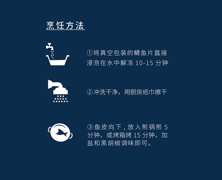 烹饪方法非常简单:5分钟煎制:解冻至鱼肉稍软,鱼皮向下放入平底锅中,中火煎2-3分钟,翻面再煎2-3分钟,出锅撒海盐黑胡椒料包即可,也可以挤点柠檬汁去腥。