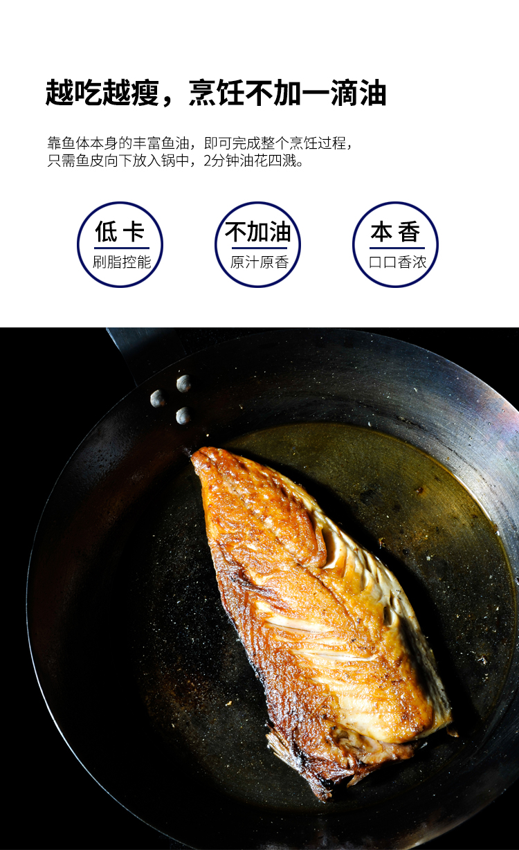 烹饪过程非常简单,从包装里取出来,鱼皮向下放入平底锅中,开中火即可煎制,整个过程都用不用加一滴油哦。半分钟后,整条鱼就开始嘶啦嘶啦冒油,浓郁的香气迅速溢满开来。