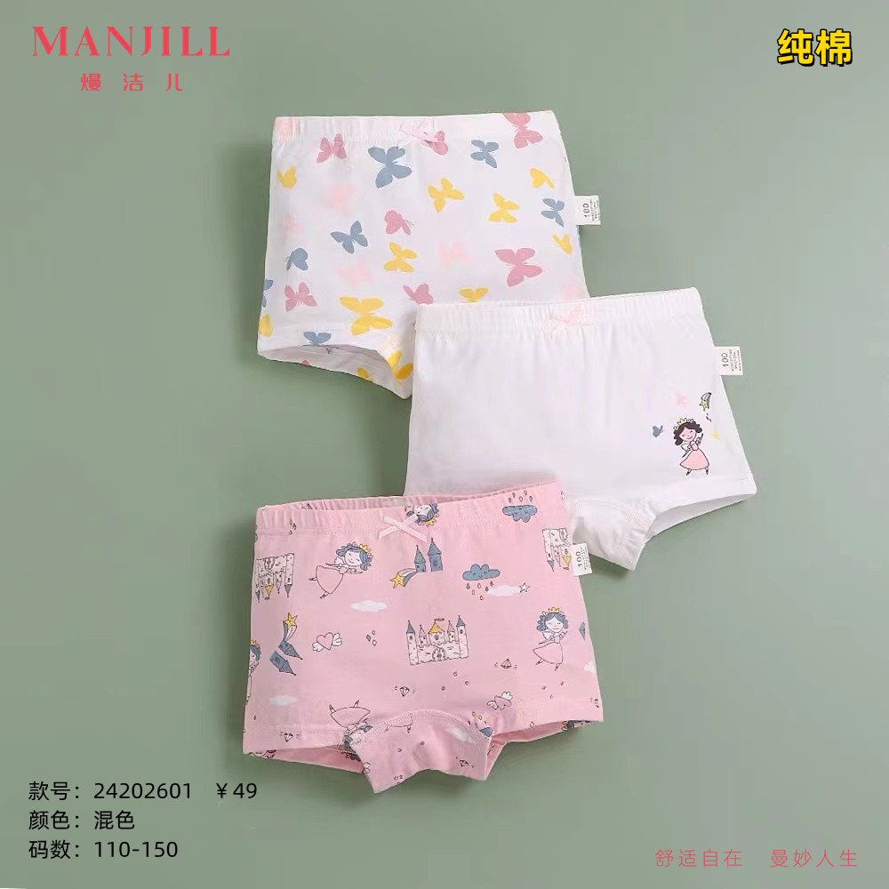 【商场同款】熳洁儿 女童纯棉内裤3条装平角不夹臀内裤车缝卡通印花24202601