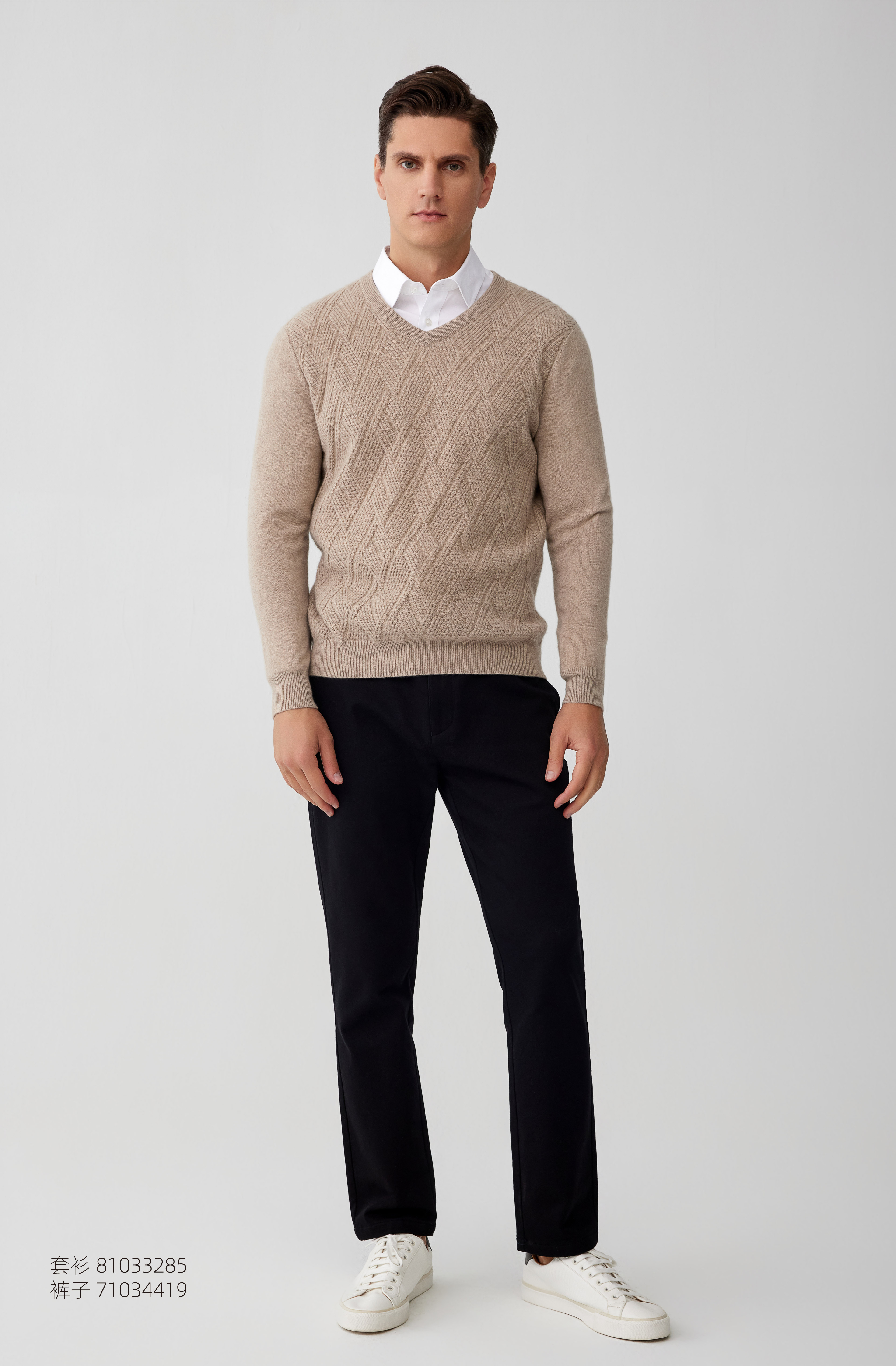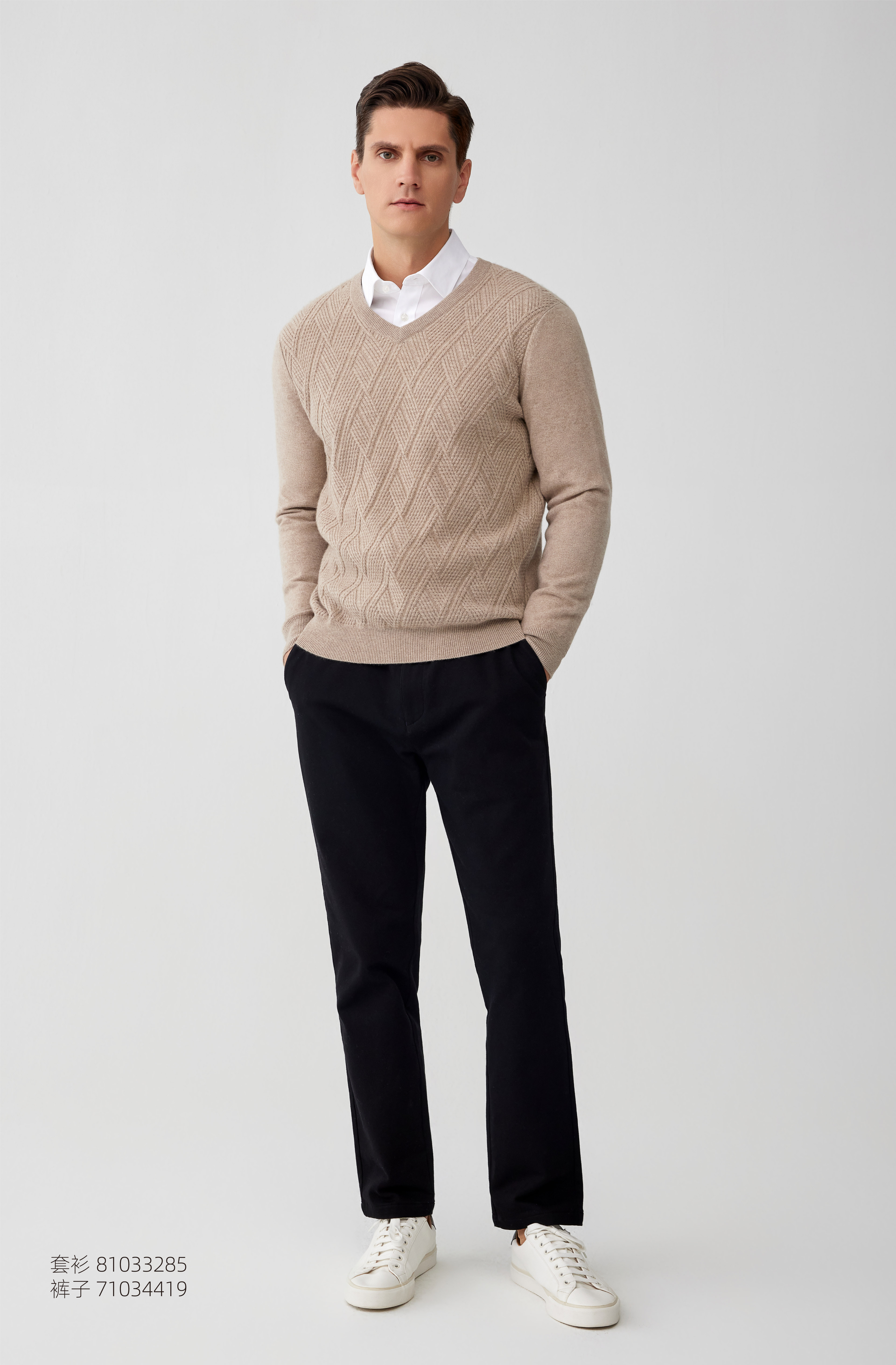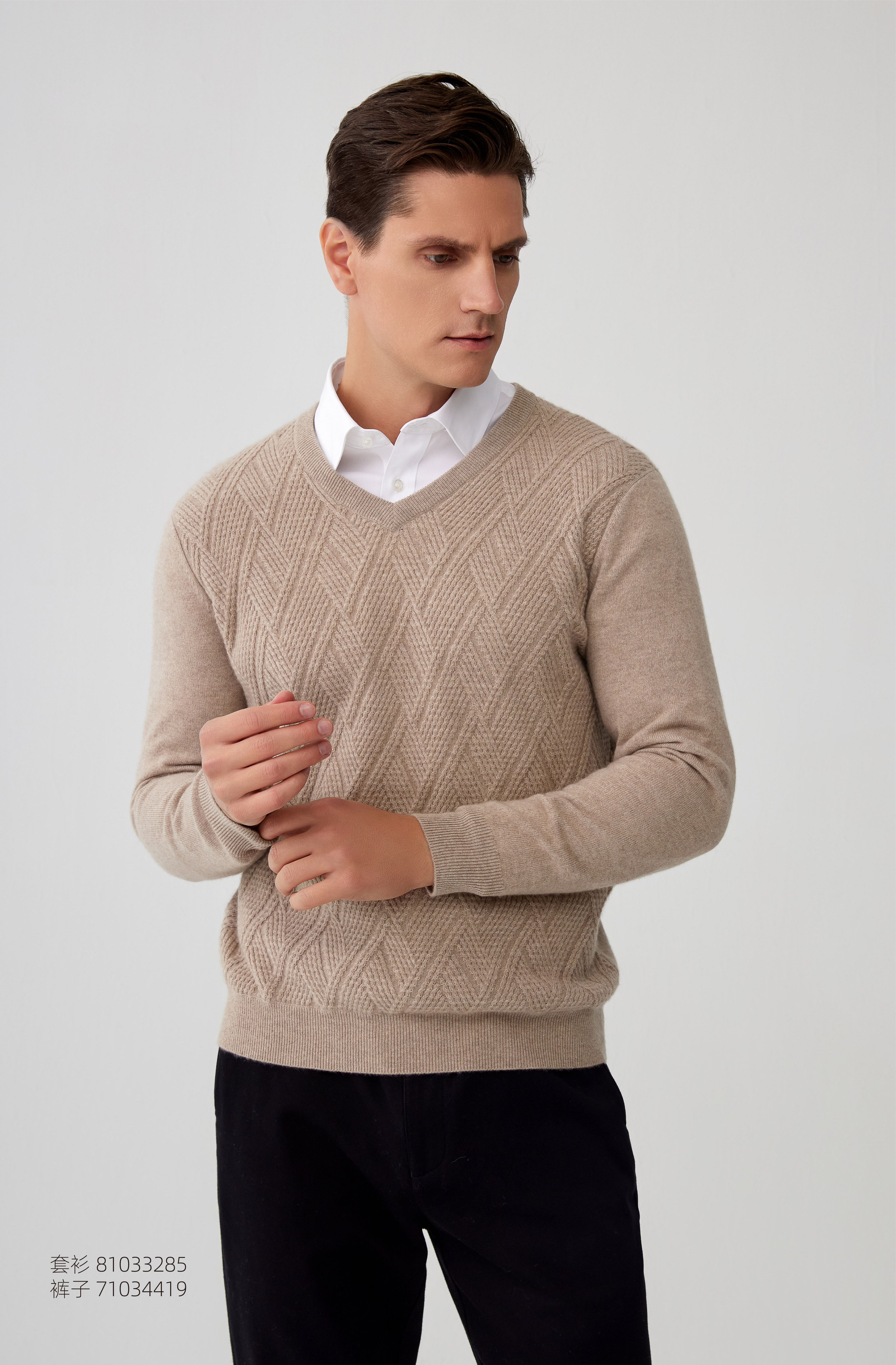 【菱形绞花V领纯羊绒套衫】羊绒世家秋冬新品男士100%山羊绒内搭保暖针织毛衣