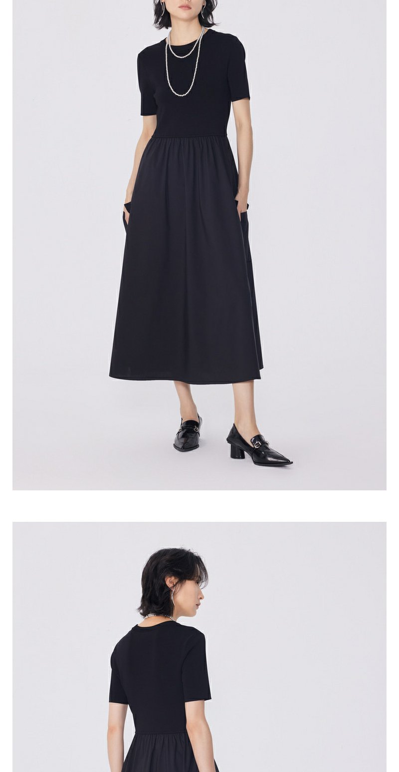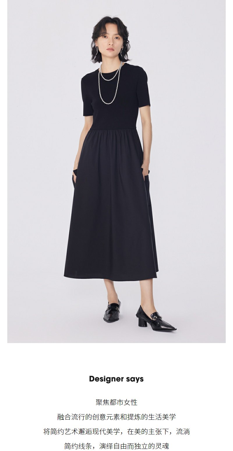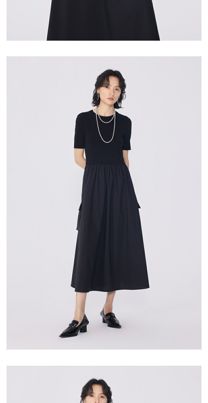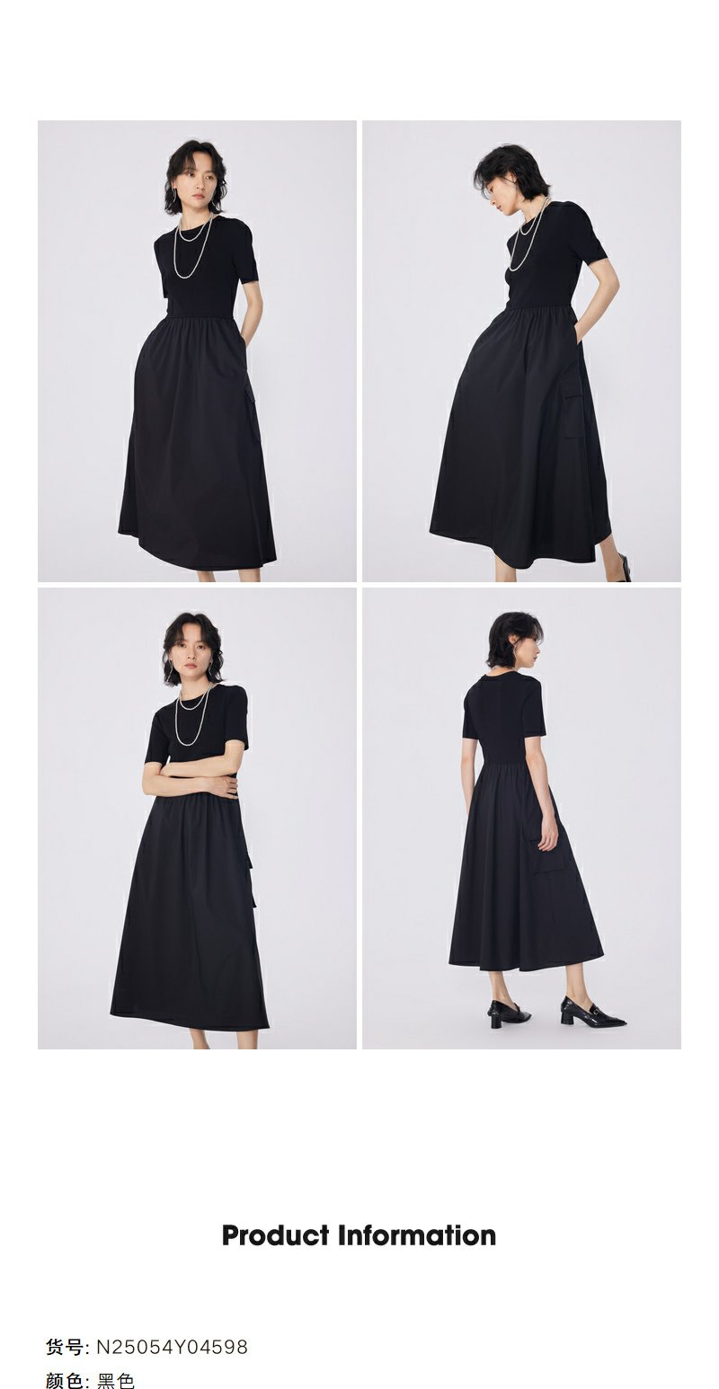 NEELLY纳俪商场同款夏新款黑色显瘦短袖针织拼接连衣裙女收腰长裙N25054Y04598