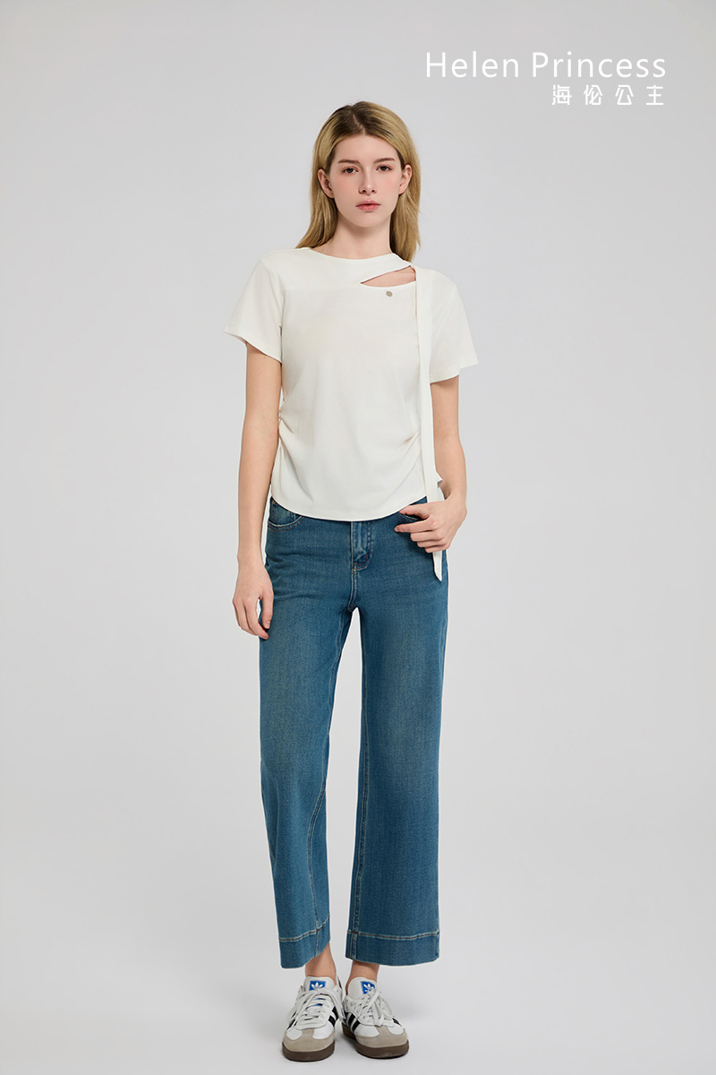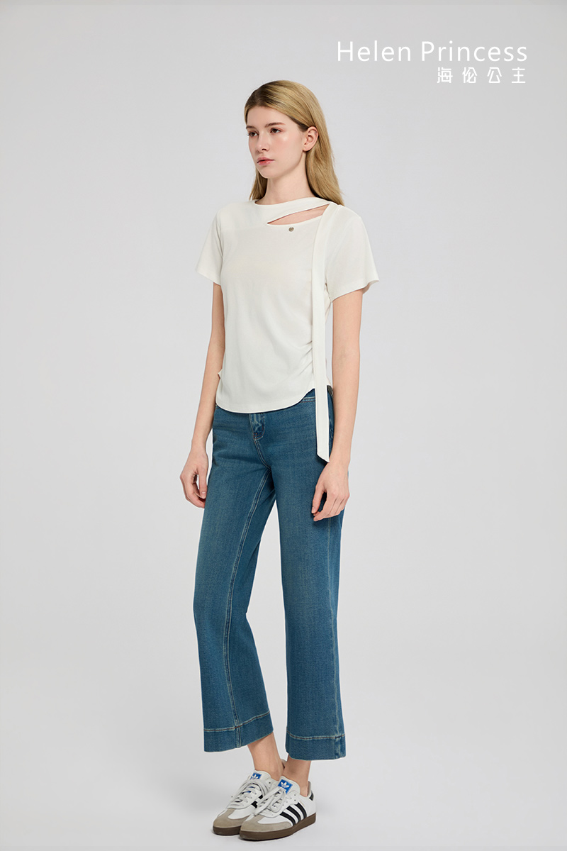 领口处在圆领的基础上做飘带搭肩镂空设计,打破传统T恤的基础单调感,凸显个性不羁的时尚态度。两侧压褶收腰,适当勾勒腰部苗条曲线,舒适不紧绷。