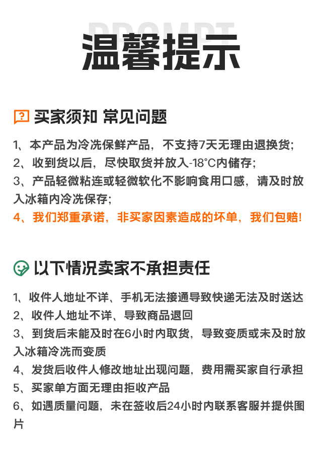 1、冻品一经售出不支持拒收、无理由退换货,请谨慎下单;