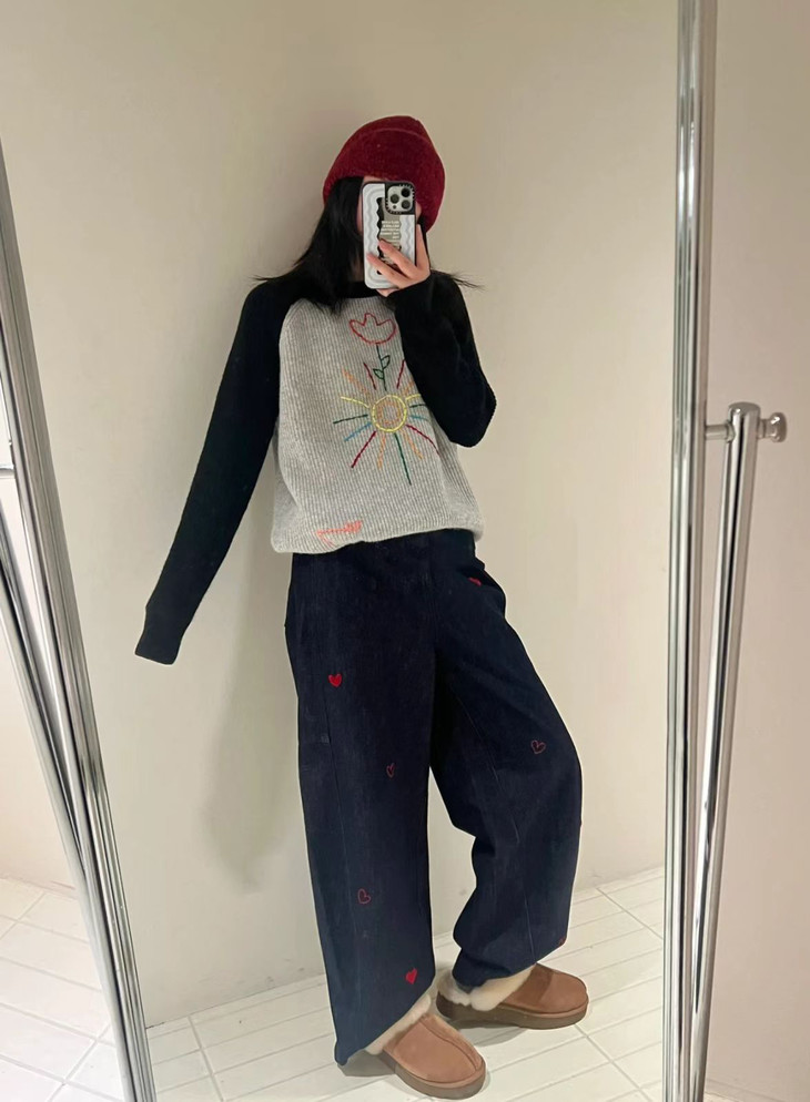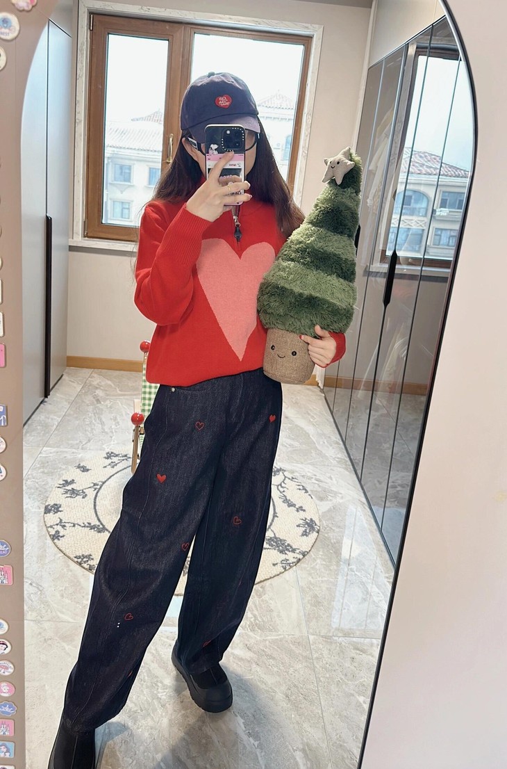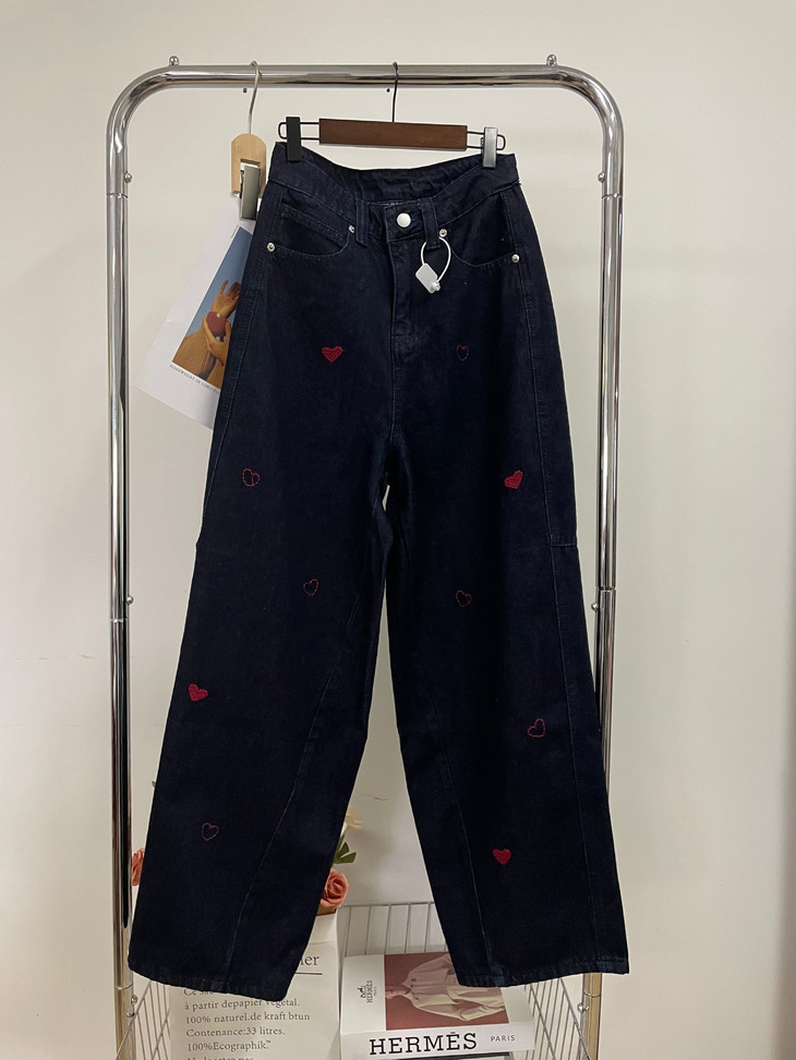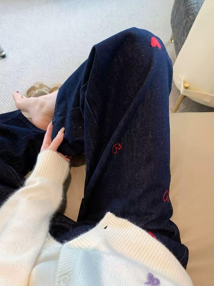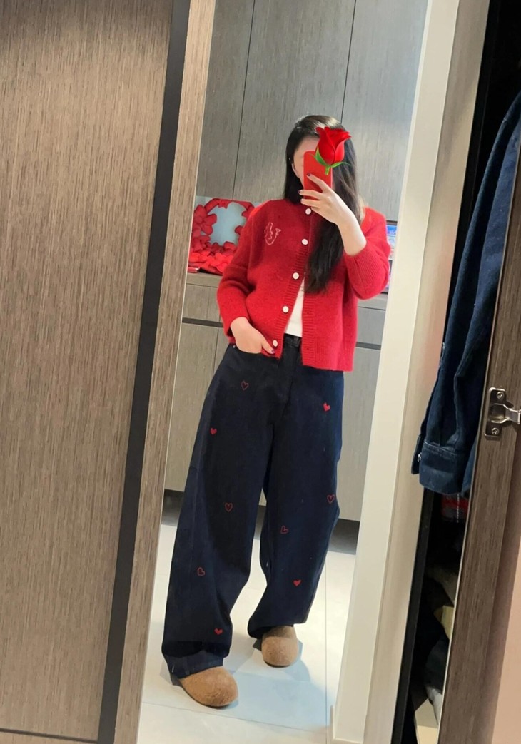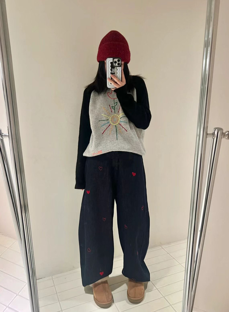 搭配上其实真的很简单: 早春的卫衣、毛衣、大衣都能轻松驾驭 比普通的牛仔裤肯定是更有特色的 穿搭小tips:上衣可以选择一些有亮点的 比如带点红色的花朵,可以和裤子上的爱心刺绣形成一个呼应效果