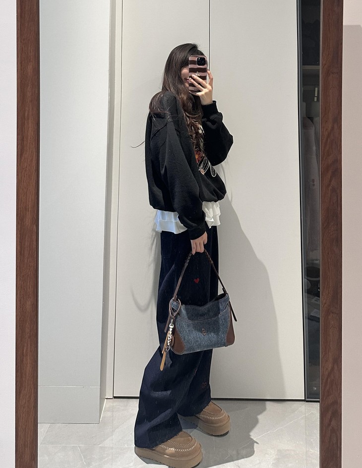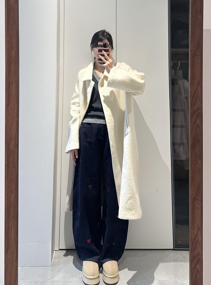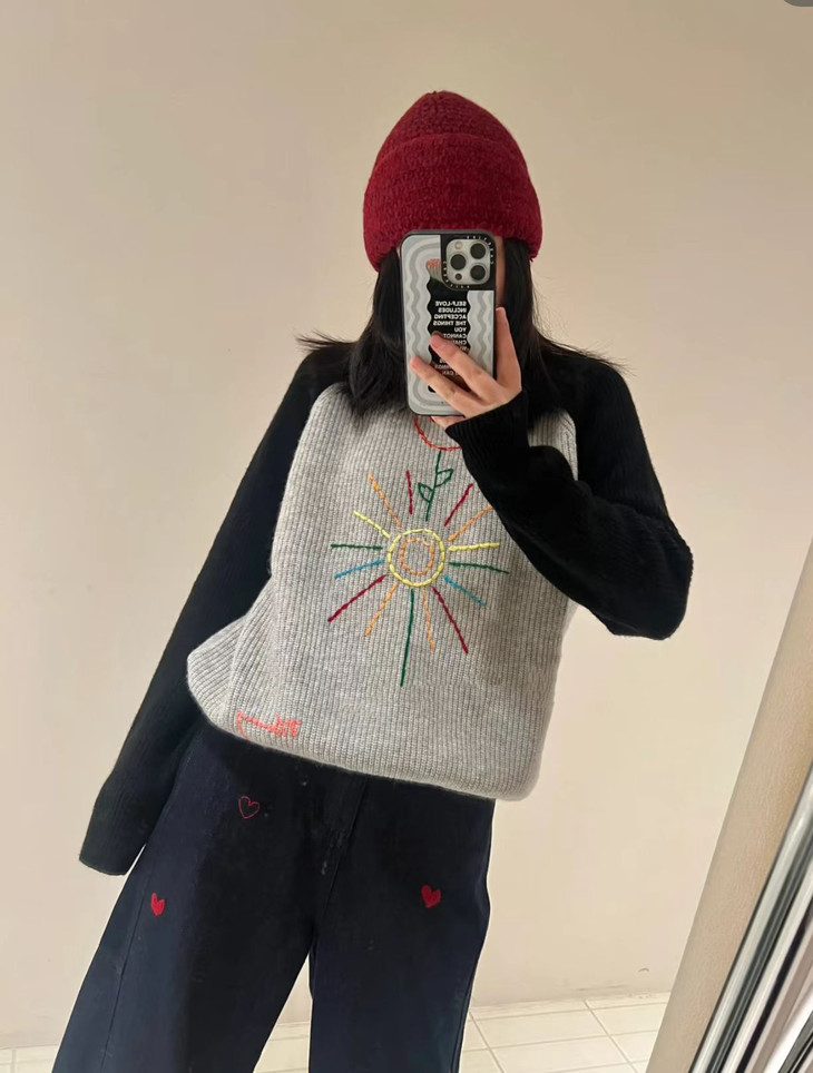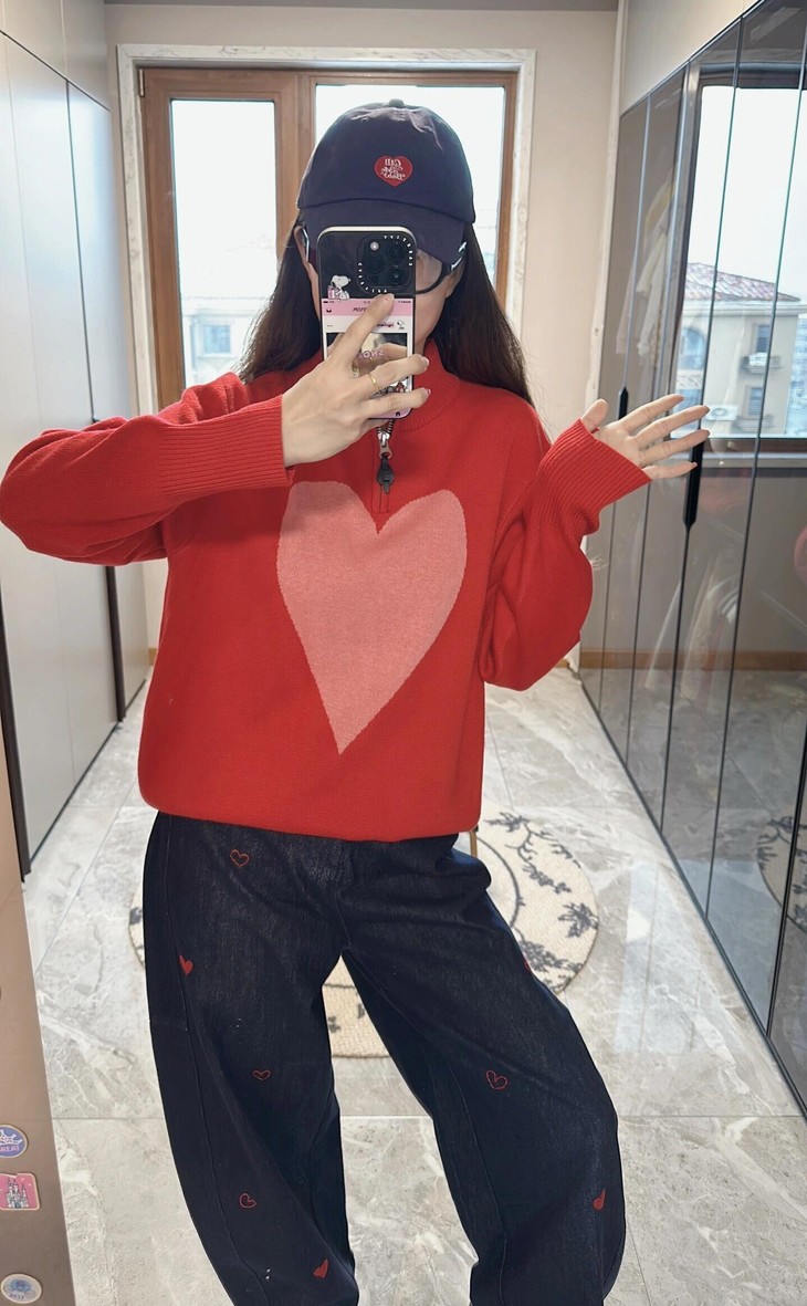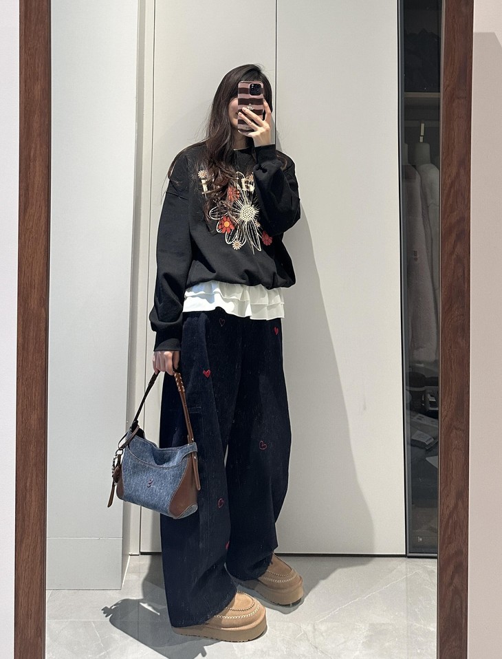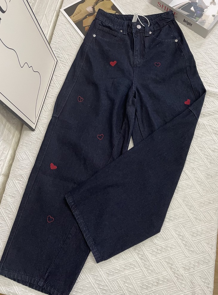 搭配上其实真的很简单: 早春的卫衣、毛衣、大衣都能轻松驾驭 比普通的牛仔裤肯定是更有特色的 穿搭小tips:上衣可以选择一些有亮点的 比如带点红色的花朵,可以和裤子上的爱心刺绣形成一个呼应效果