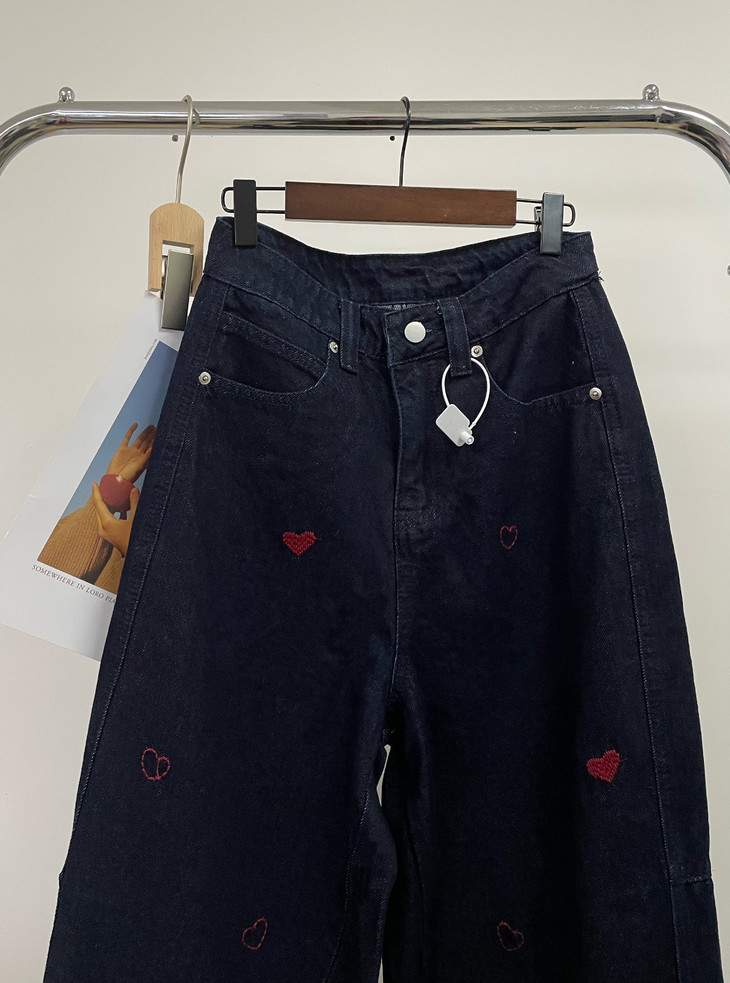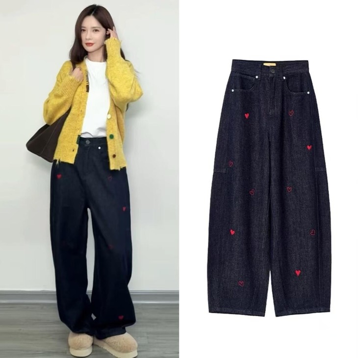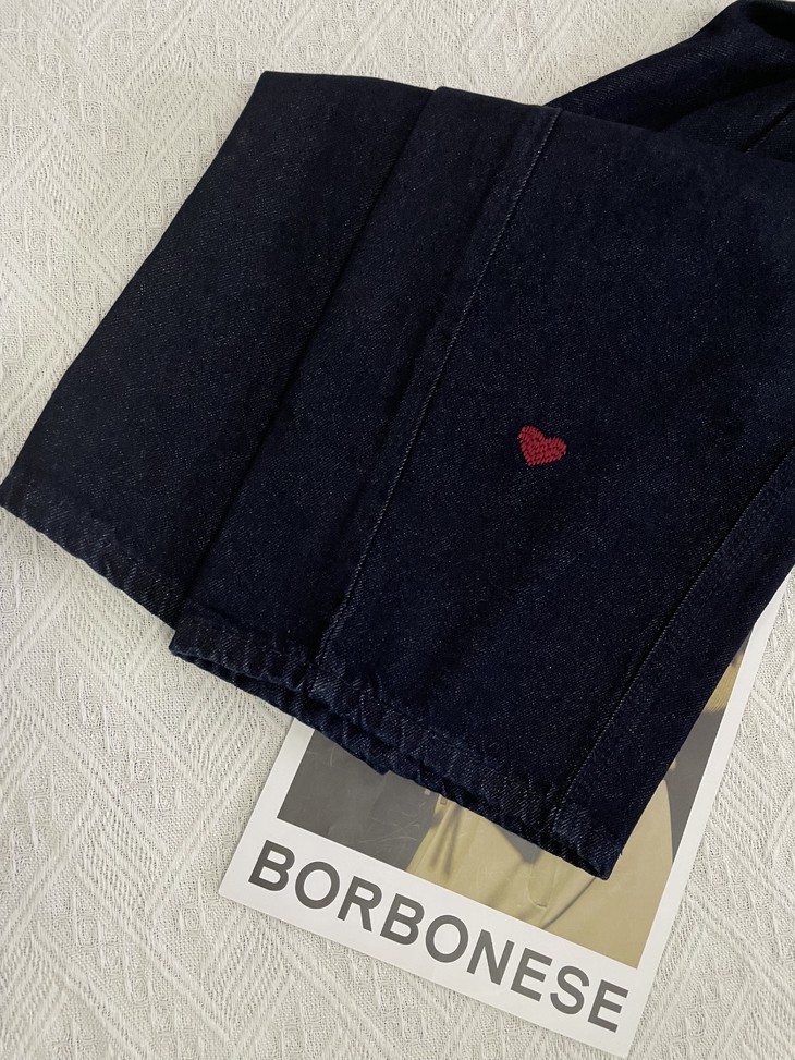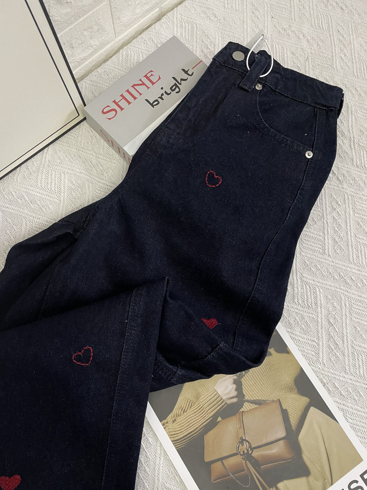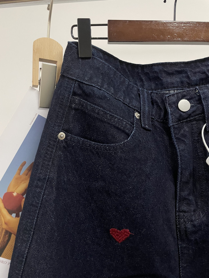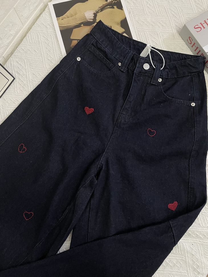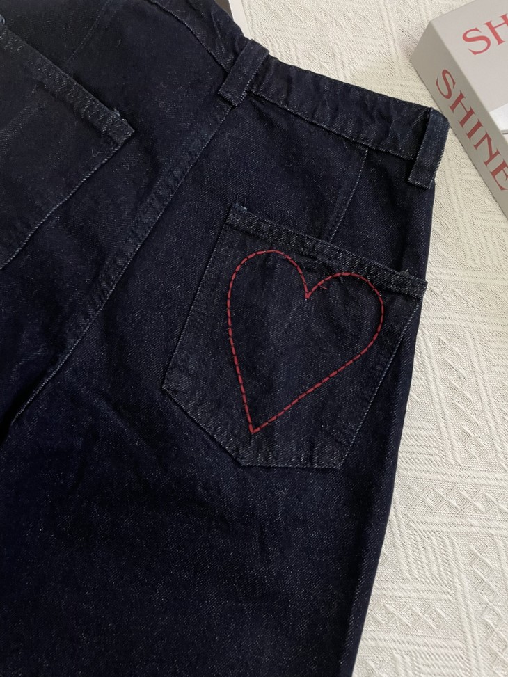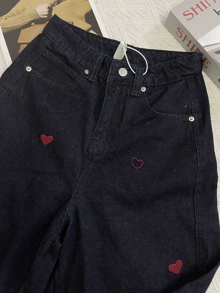 看看这裤型和刺绣,绝对又是王炸‼️ 爱心刺绣+弯刀立体剪裁 !显瘦遮胯 暗藏心机的明线立体弧形线, 一上身就是显瘦好穿,搭配率又高 实穿性强,想不到不买它的理由 而且是明星同款,价格上你们自行对比 我们家的价格真的很香了~ 蓝黑色的底色牛仔上,绣上红色的爱心♥️ 实心的、空心的,一整个爱住 普通的弯刀裤估计姐妹们已经看多了, 这样充满小心机的款式必须自留一条‼️