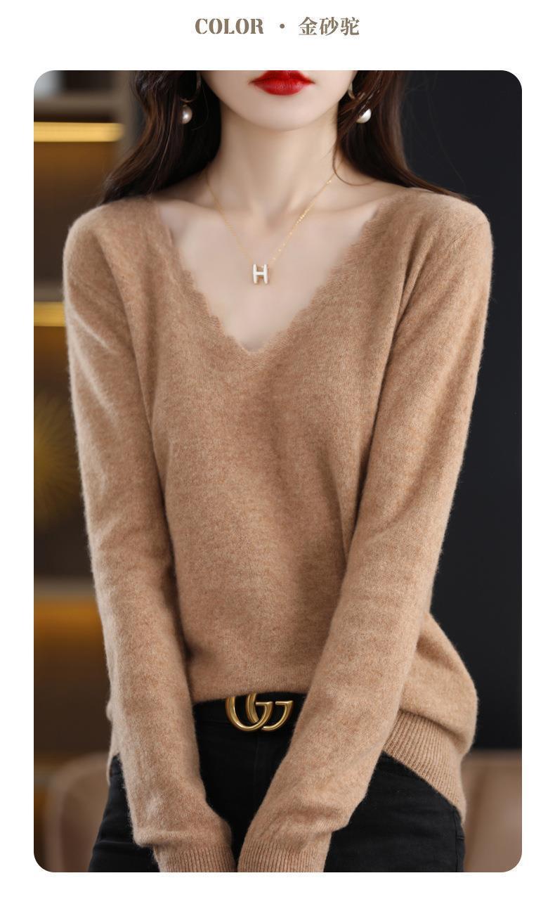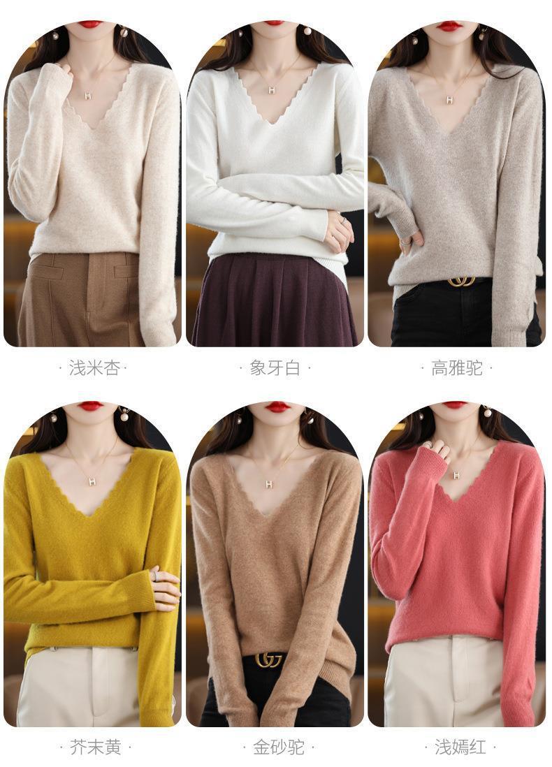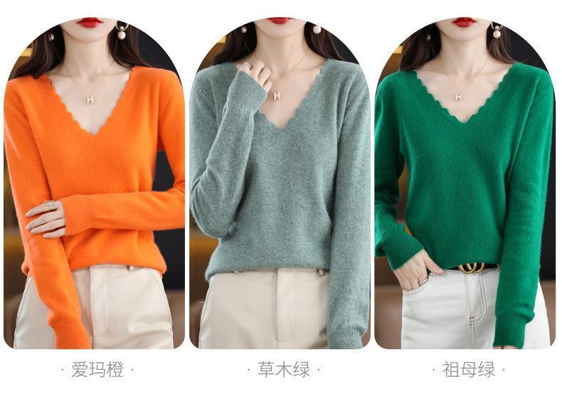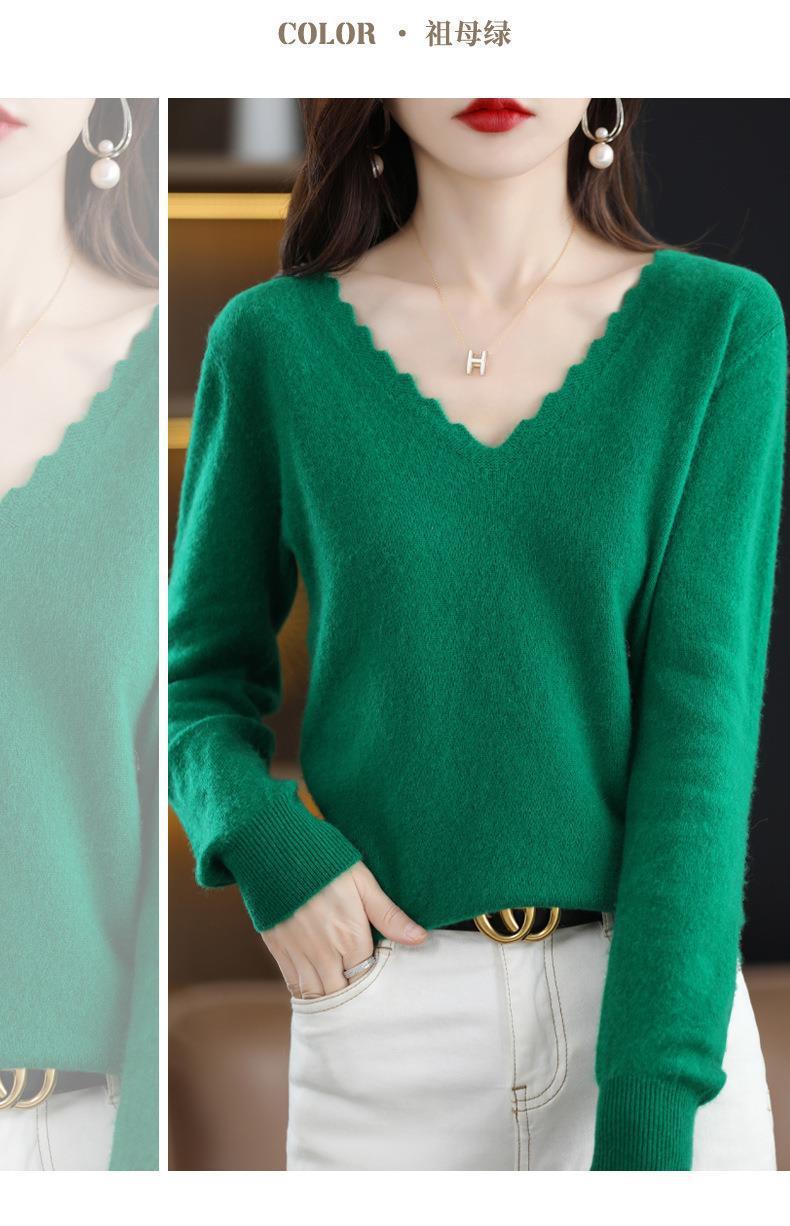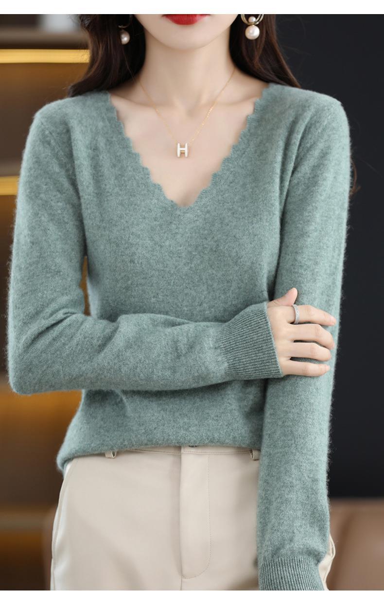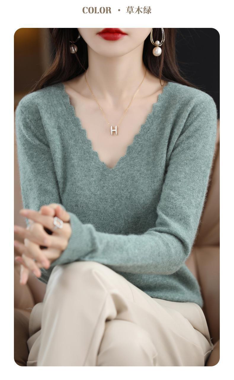 绿色性感毛衣花边V领女款长袖针织衫宽松显瘦打底衫纯色显瘦上衣