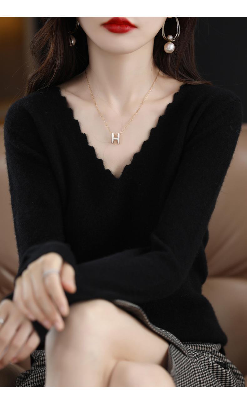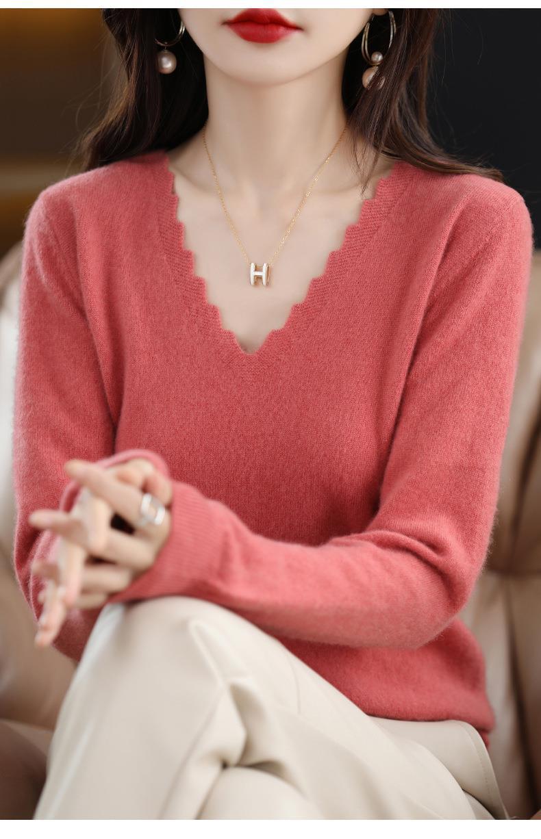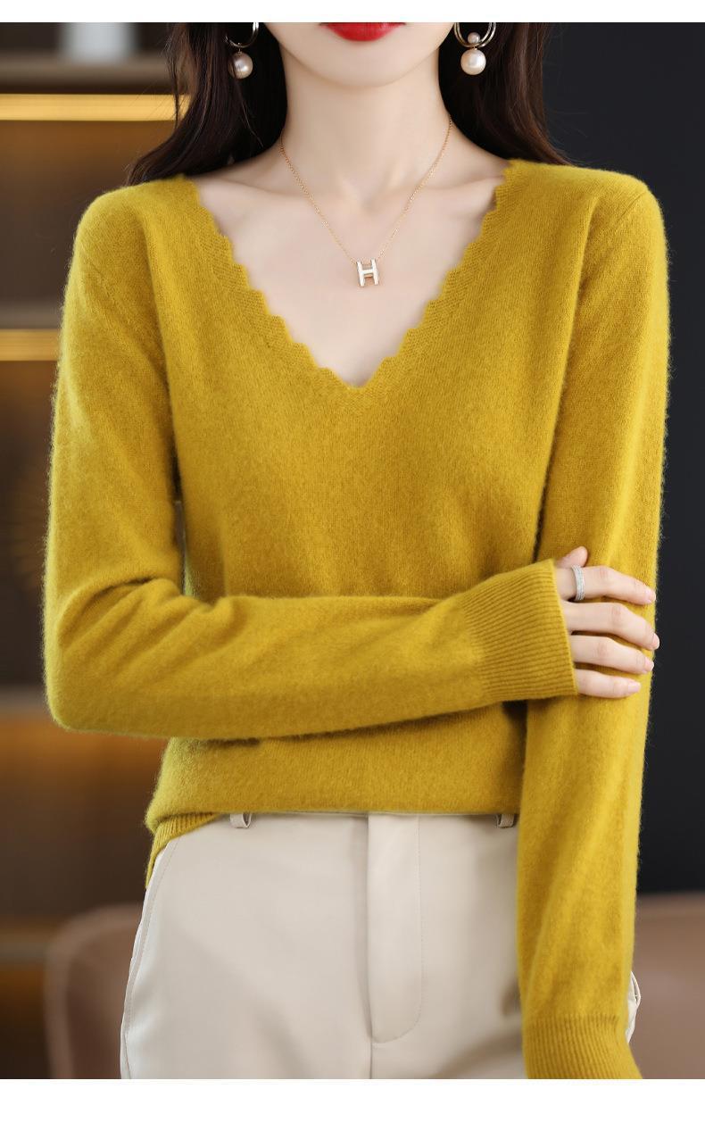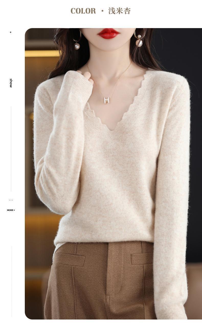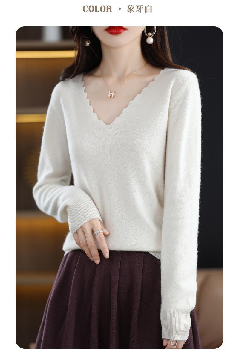 绿色性感毛衣花边V领女款长袖针织衫宽松显瘦打底衫纯色显瘦上衣