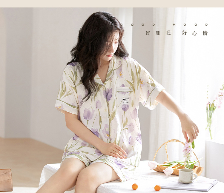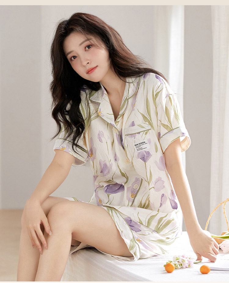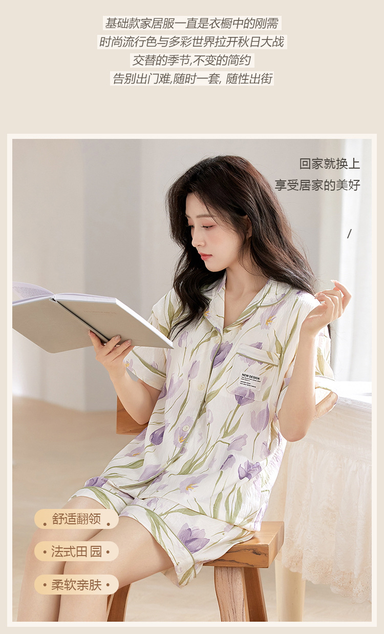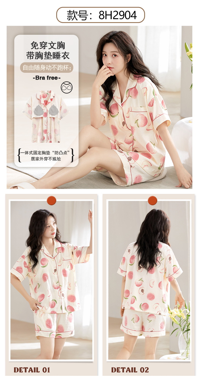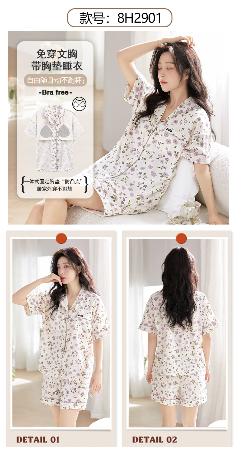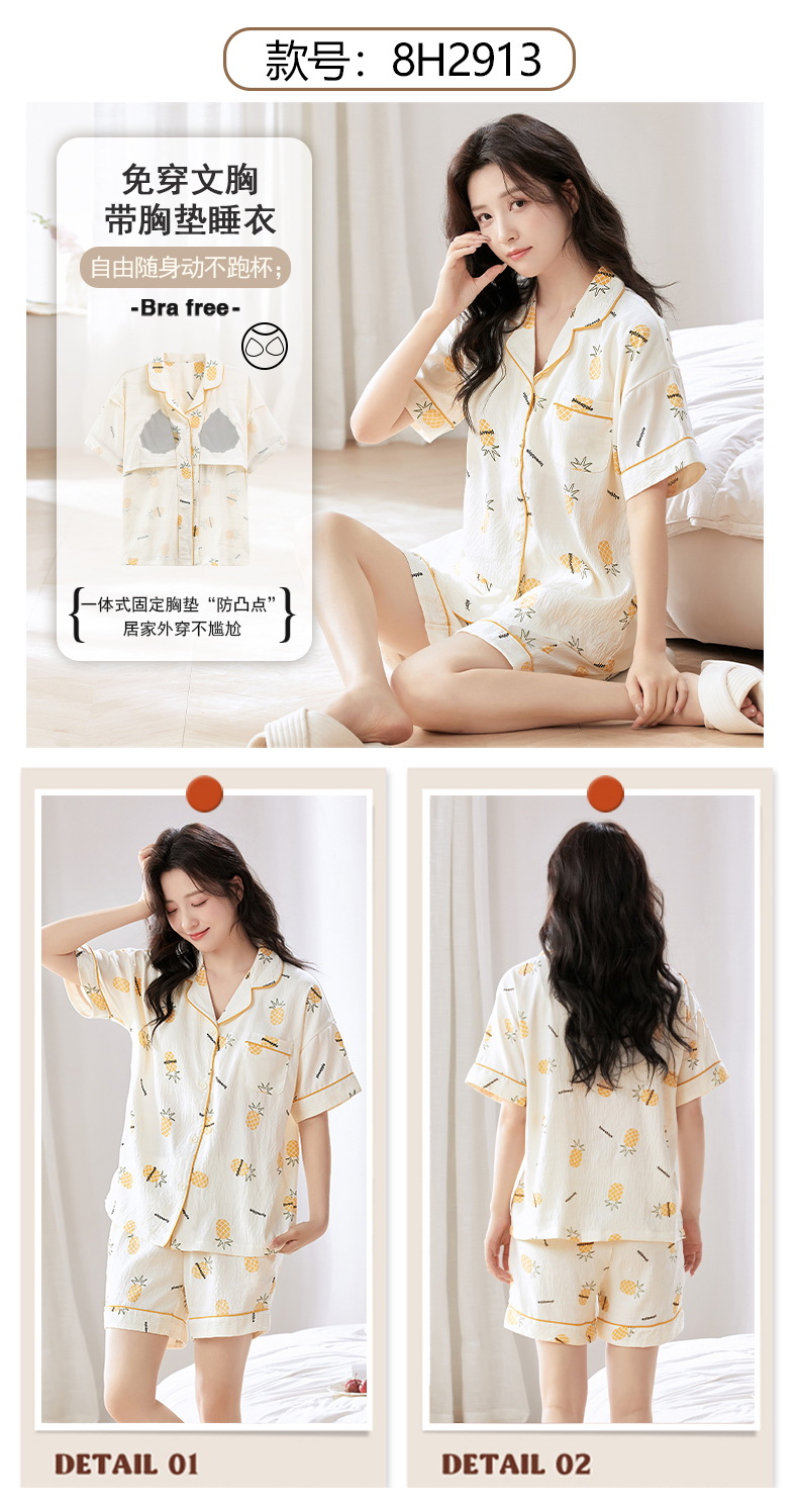 【带胸垫❗翻领云朵棉睡衣】免穿文胸宽松舒适,经过水洗+柔软的工艺,贴身轻薄透气面料,夏季卡通短袖短裤家居服免穿文胸可外穿睡衣QQ