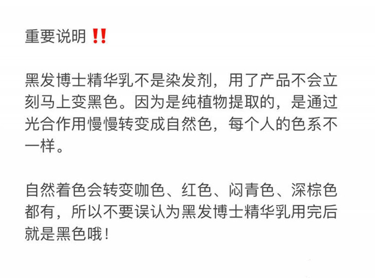 2.乌发乳用15天左右达到自己满意的发色后,停用3-5天,给头发一个适应期来吸收营养,再继续使用时,根据自己头发的变色情况来自行决定使用频率。