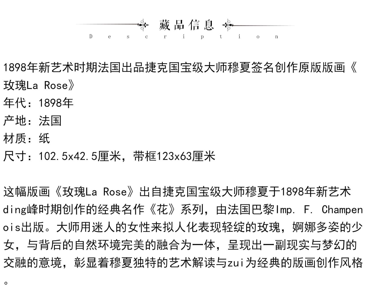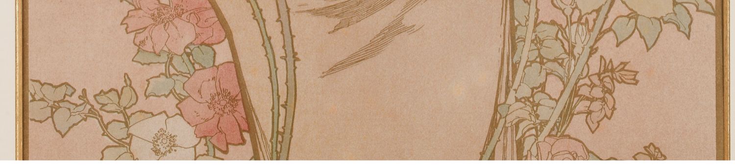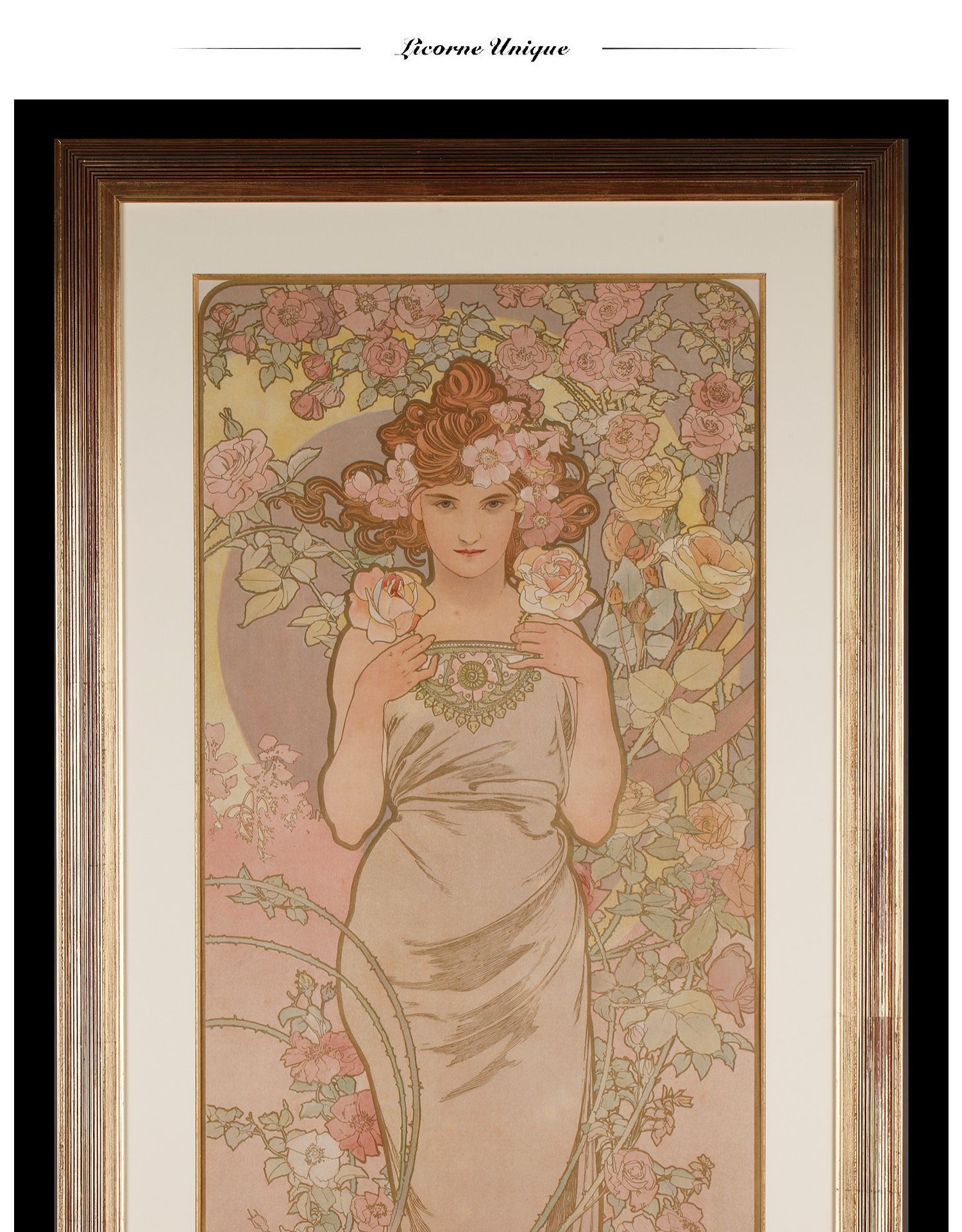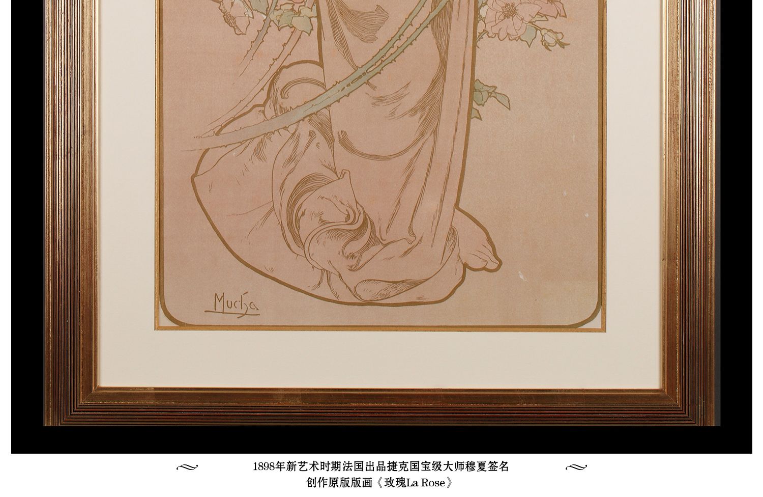 独角鹿西洋古董新艺术时期穆夏签名创作原版版画《玫瑰La Rose》