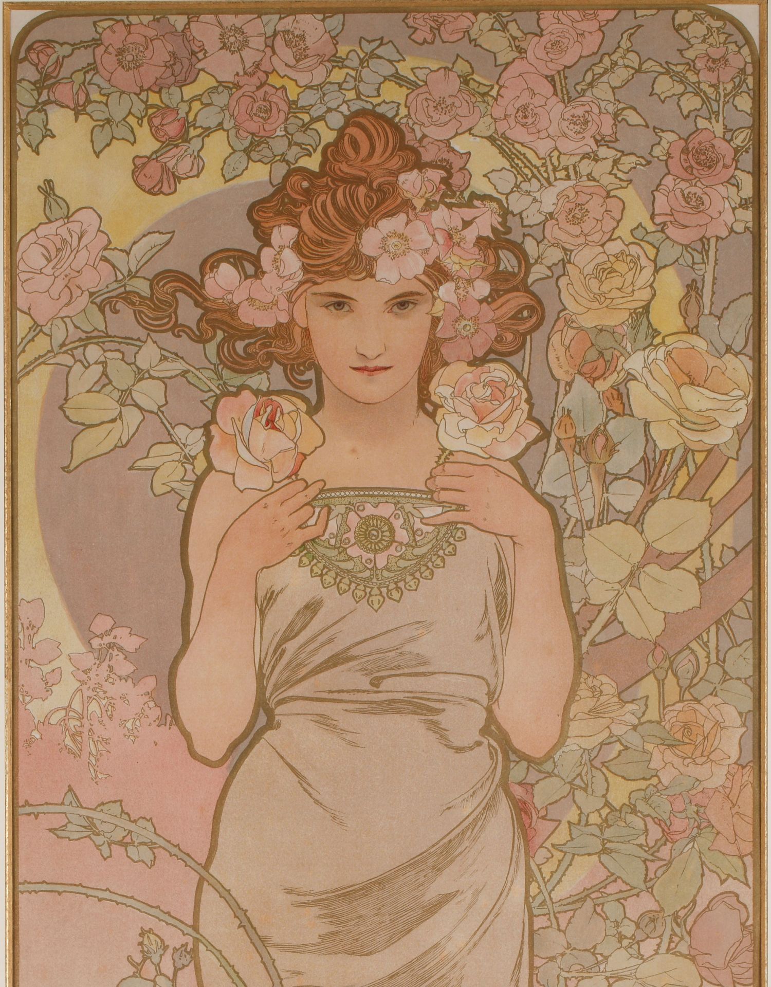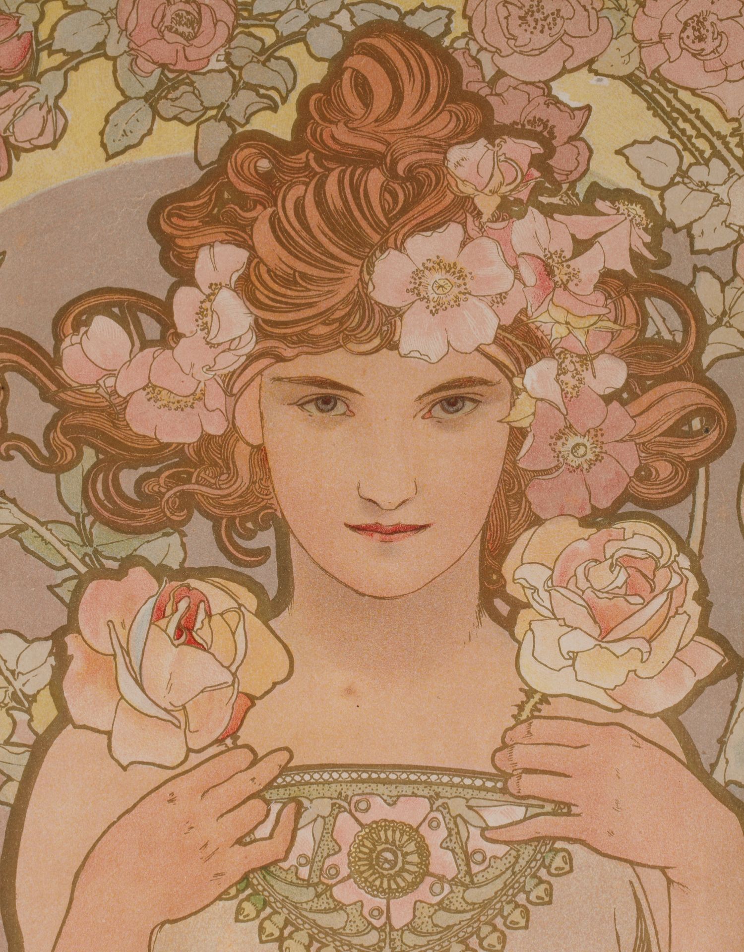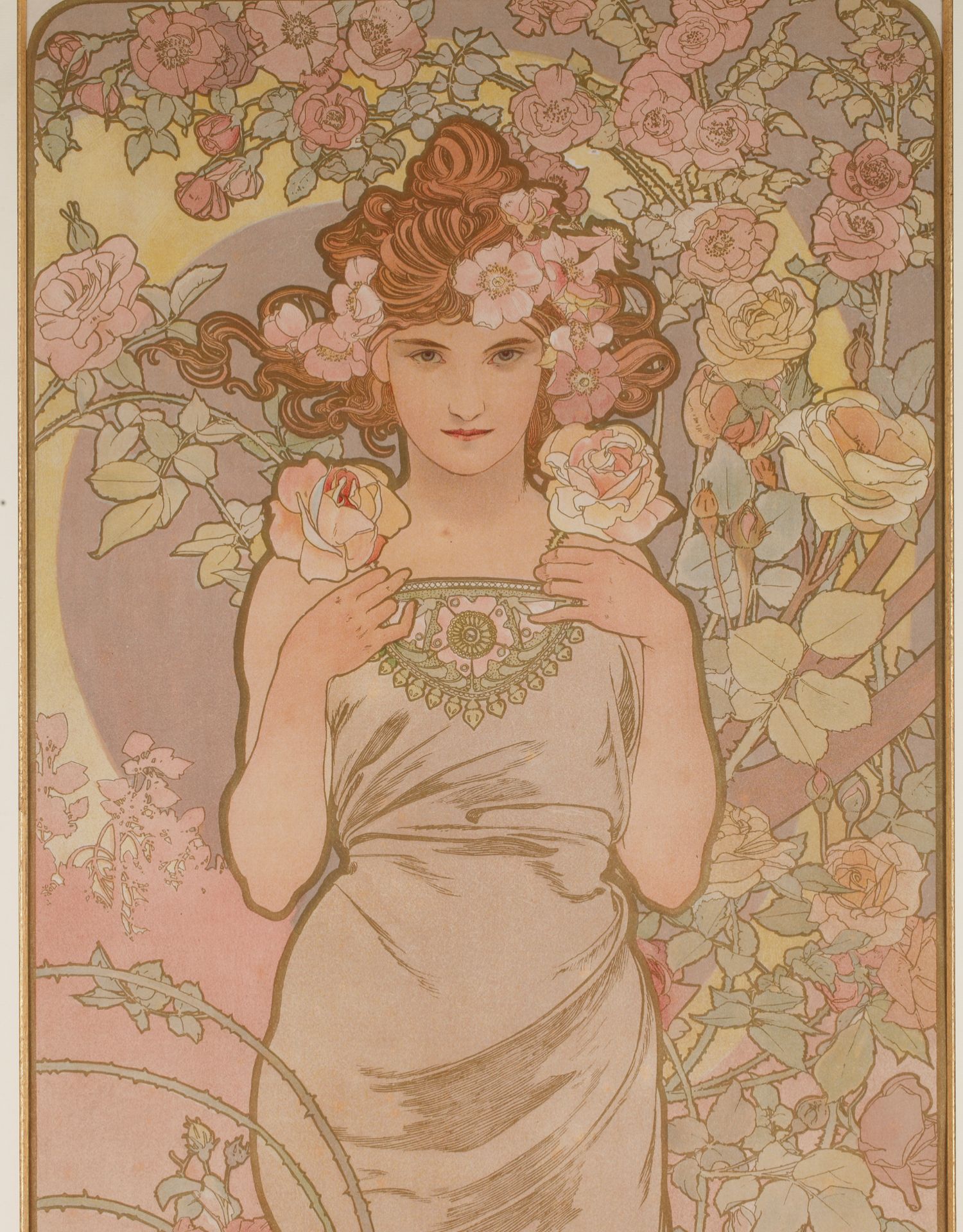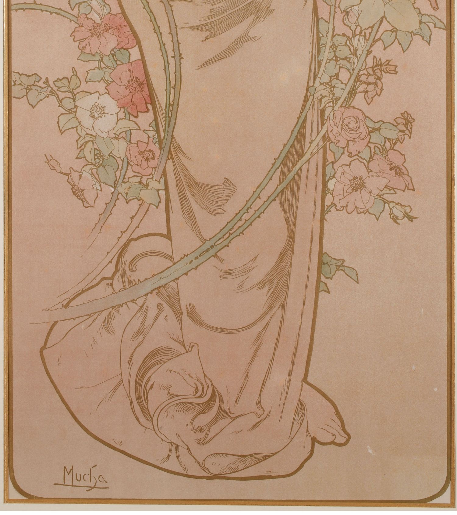 独角鹿西洋古董新艺术时期穆夏签名创作原版版画《玫瑰La Rose》
