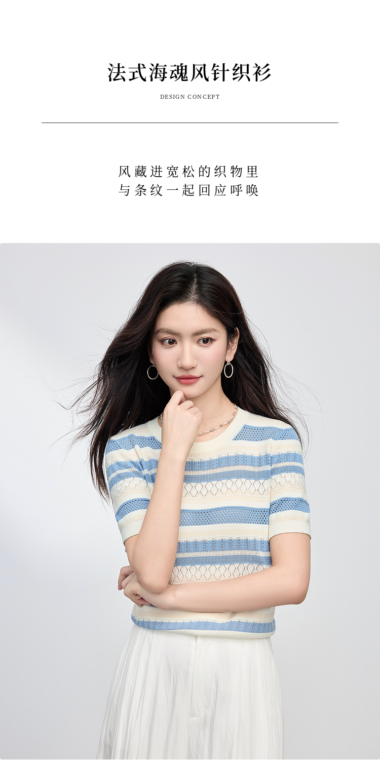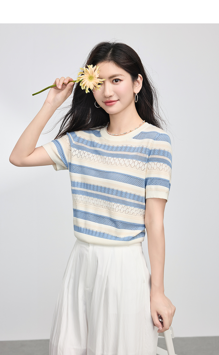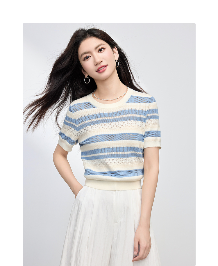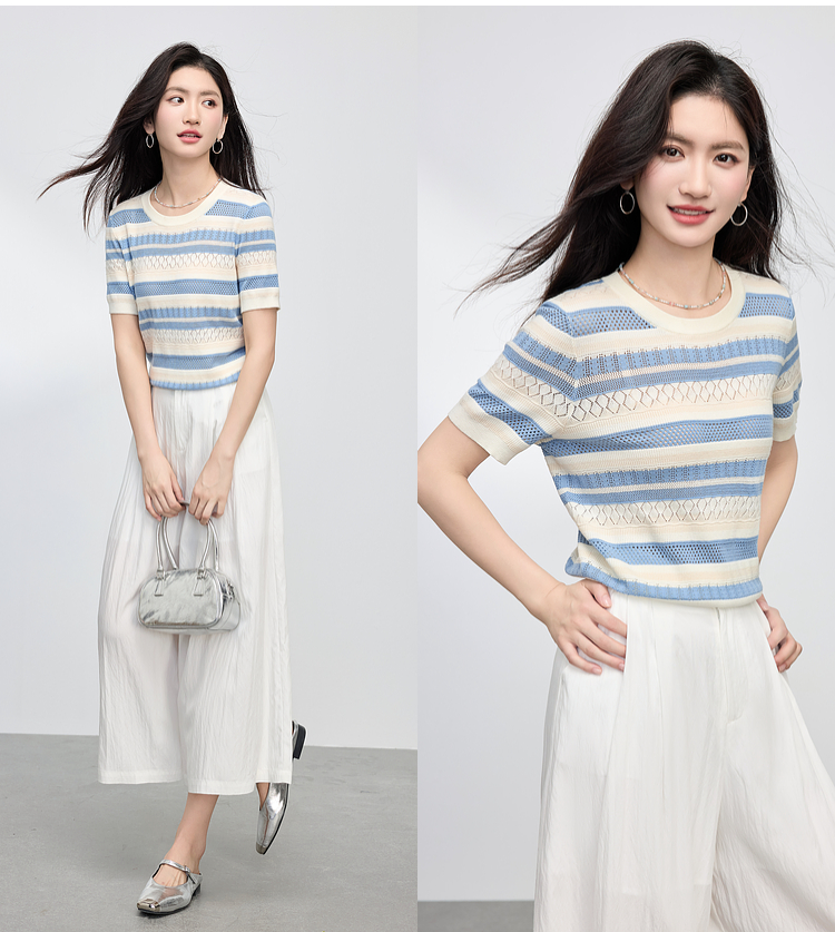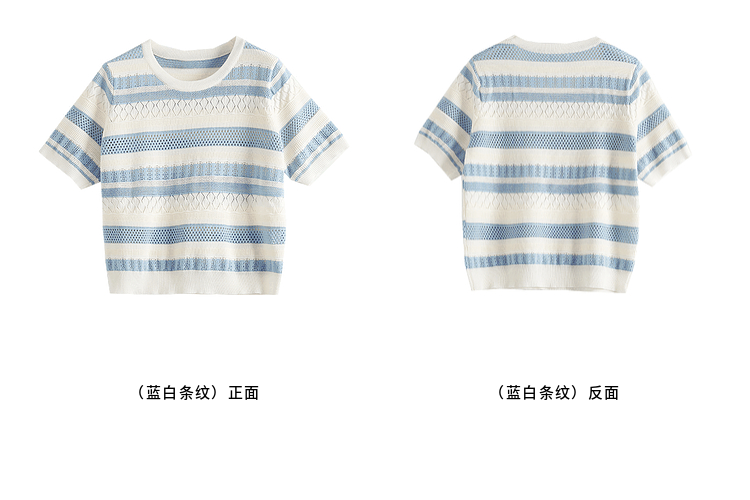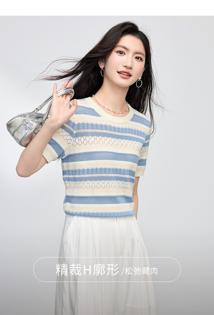 【夏季新品】熙世界法式撞色条纹镂空薄针织衫女短袖圆领冰丝上衣2025夏日新款