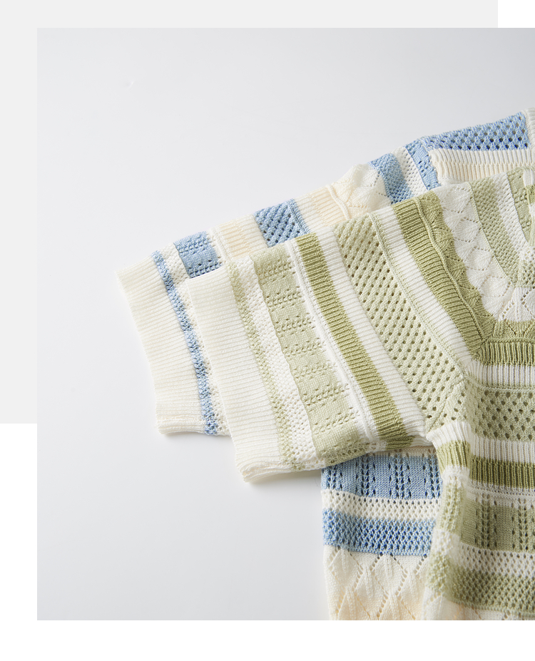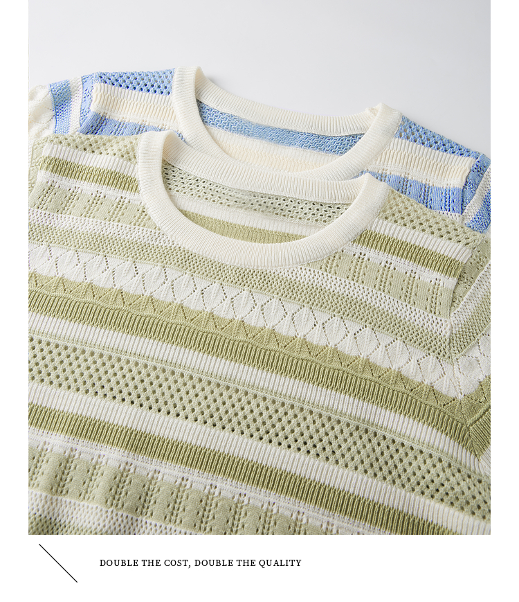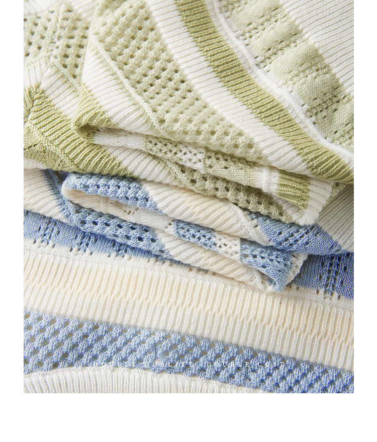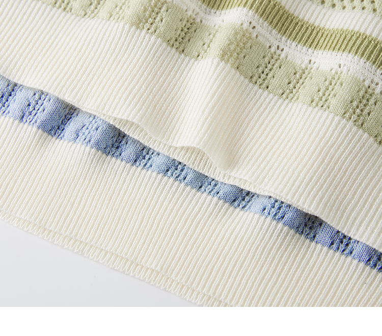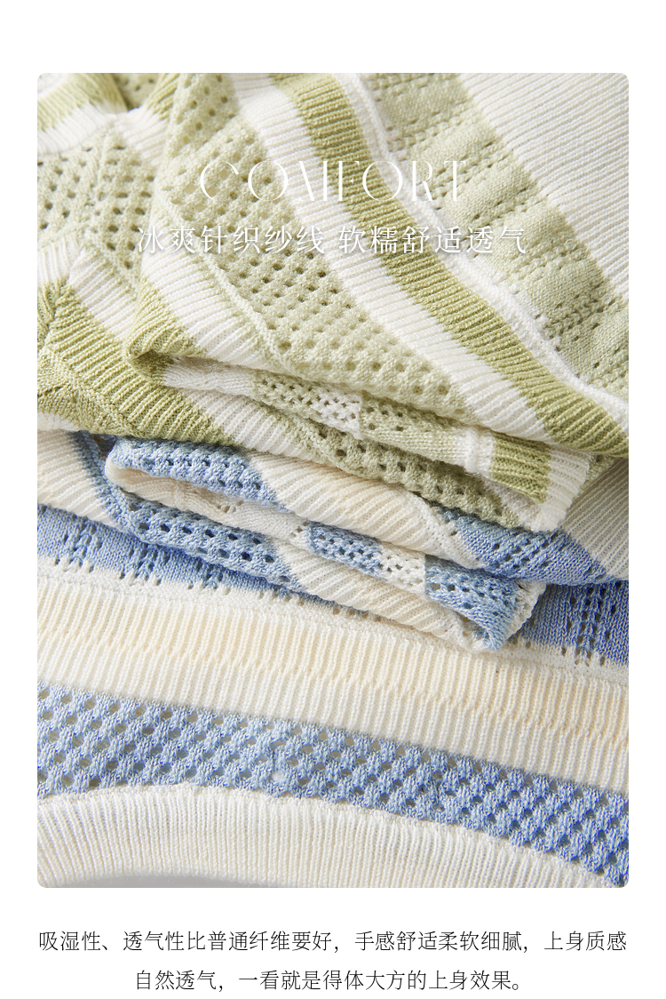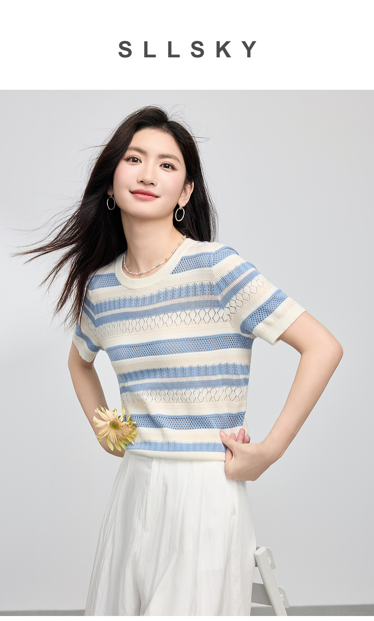 【夏季新品】熙世界法式撞色条纹镂空薄针织衫女短袖圆领冰丝上衣2025夏日新款