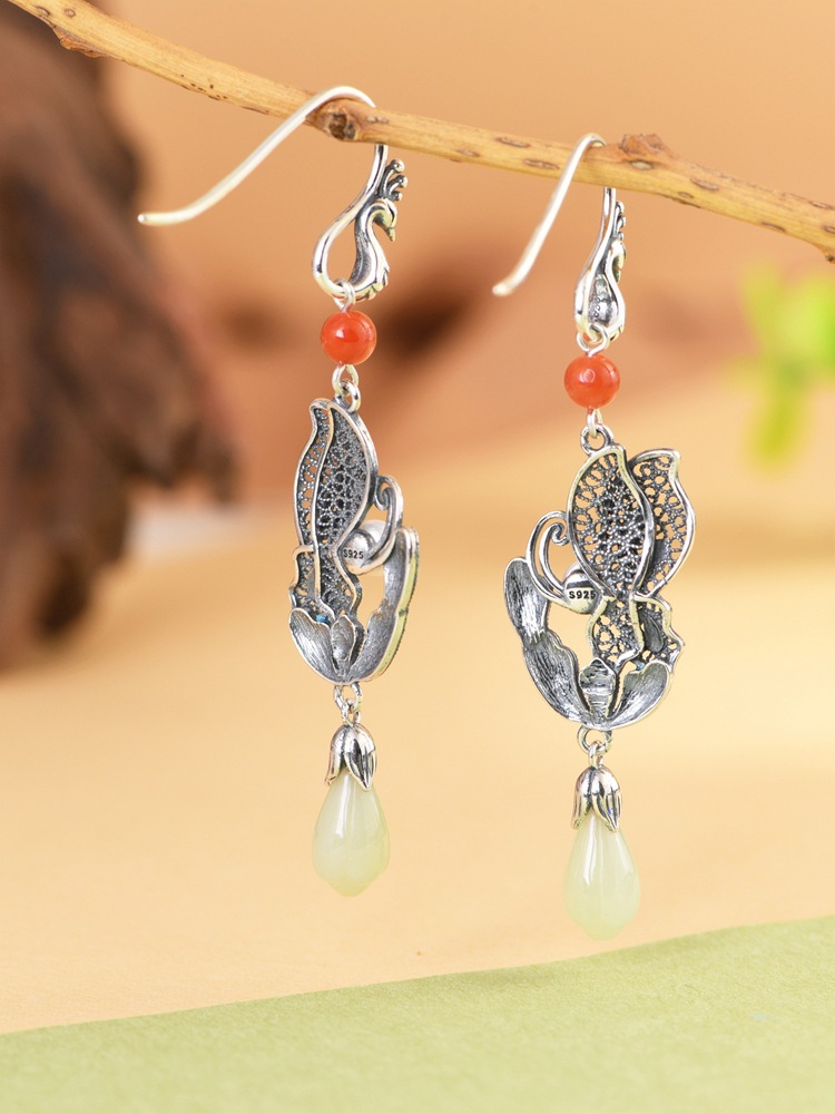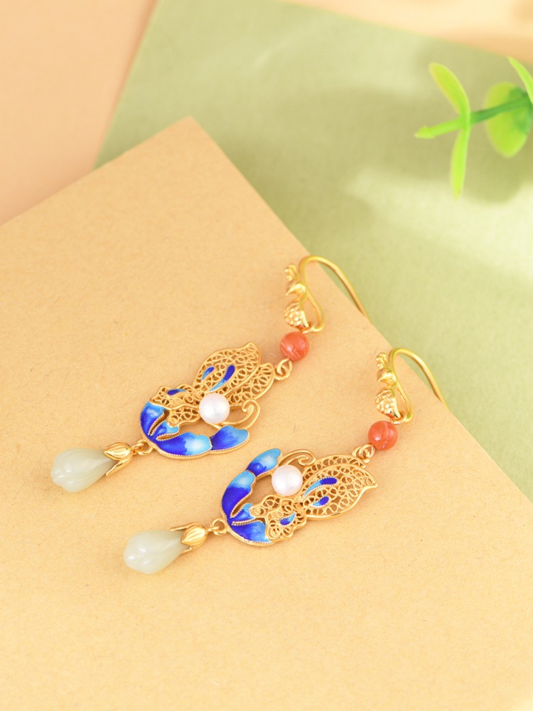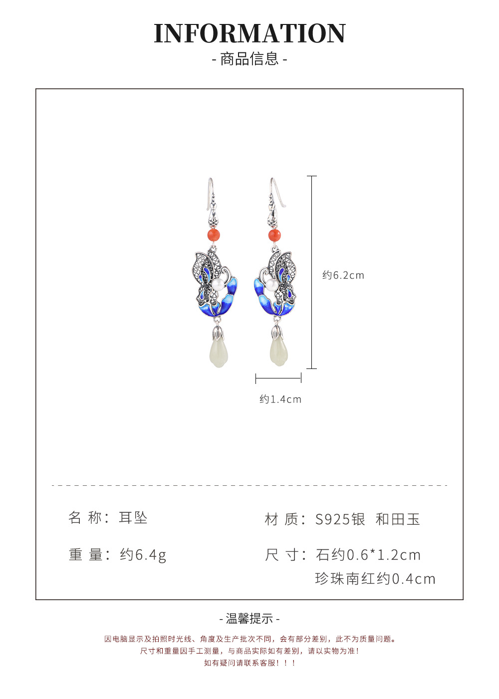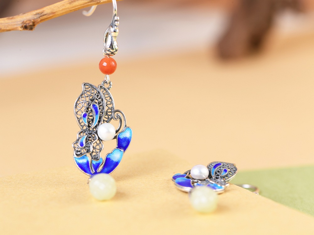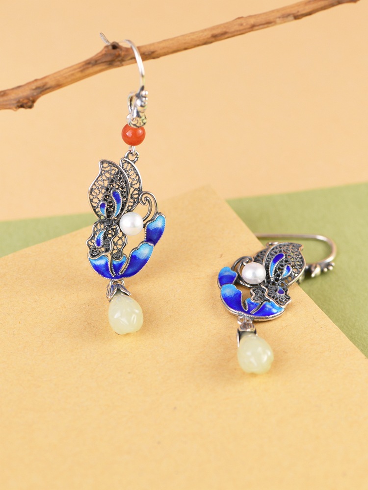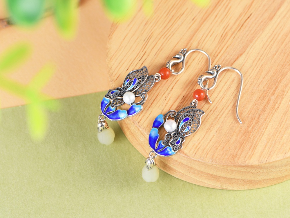 【蝴蝶破茧】S925银复古景泰蓝蝴蝶珍珠和田玉耳坠【SCH-TRS31844】