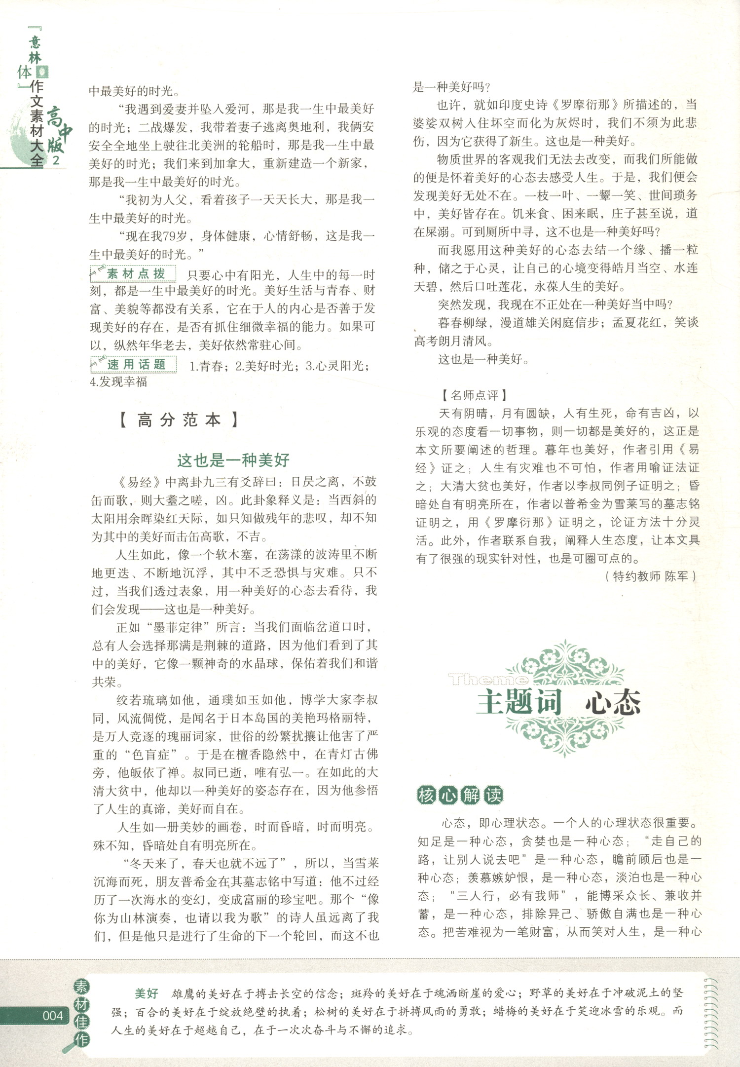 ★很好、很值、素材很多。以前高一高二写作文一直烦恼没有素材用,有些素材都用烂了,这本书很适合高中生,对写议论文有一定的帮助,而且素材很齐全,立意很深,分类很清晰很全面。感觉对自己的帮助很大,是一本很不错的书,推荐!期待第二本!