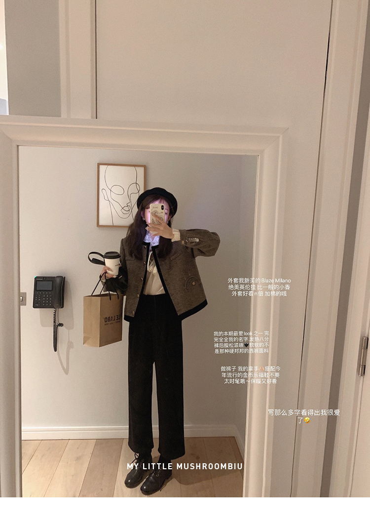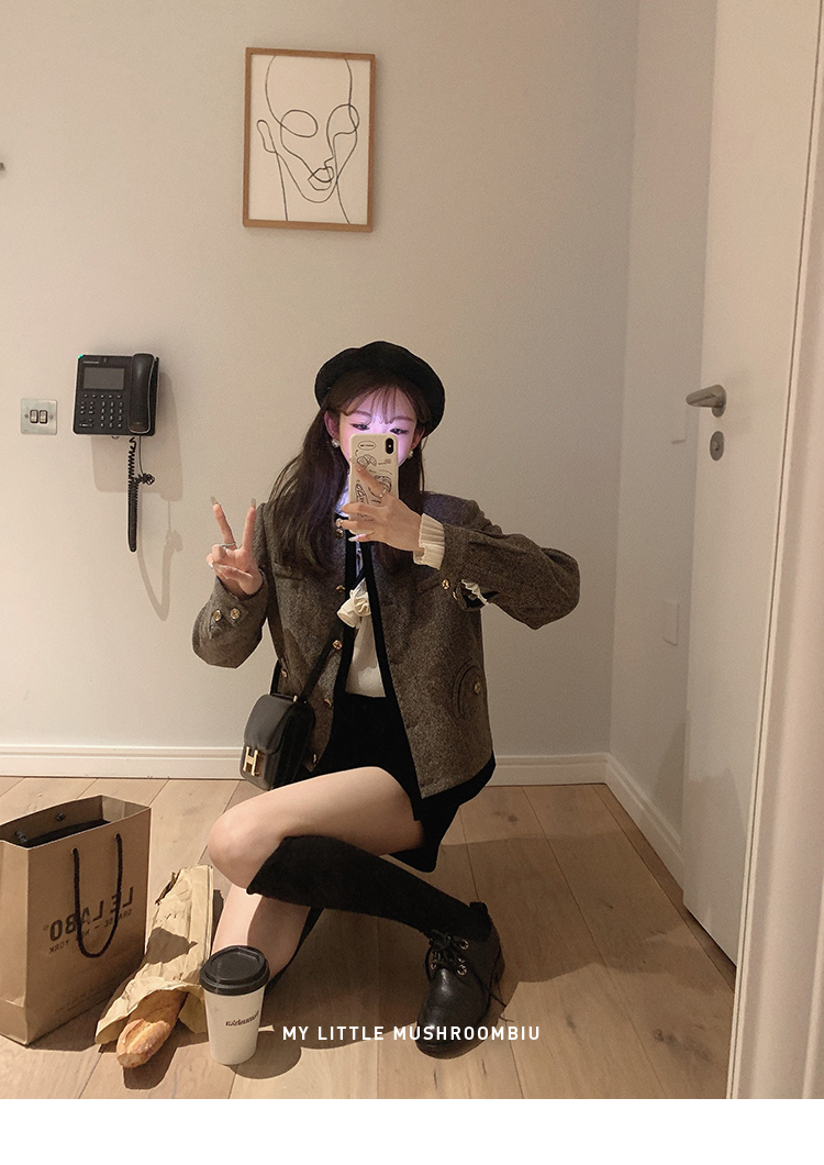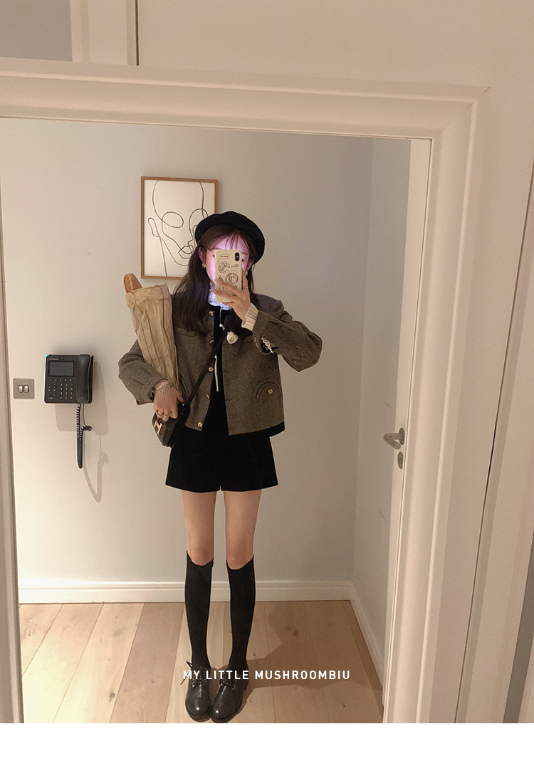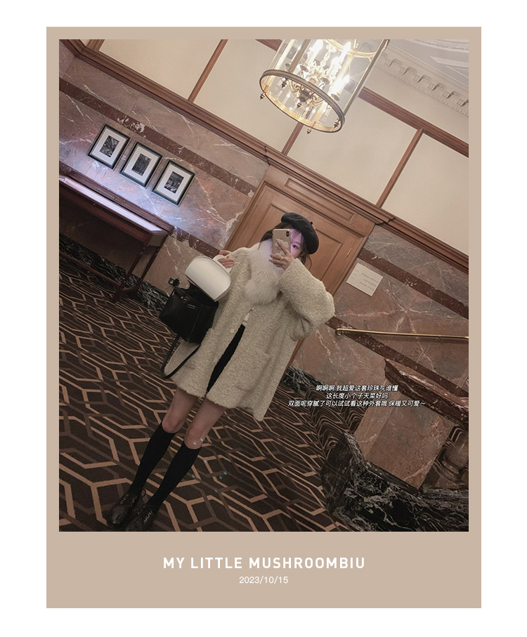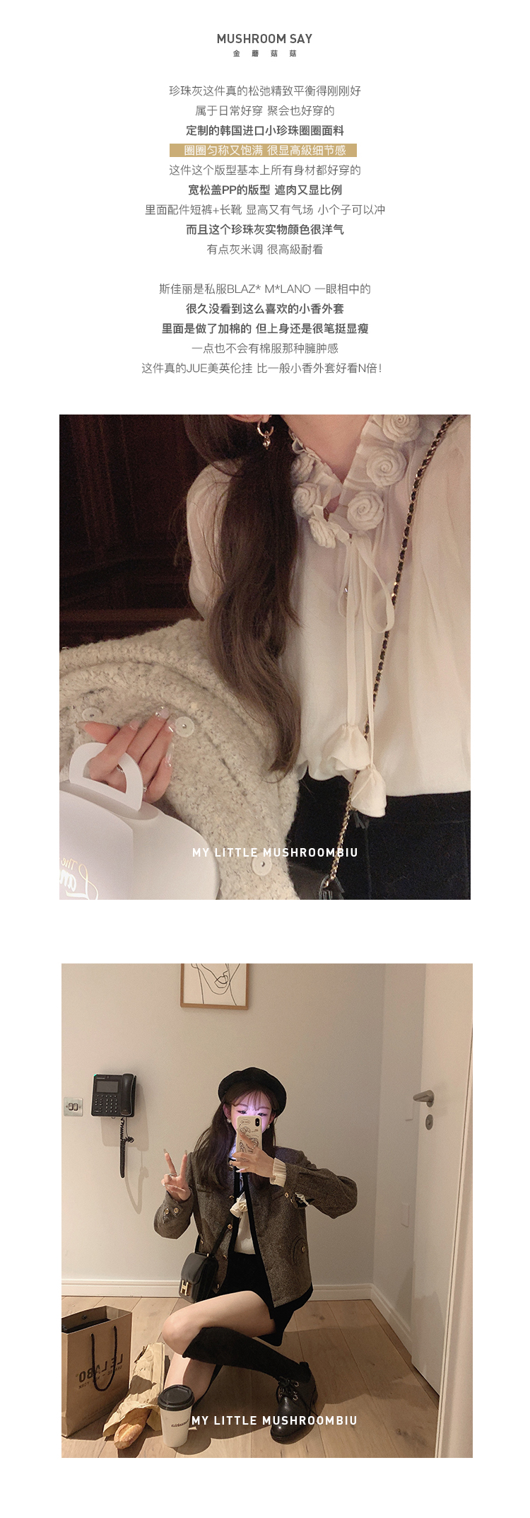 珍珠灰外套:面料:20%羊毛80%聚酯纤维 斯佳丽外套:面料A:100%羊毛 面料B:90%锦纶 10%粘纤 玫瑰衬衫:68%莱赛尔 32%聚酯纤维 丝绒短裤:面料:90%锦纶10%粘纤 毛毛领:狐狸毛.
