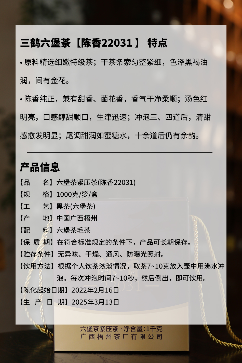 三鹤六堡茶紧压茶(陈香22031)特级黑茶广西梧州茶厂陈香甜香菌花香2斤