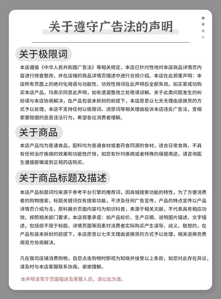 1、店铺商品按物流声明、规格说明安排发货。下单前请仔细阅读商品详情,食品类商品一经售出非质量问题恕不退换。