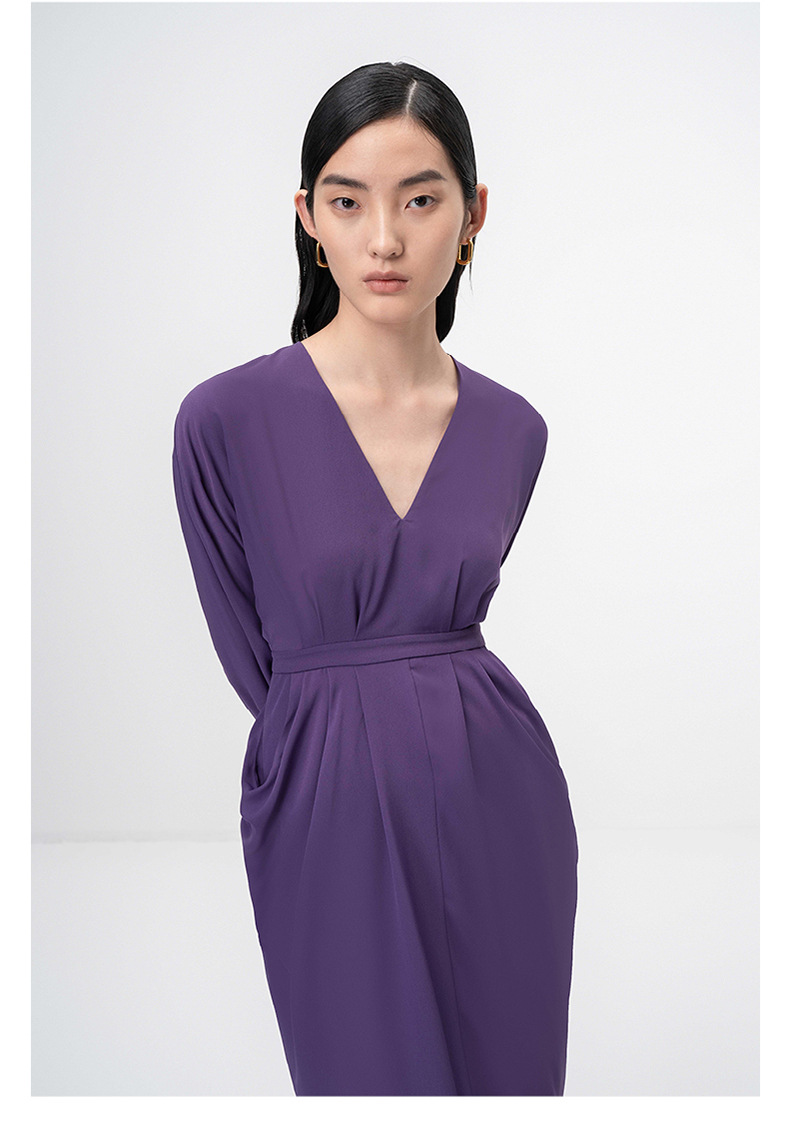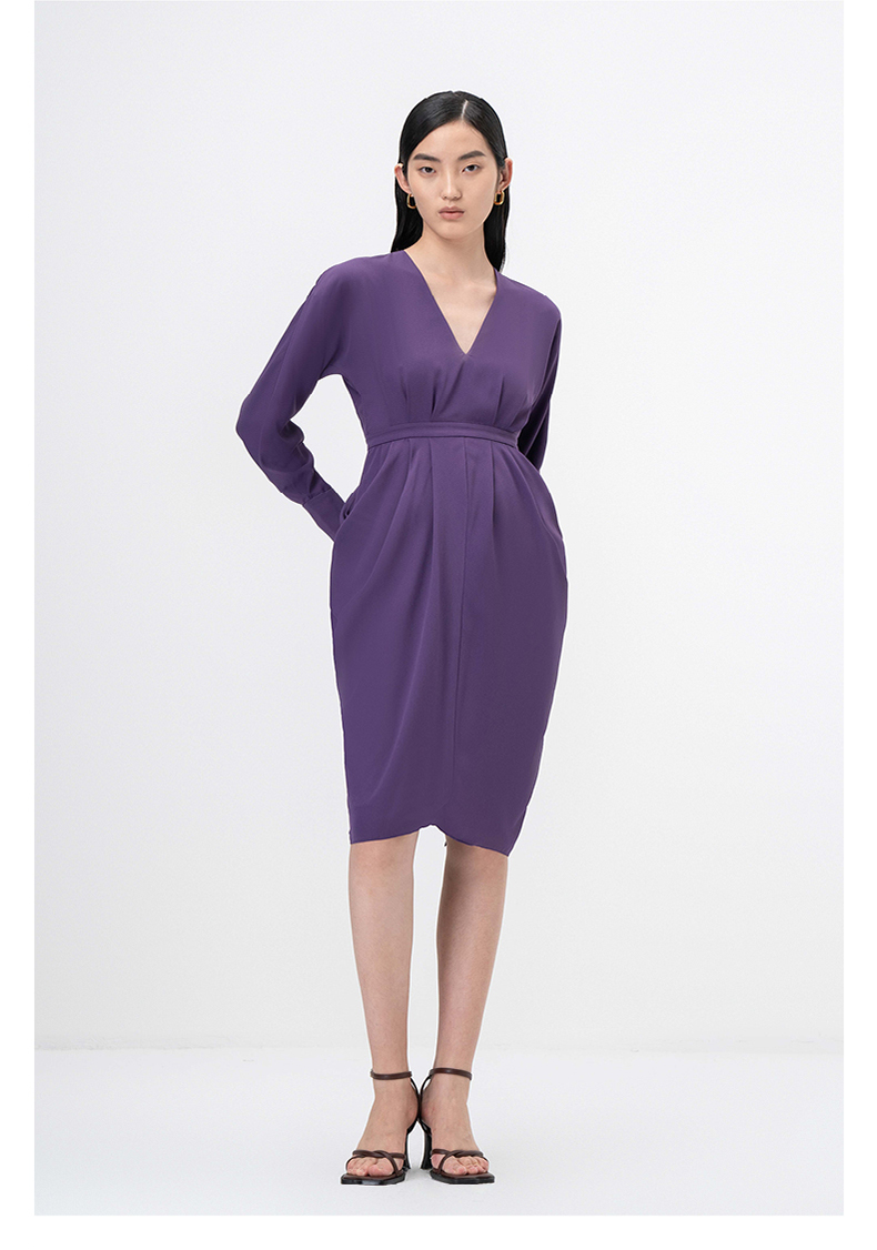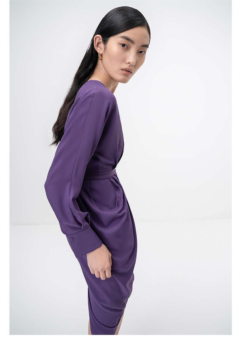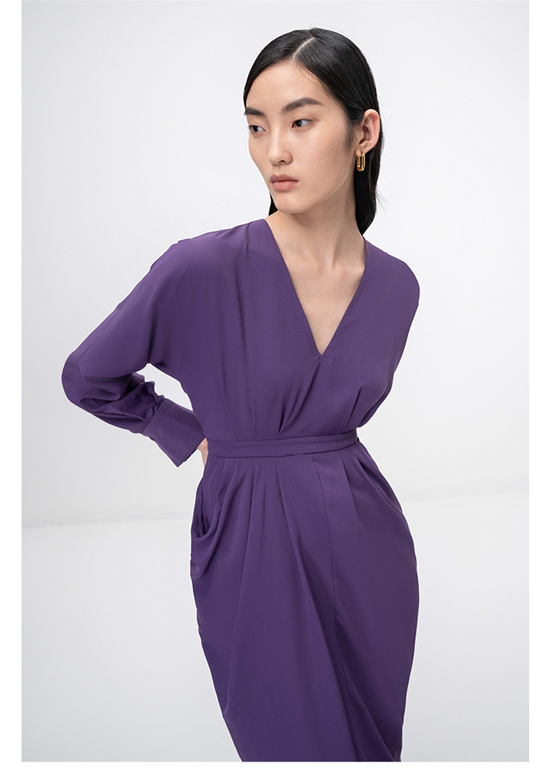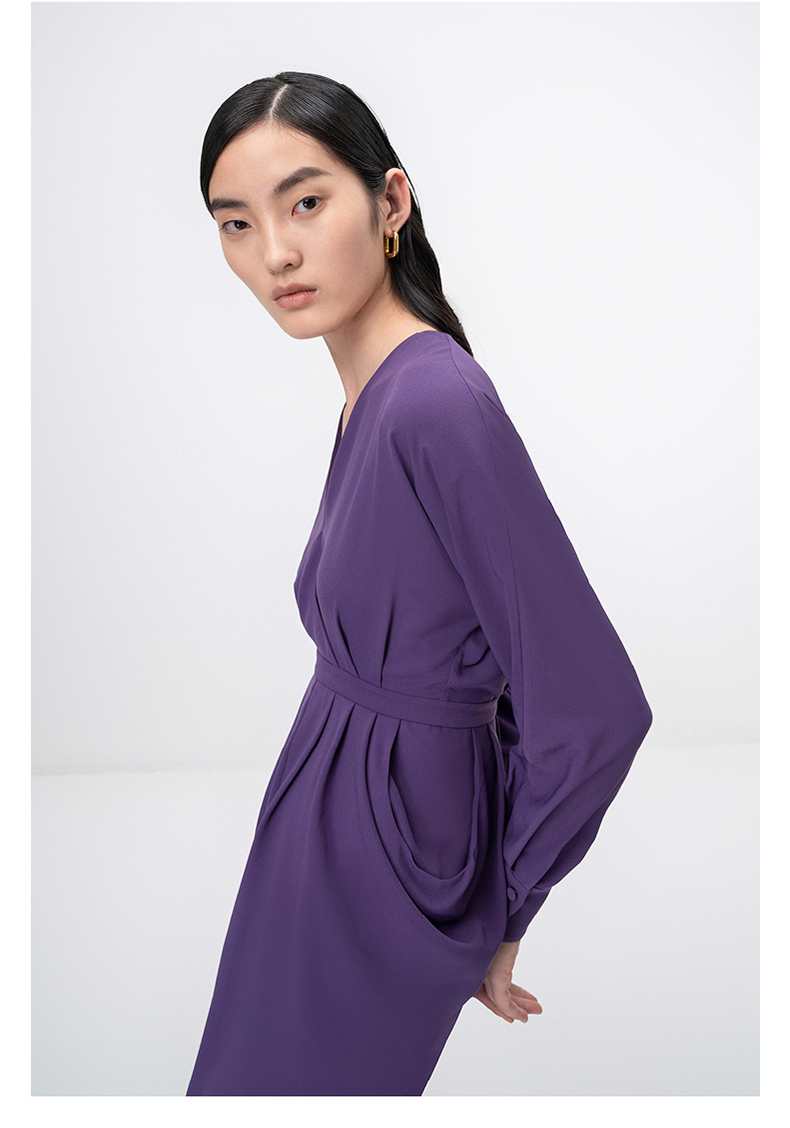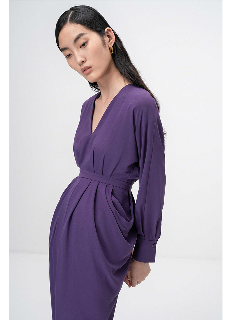 【落纹】浓郁紫立裁垂褶V领收腰长袖连衣裙/0000749B