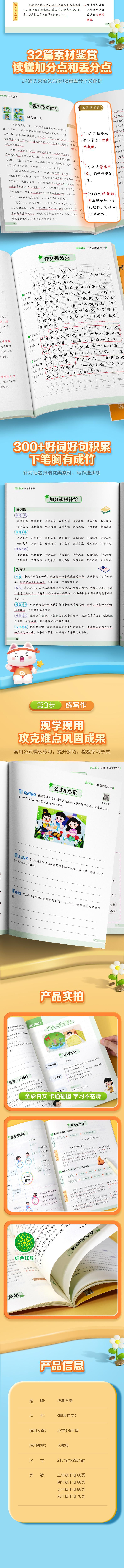 本书是小学语文的写作指导加训练的作文练习册。作文写作是小学到高中必考题型,在整个语文课程中至关重要。本书的内容设置与教材同步,按照课文的单元话题进行针对训练,学生可以边学边练。本书以单元为单位,每个单元首先是习作要素解读,对于每个单元的主题进行详细解析,并给出对应的写作方法技巧解读,让学生掌握基础的写作方法。本书还会提供主题写作的思维导图,提供具体的习作方向指导,让学生掌握多角度写作。思维导图之后是优秀示例和小题试写,给学生以直观的写作素材和练习。题型也是难度逐渐提升的设置,从填空—写句子—写段落,以及到最后的分析整篇作文并尝试自己进行主题写作。这样的一个学习过程让学生能实现边学边练,练习难度逐步提升,帮助学生实现轻松掌握写作。