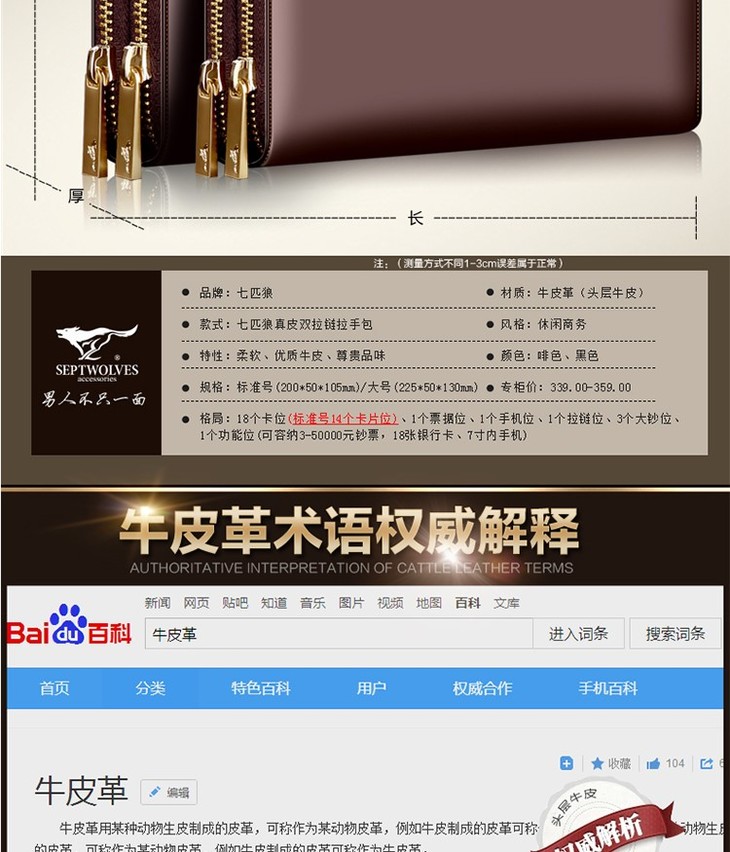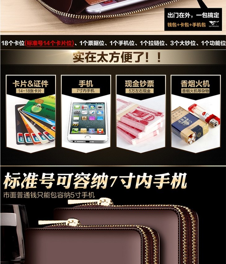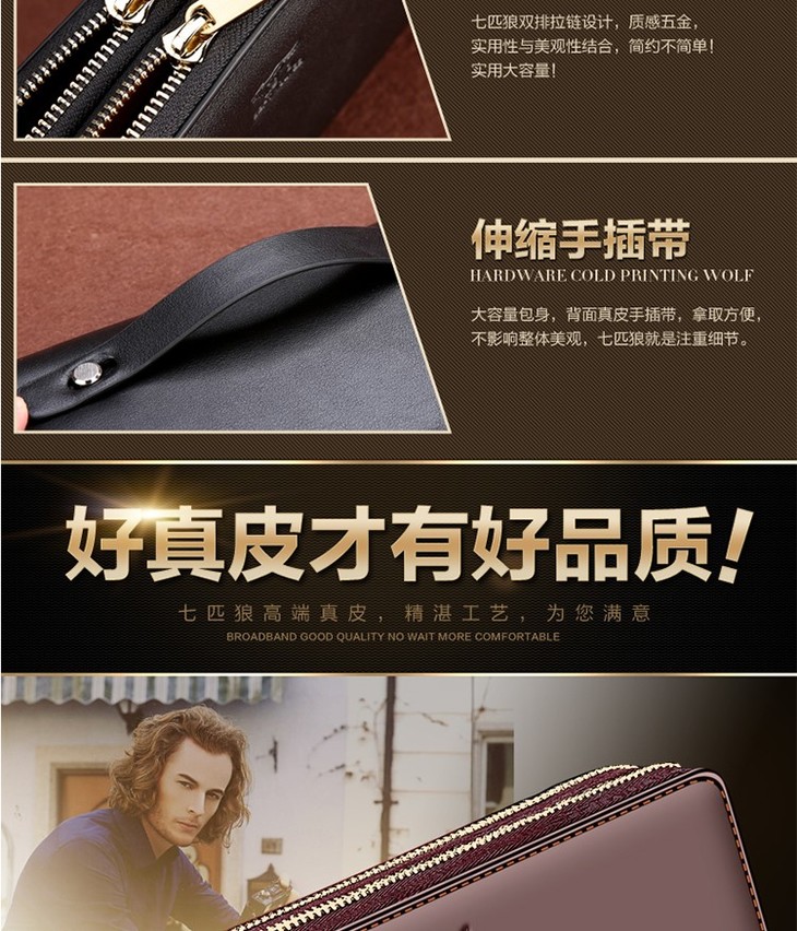 七匹狼 男士手包大容量双拉链手拿包头层牛皮多功能手抓包 1A2154083-01/02黑色小号/咖色小号