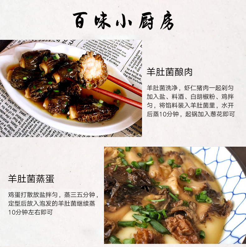 野生羊肚菌“性平、味甘,具有益肠胃、消化助食、化痰理气、补肾、壮阳、补脑、提神之功能,对脾胃虚弱、消化不良、痰多气短、头晕失眠有良好的作用。