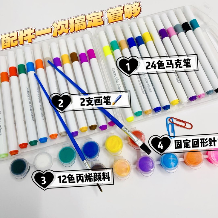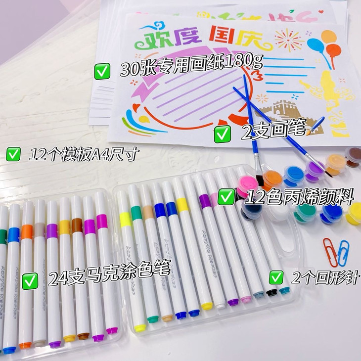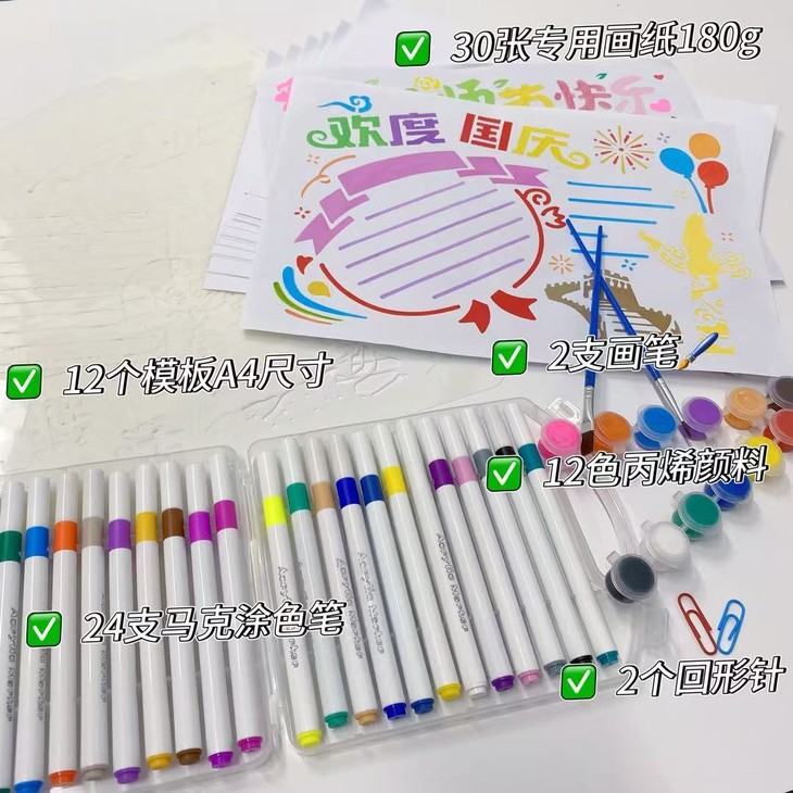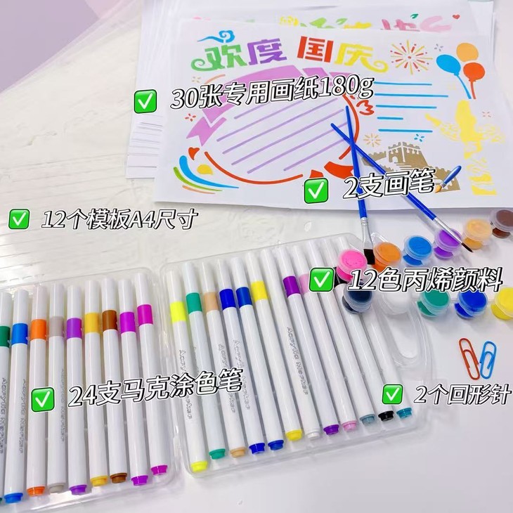 套装包含:节日主题/校园主题(自选) 1、12个pet手抄报模板A4尺寸(主题自选) 2、30张手抄报专用纸(荷兰白卡纸) 3、24色马克笔(带收纳盒) 4、12色丙烯颜料 5、2支涂色笔(一大一小) 6、2个可固定画纸回形针