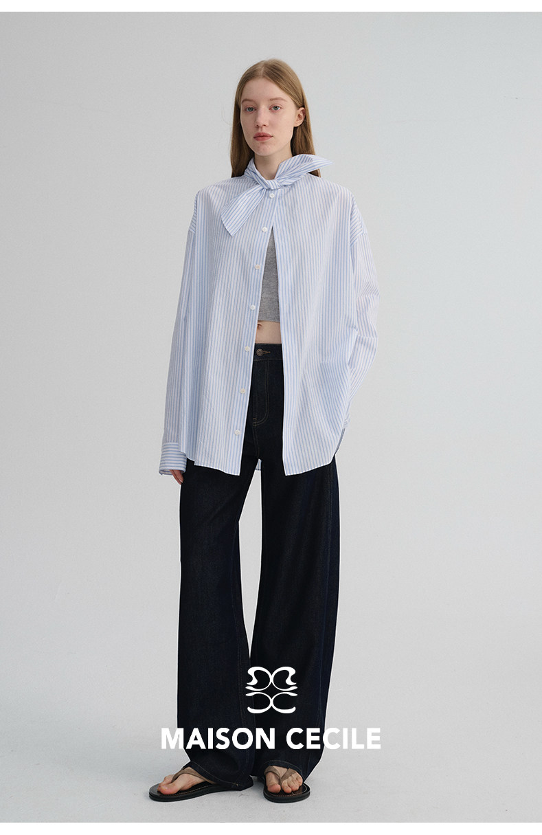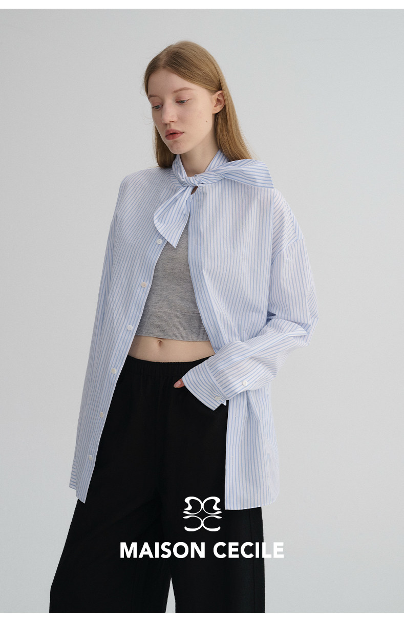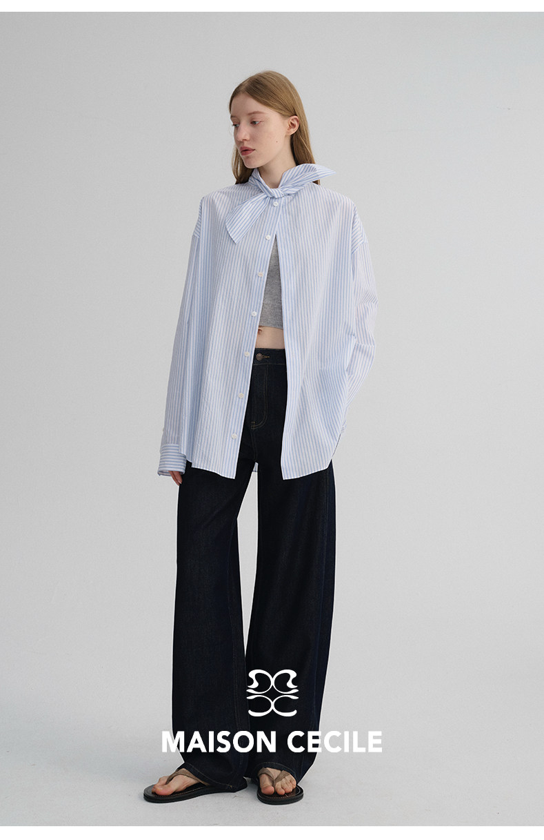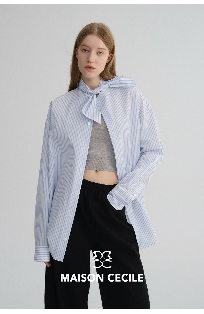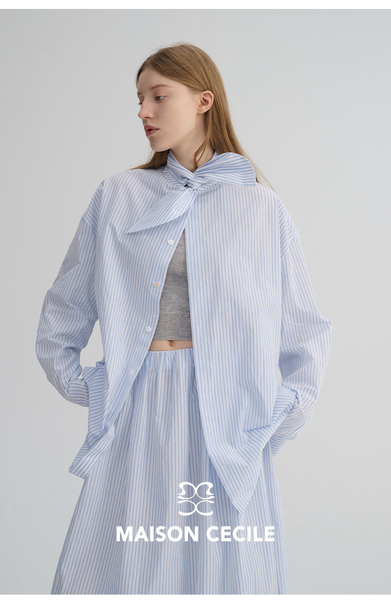MAISON CECILE 经典条纹美国匹马棉设计感兔耳朵领结宽松长袖衬衫