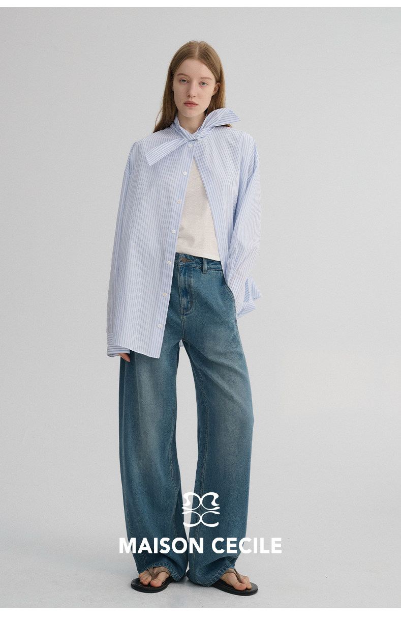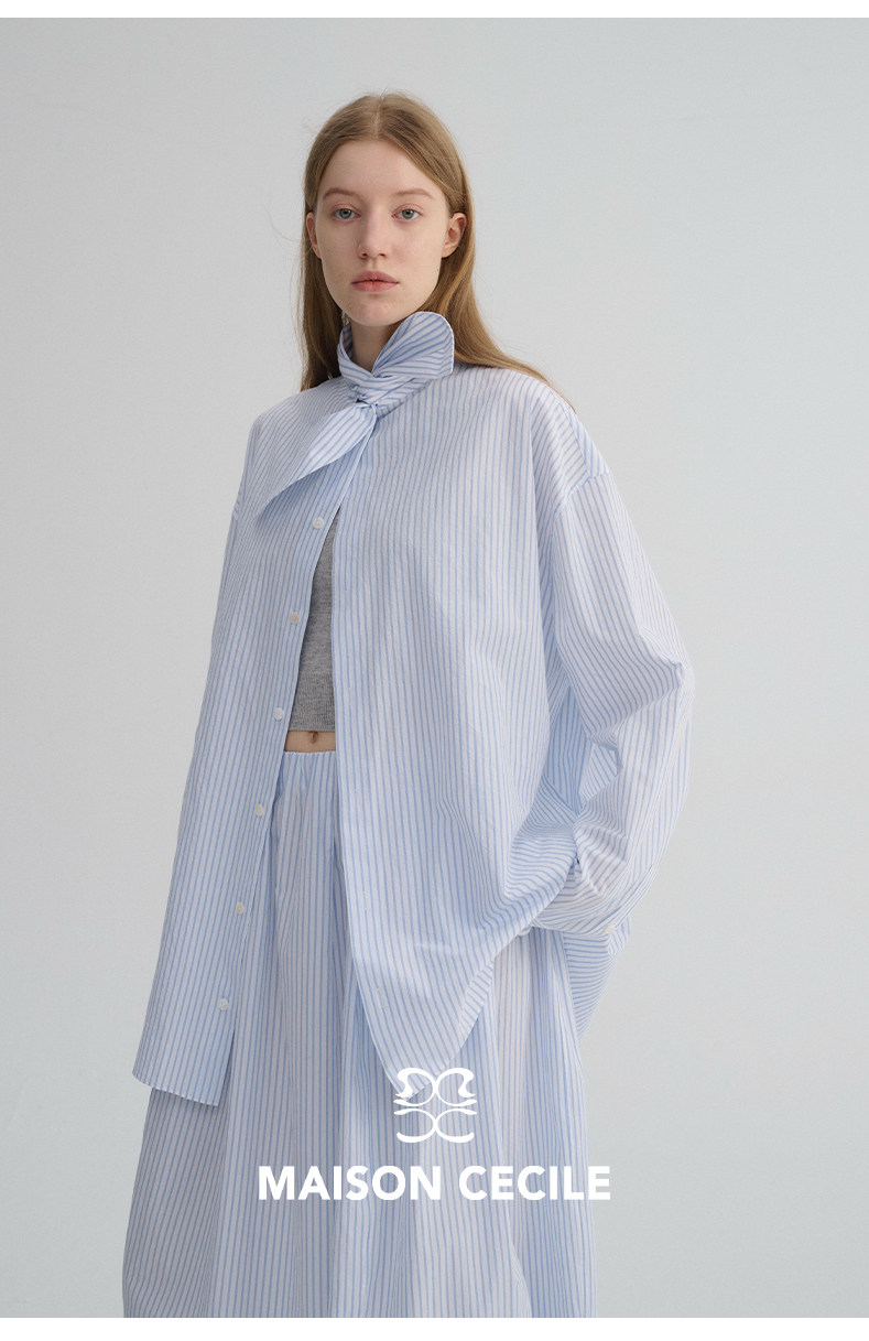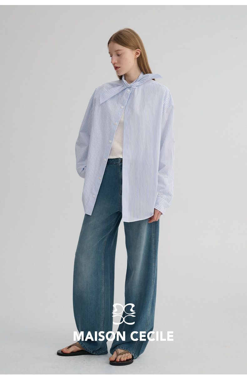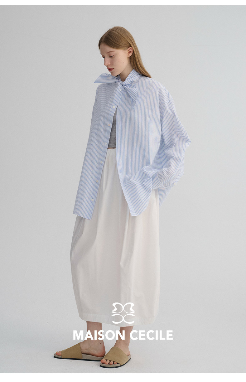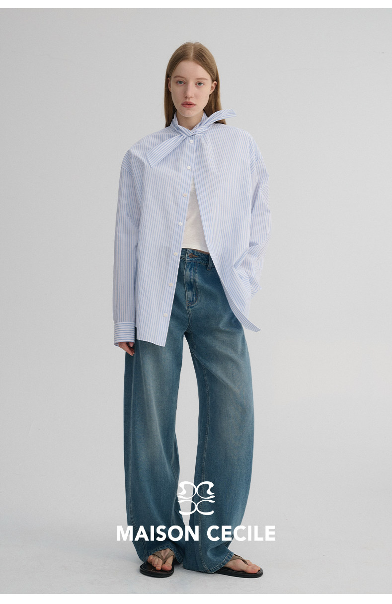 MAISON CECILE 经典条纹美国匹马棉设计感兔耳朵领结宽松长袖衬衫