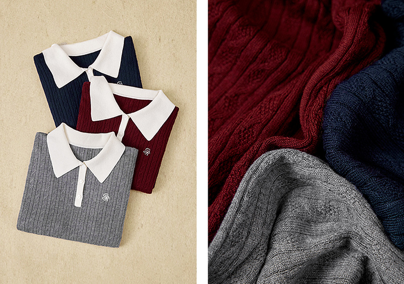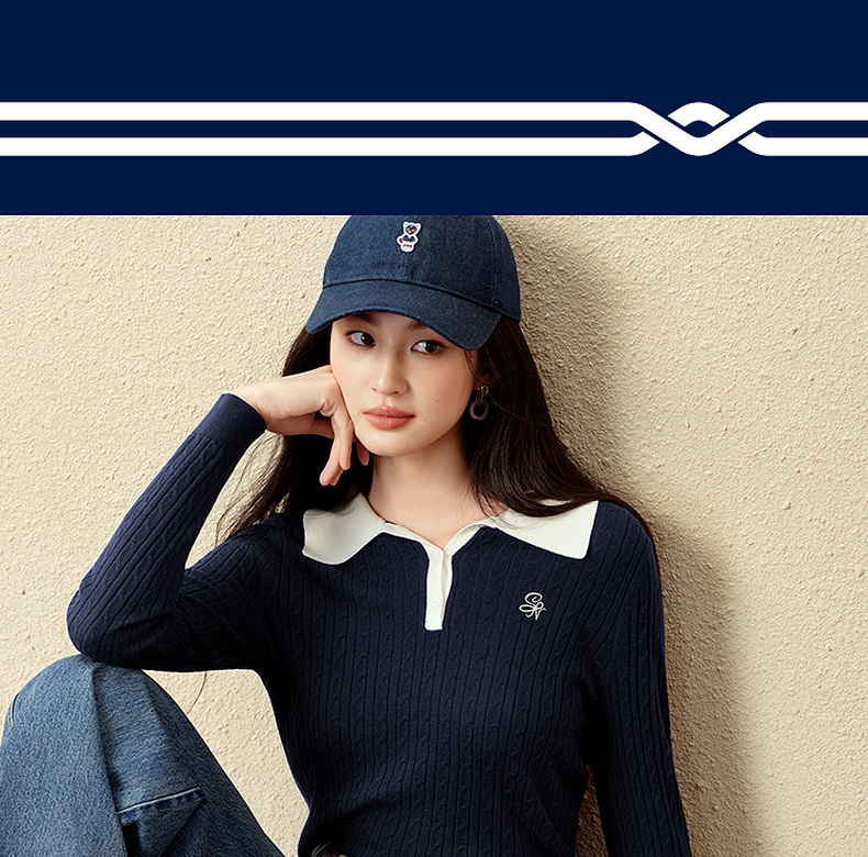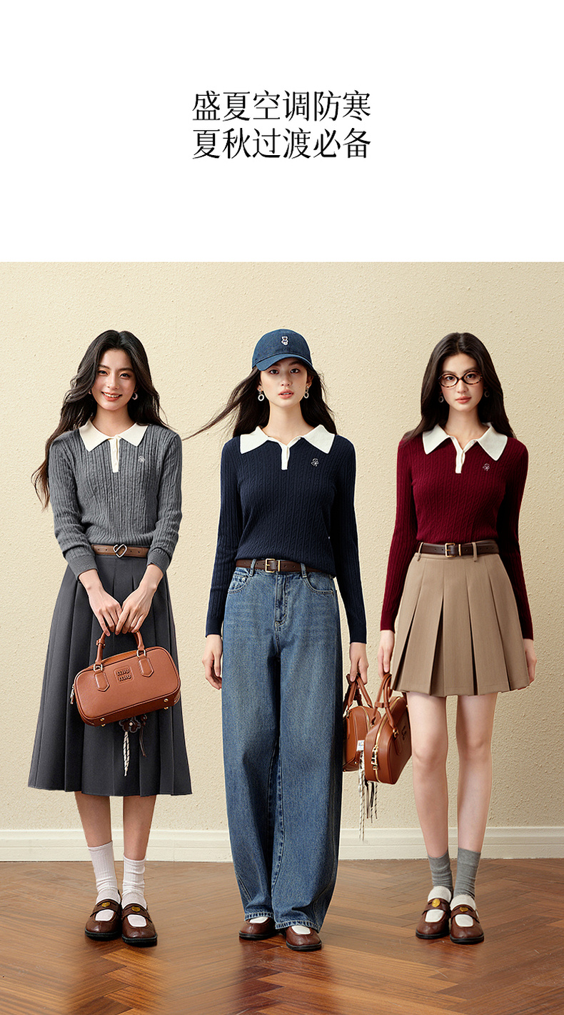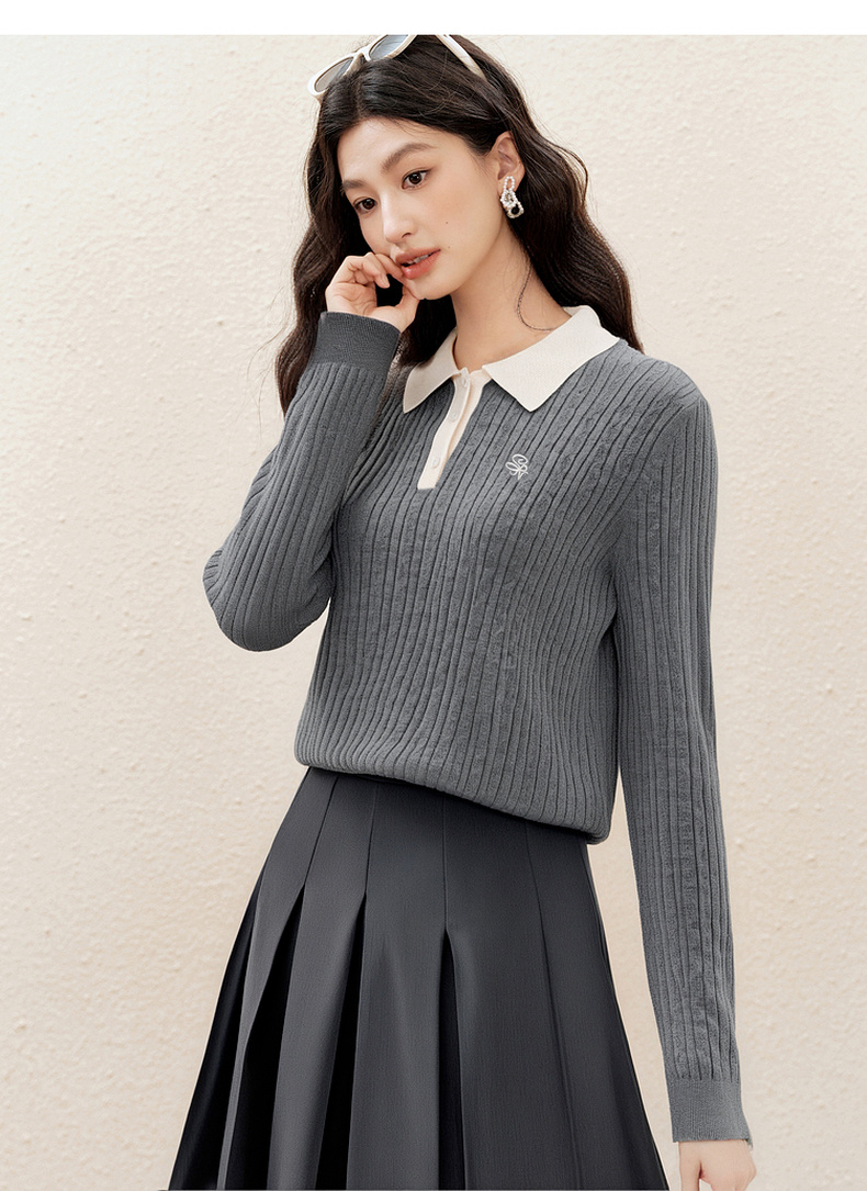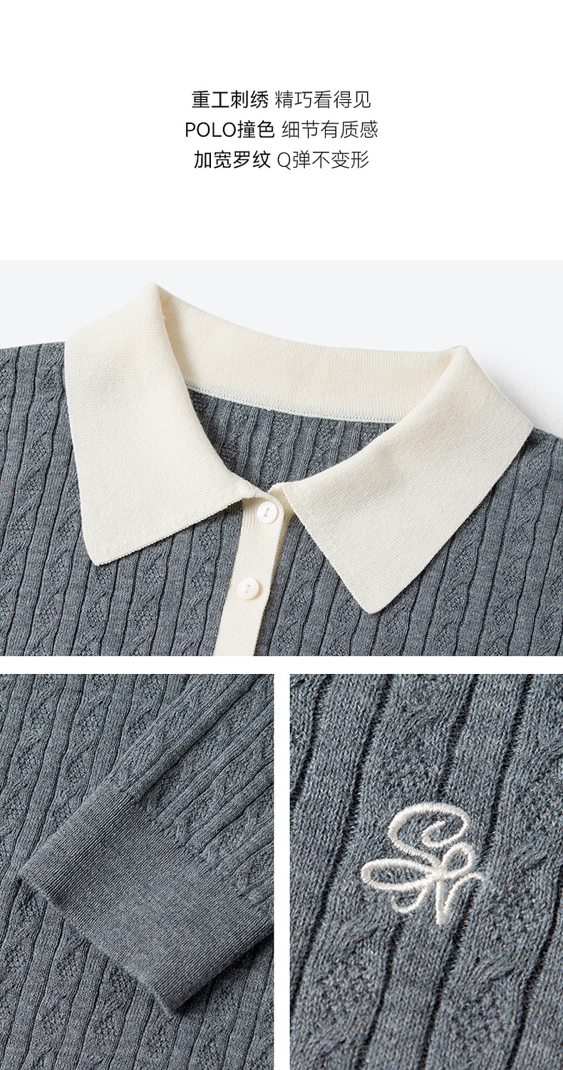 【严选】诗凡黎经典Polo领绞花针织衫2025秋新款修身显瘦休闲百搭长袖上衣7G7332181